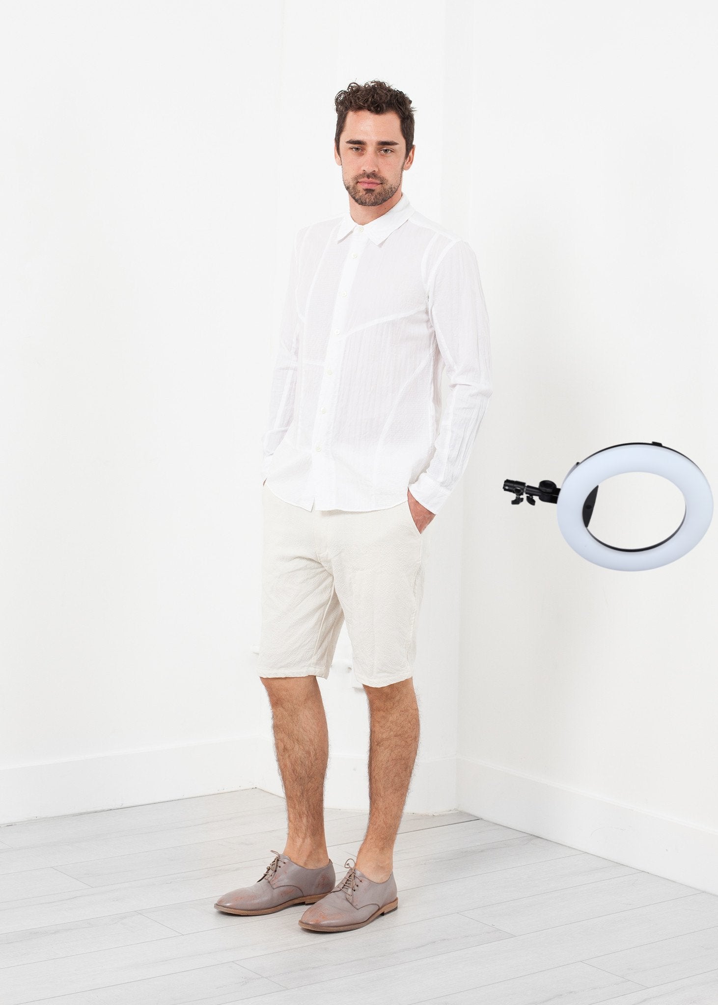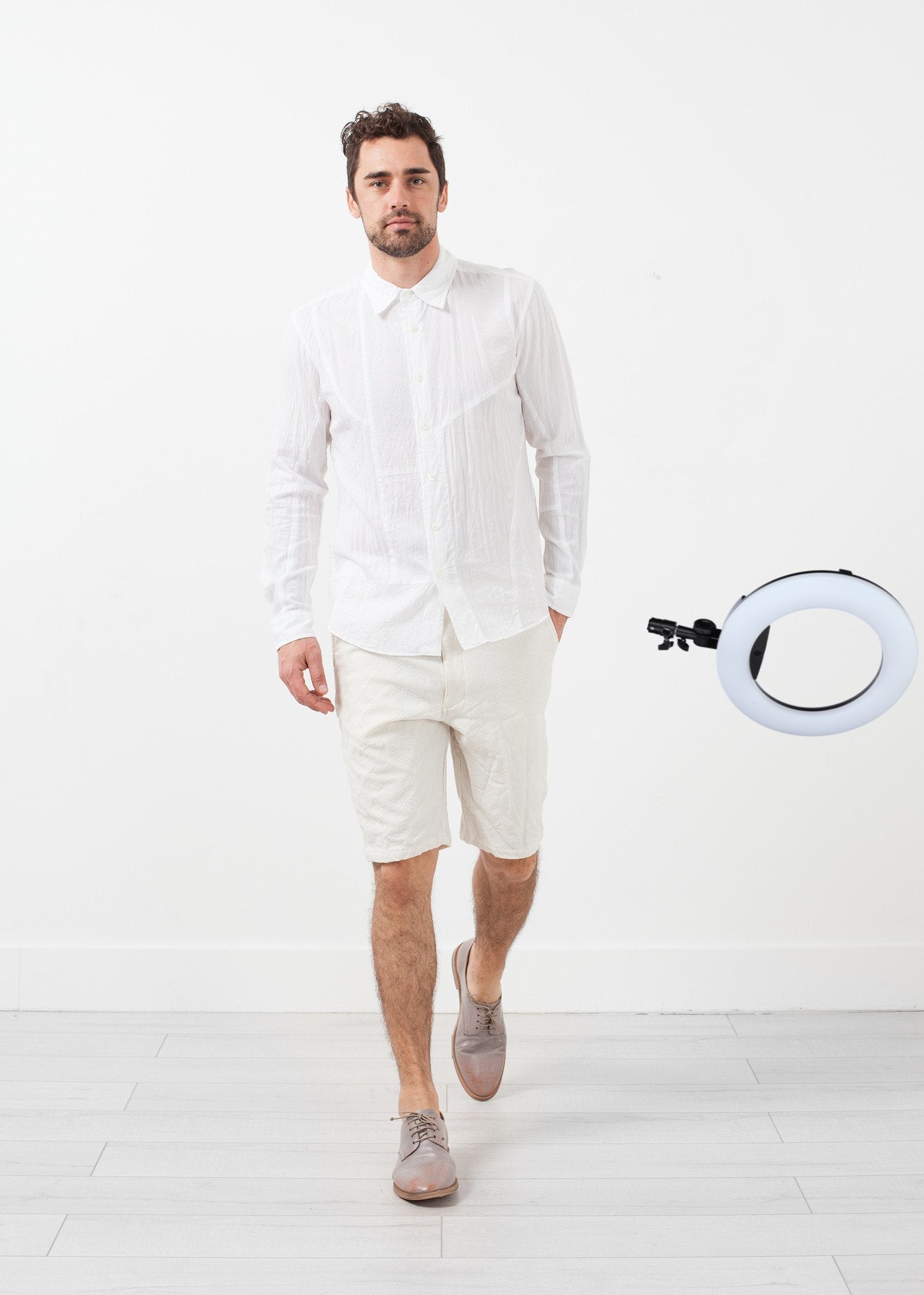 The Block Button Up from Sage de Cret acts as that staple top with uniqueness in the texture. Button placket closure at front. Color White. 60% Cotton, 40% Tencel. Made in Japan. Jacob is wearing a Large.