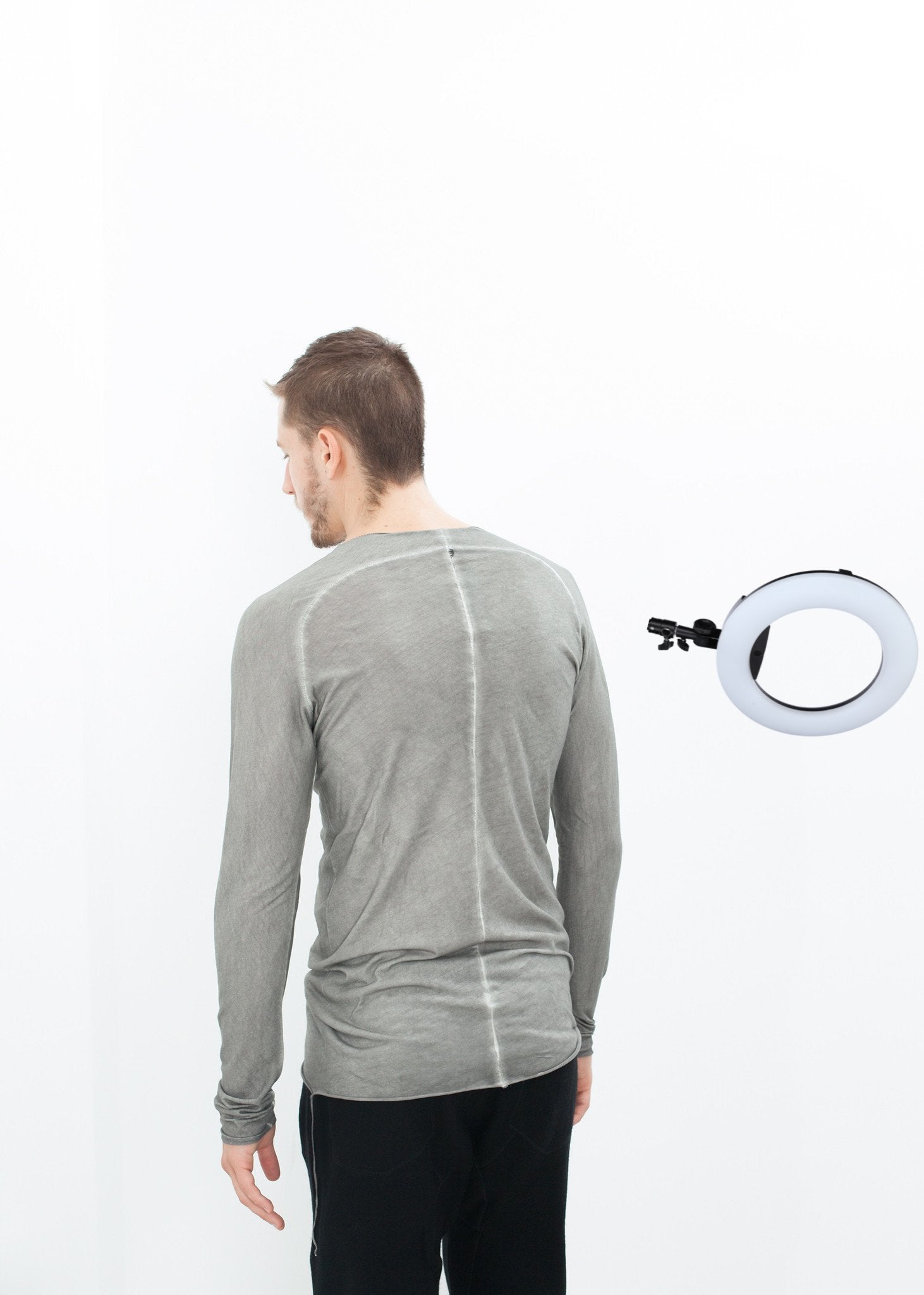 A long sleeved tissue tee featuring obscure artistry. Exposed seaming and unfinished edges gives this tee a worn effect. BLK OPM. Color Taupe. 100% Cotton. Matt is wearing a size Medium. Matt is 6’2”, Chest 38”, Waist 31”, Inseam 34.5”.