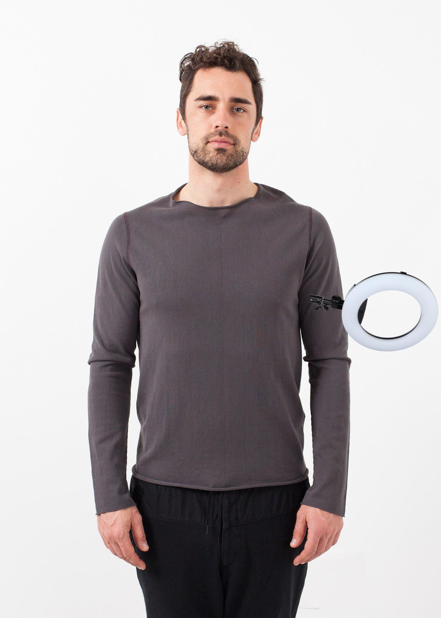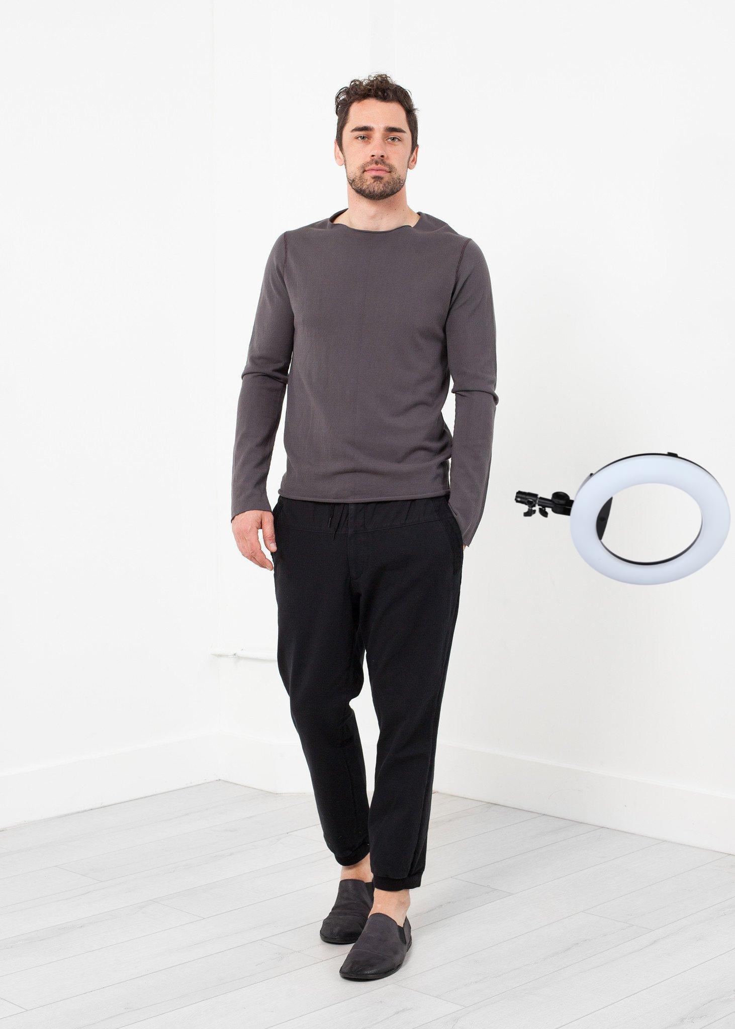 The Argon Sweater by Hannes Roether offers a lightweight, layer able piece for spring. Raw hems. Soft standup collar. Color Phantom. 100% Cotton. Made in Portugal. Jacob is wearing a Medium.