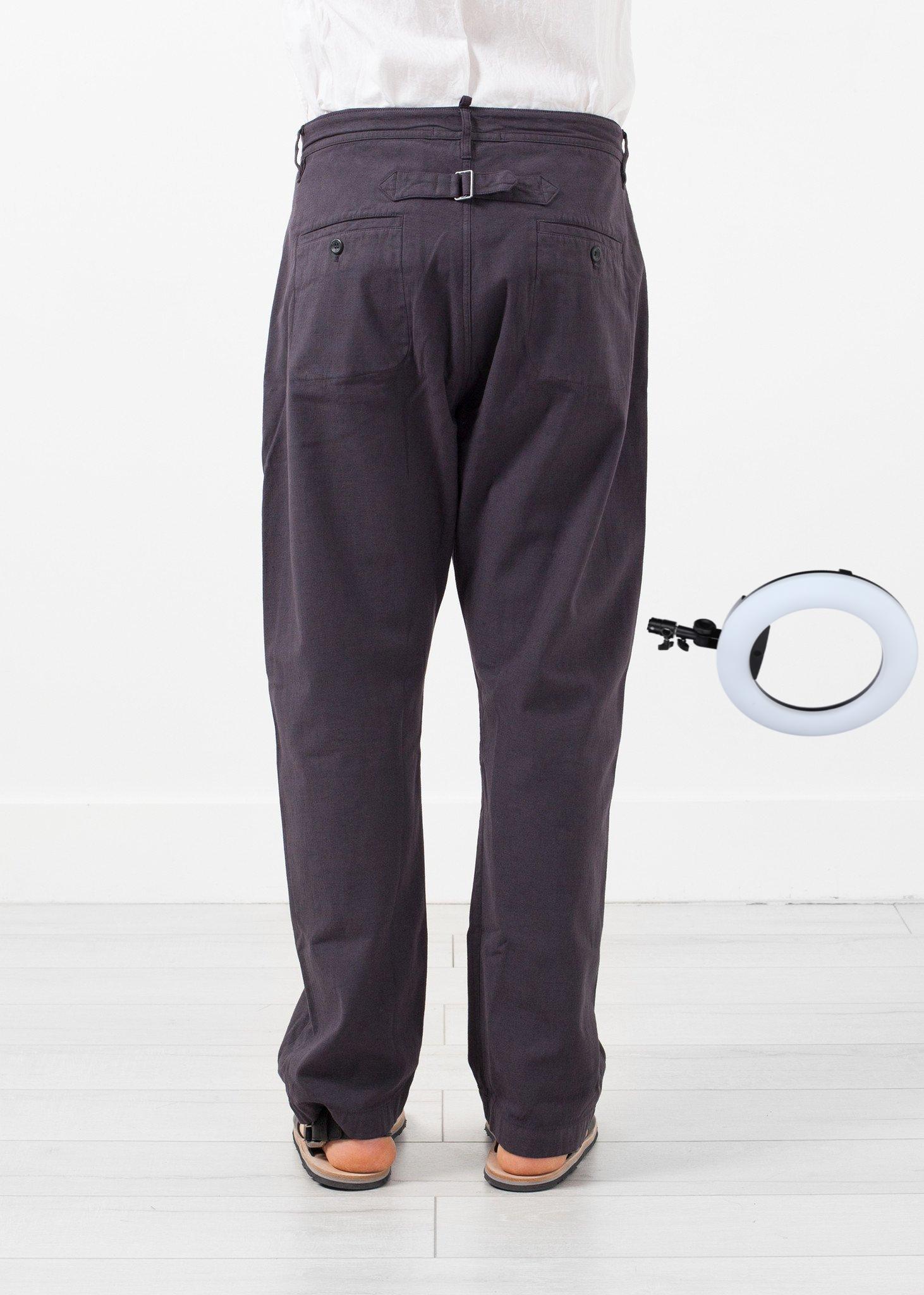With just enough room to be "oversized," the Balda Pant from Hannes Roether makes functional comfort its priority. Back waist tie for adjustability. Drop crotch. Color Phantom. 100% Cotton. Made in the EU. Jacob is wearing a Medium.