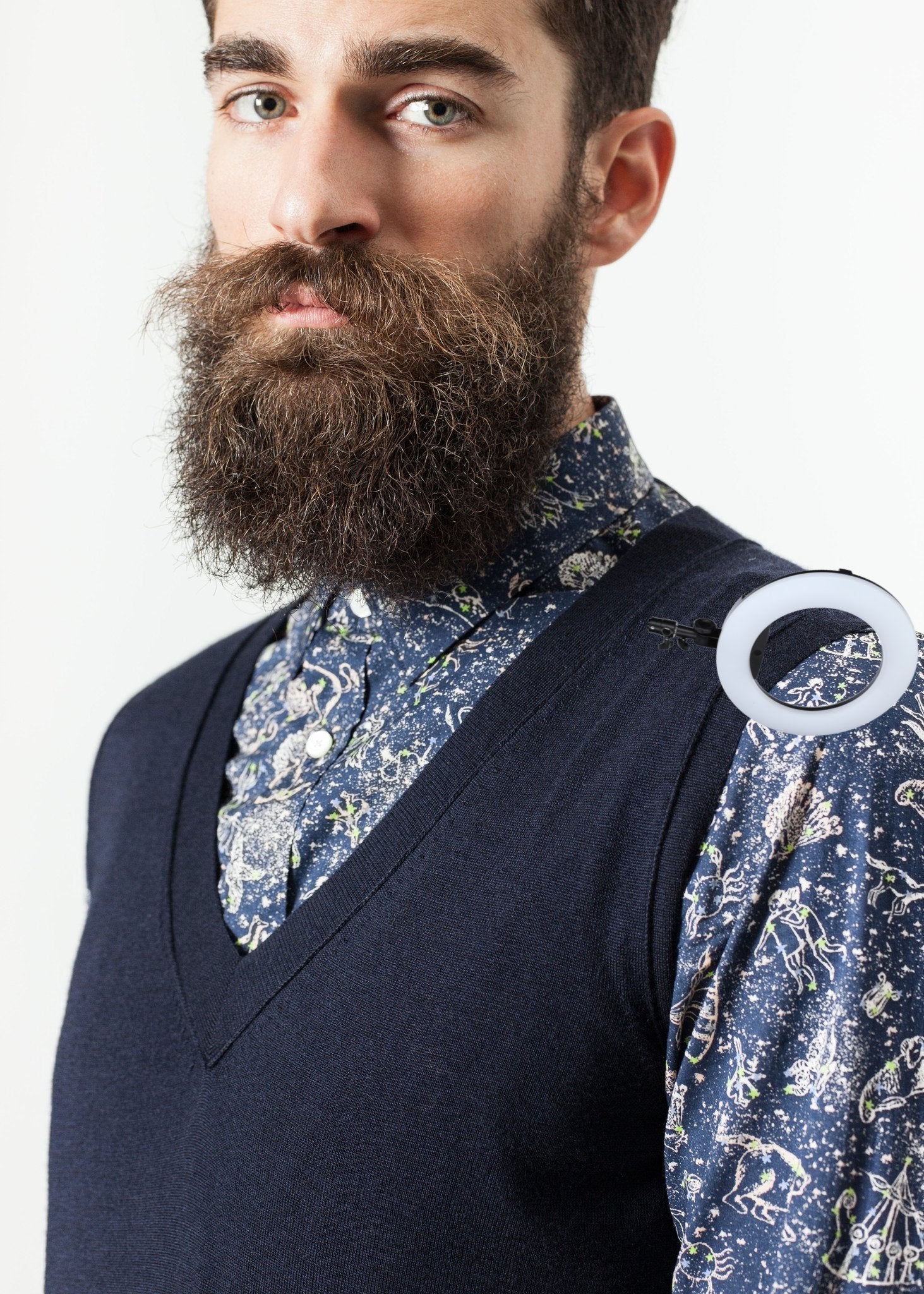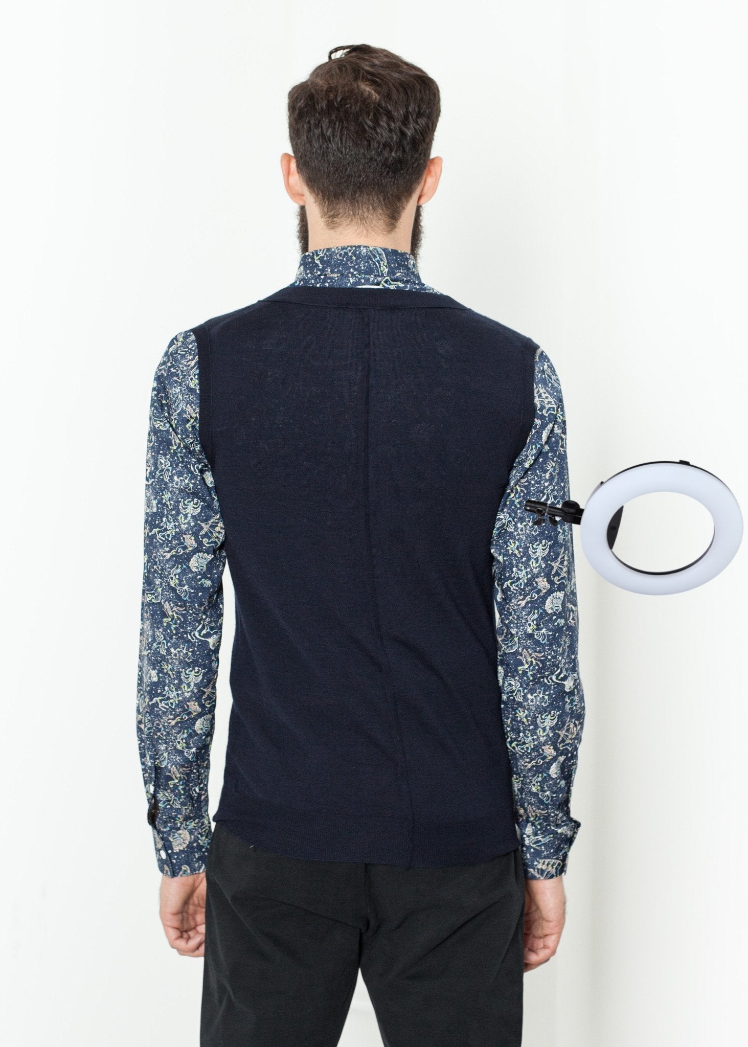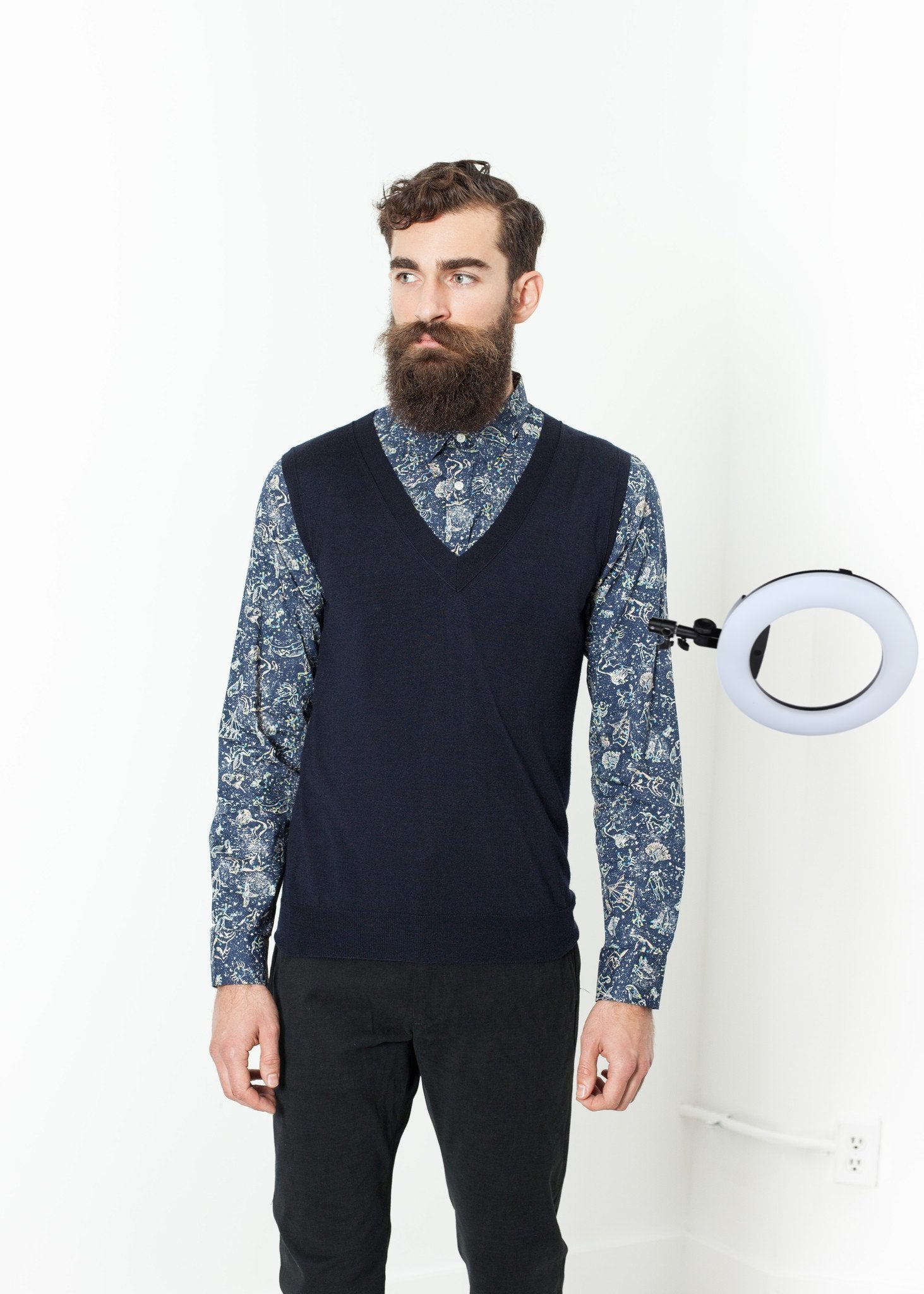 A lightweight sleeveless v-neck sweater with raised back seam is designed to keep your look simple and classic. Perfect accompaniment to a robust jacket or blazer. Color Navy. 50% Wool, 30% Silk. Made in Italy. Addis is wearing an Italian 50. Addis is 6’2”, Chest 38.5”, Waist 31”, Inseam 32”.