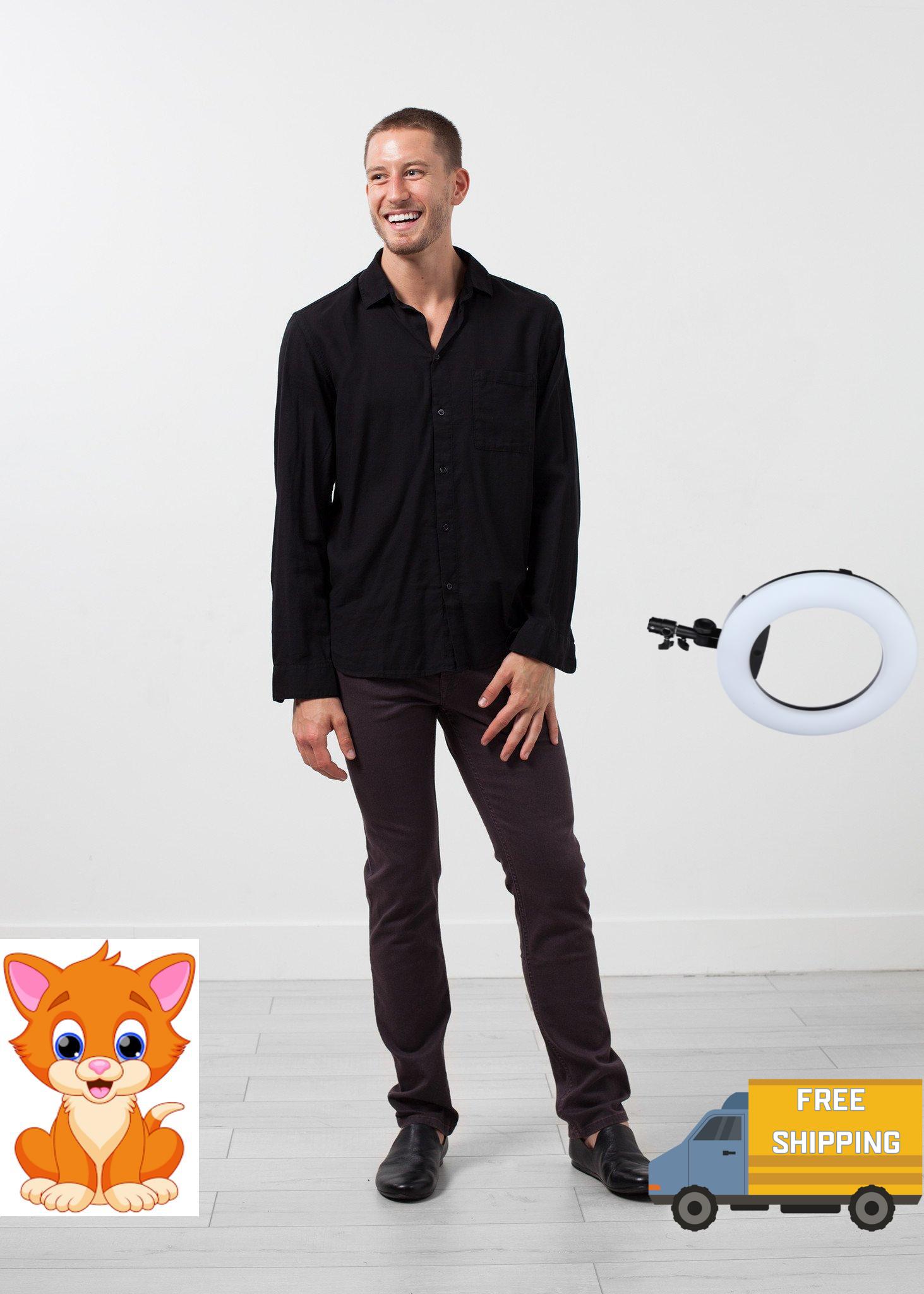 Luscious hand for optimal comfort. Breast pocket. Button closure at front. Hansen. Color Black. 100% Cotton. Made in EU. Matt is wearing a size Medium. Matt is 6’2”, Chest 38”, Waist 31”, Inseam 34.5”.