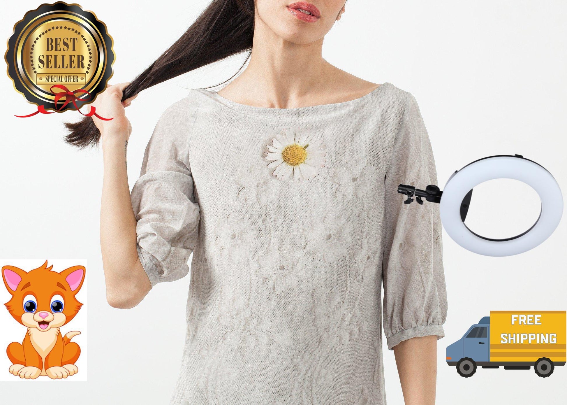 The designs of Antoni & Alison are a melange of trompe l'oeil digital imagery printed on fine silks, rendering a specified aesthetic that defines the brand and culls a dedicated clientele. The Daisy delights with its subtle textural printing and details. Flowing peasant sleeves. Wide boat neckline. Lining. Color Grey. 100% Silk. Made in the U.K. Ashley is wearing a Size 8.