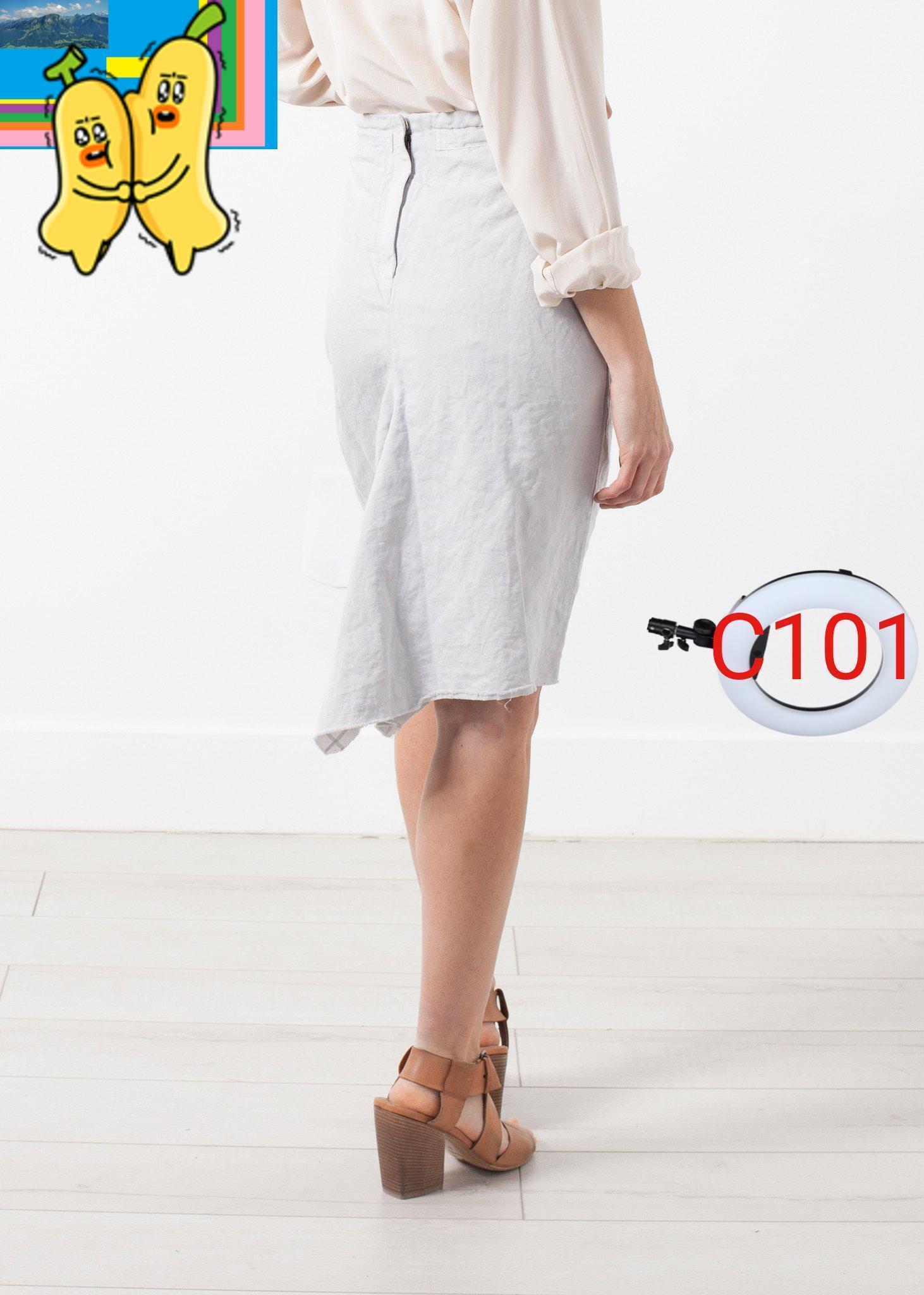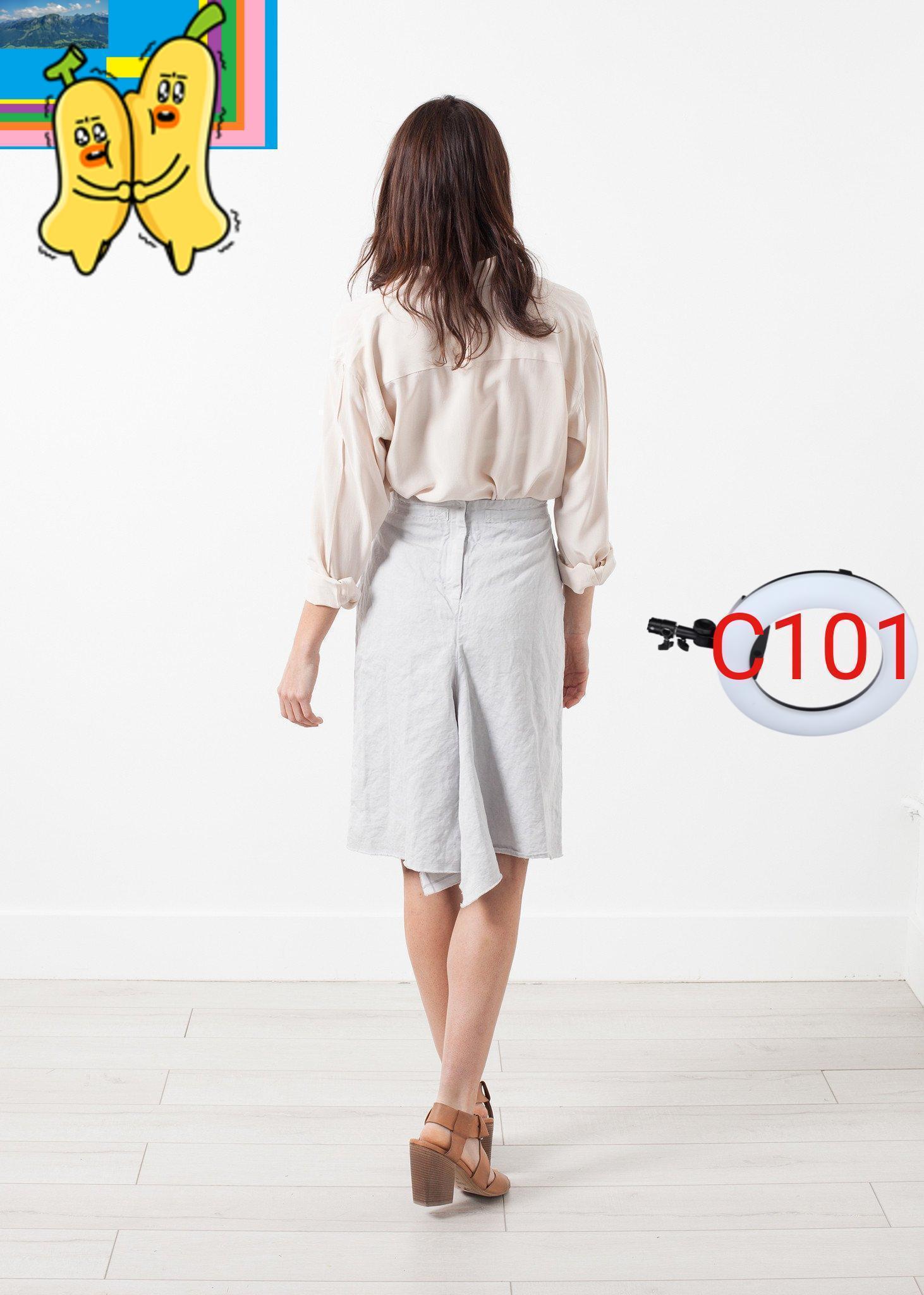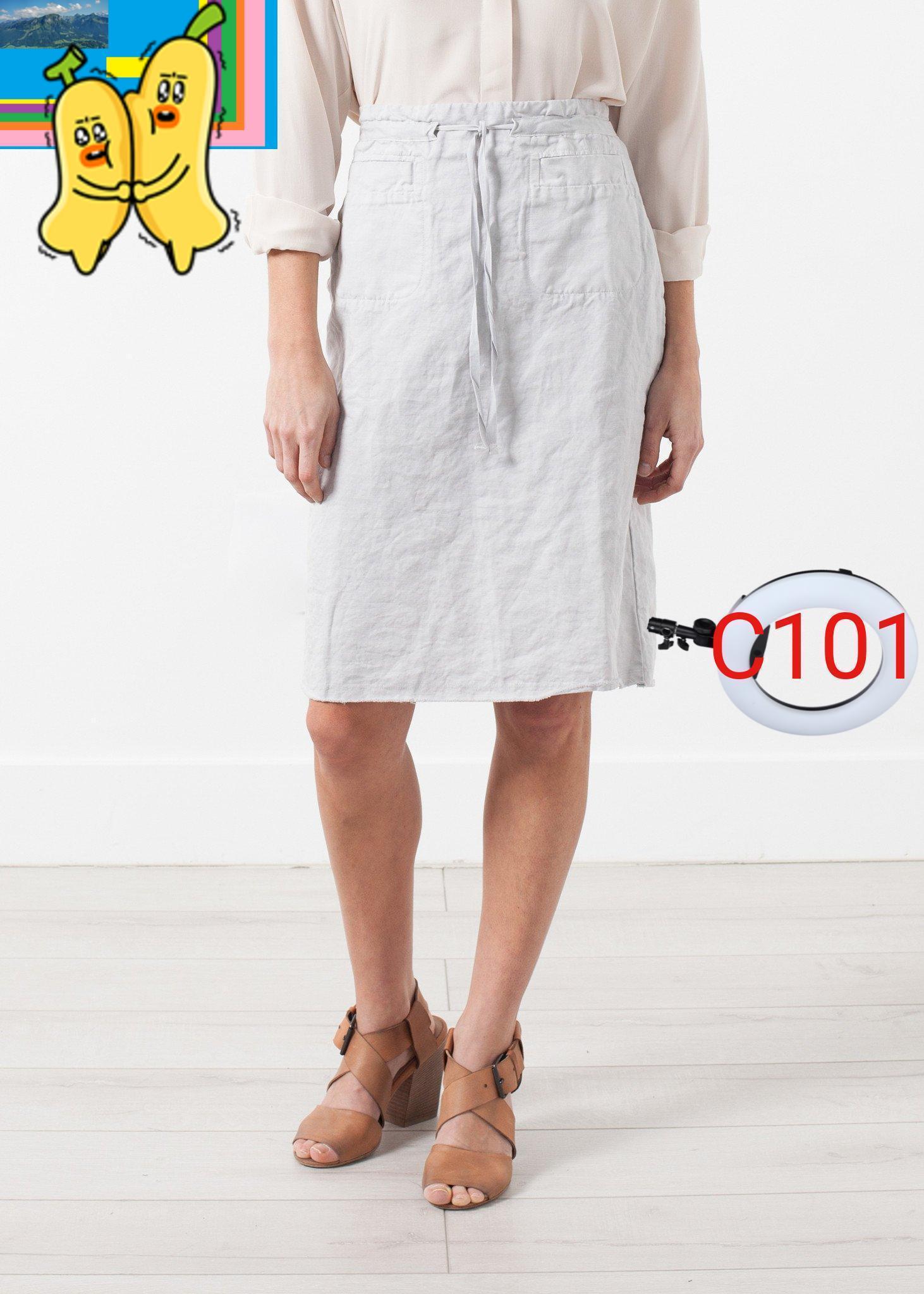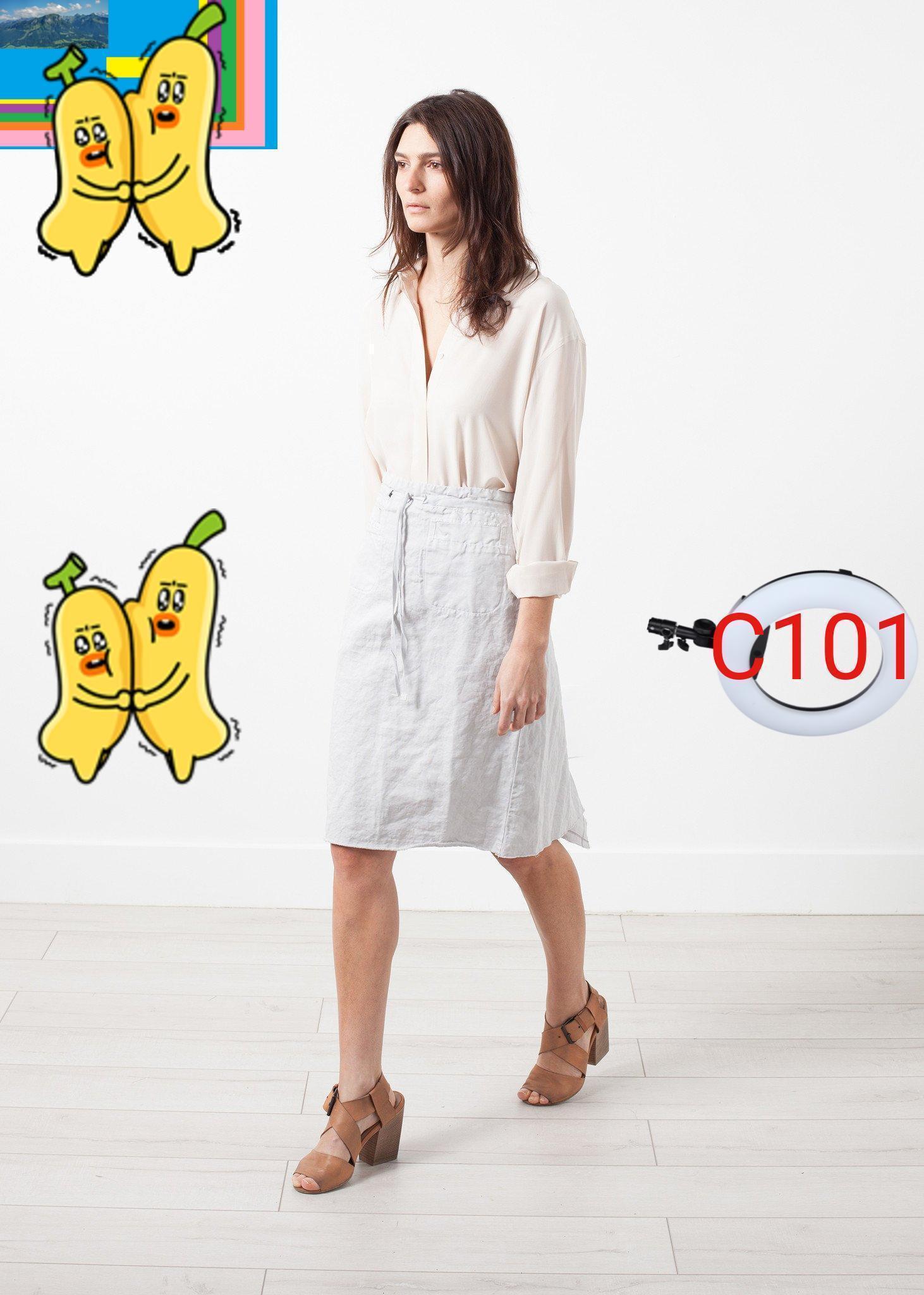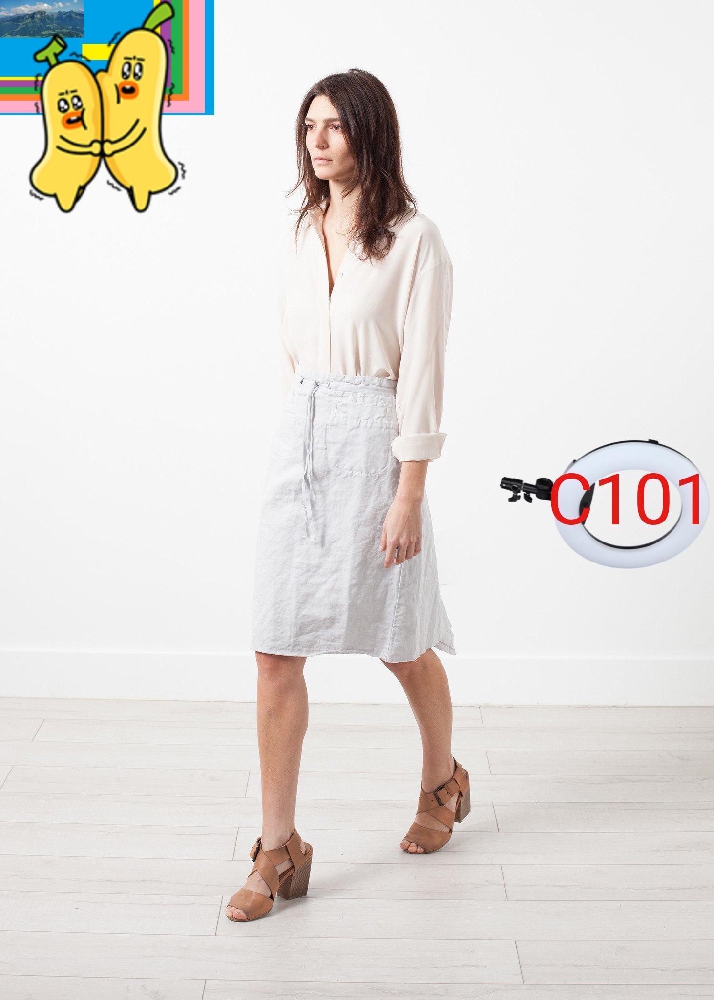 The Double Pocket Skirt is a fantastic travel staple with its linen structure and cotton comfort. Slightly flared at hem, knee length. Front bucket pockets and drawstring waistband. Single snap button closer with zip fly at center back. Kristensen du Nord. Color Pearl. 53% Cotton, 47% Linen, Pockets 100% Cotton. Made in Italy. Lana is wearing a Size 1.