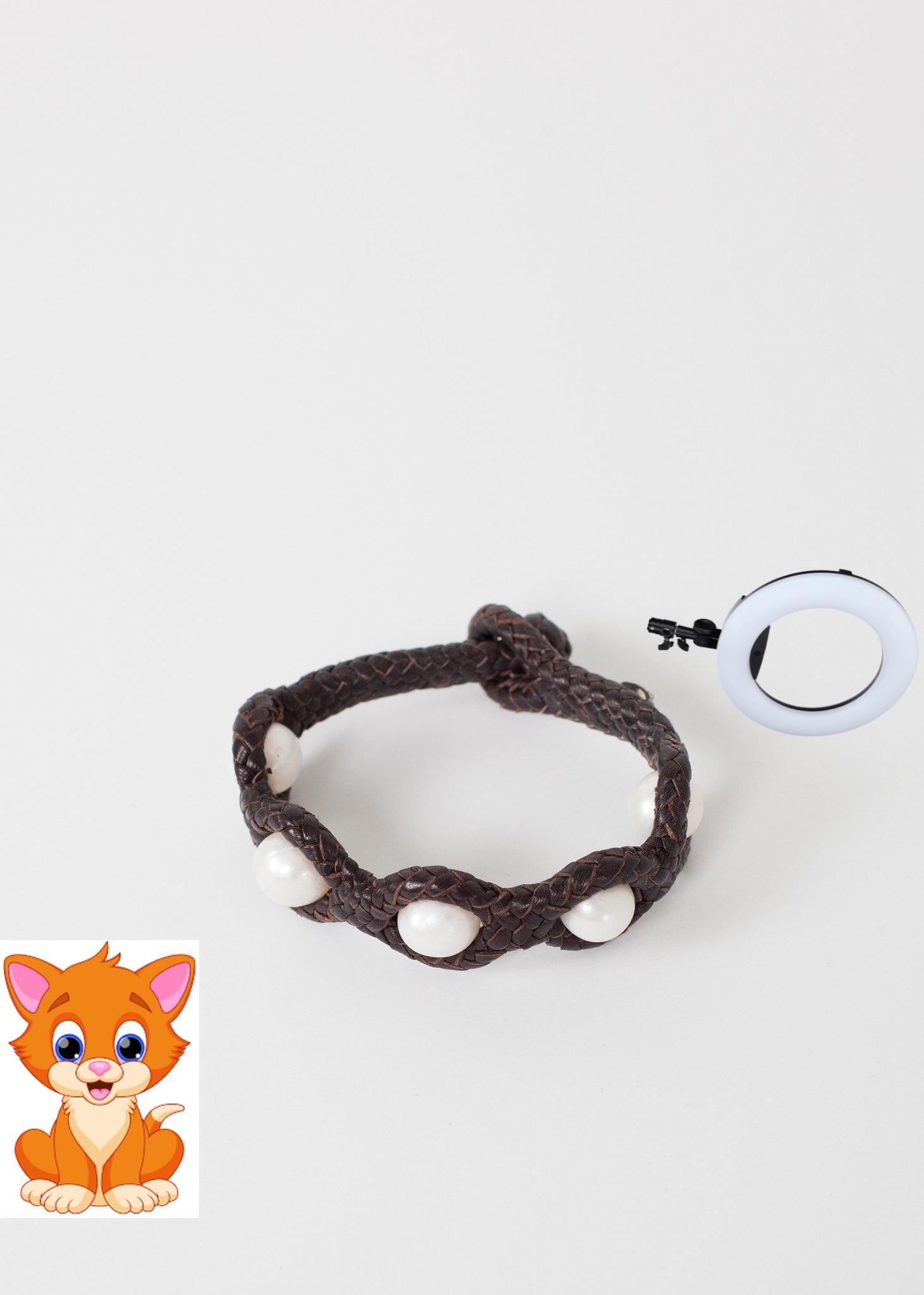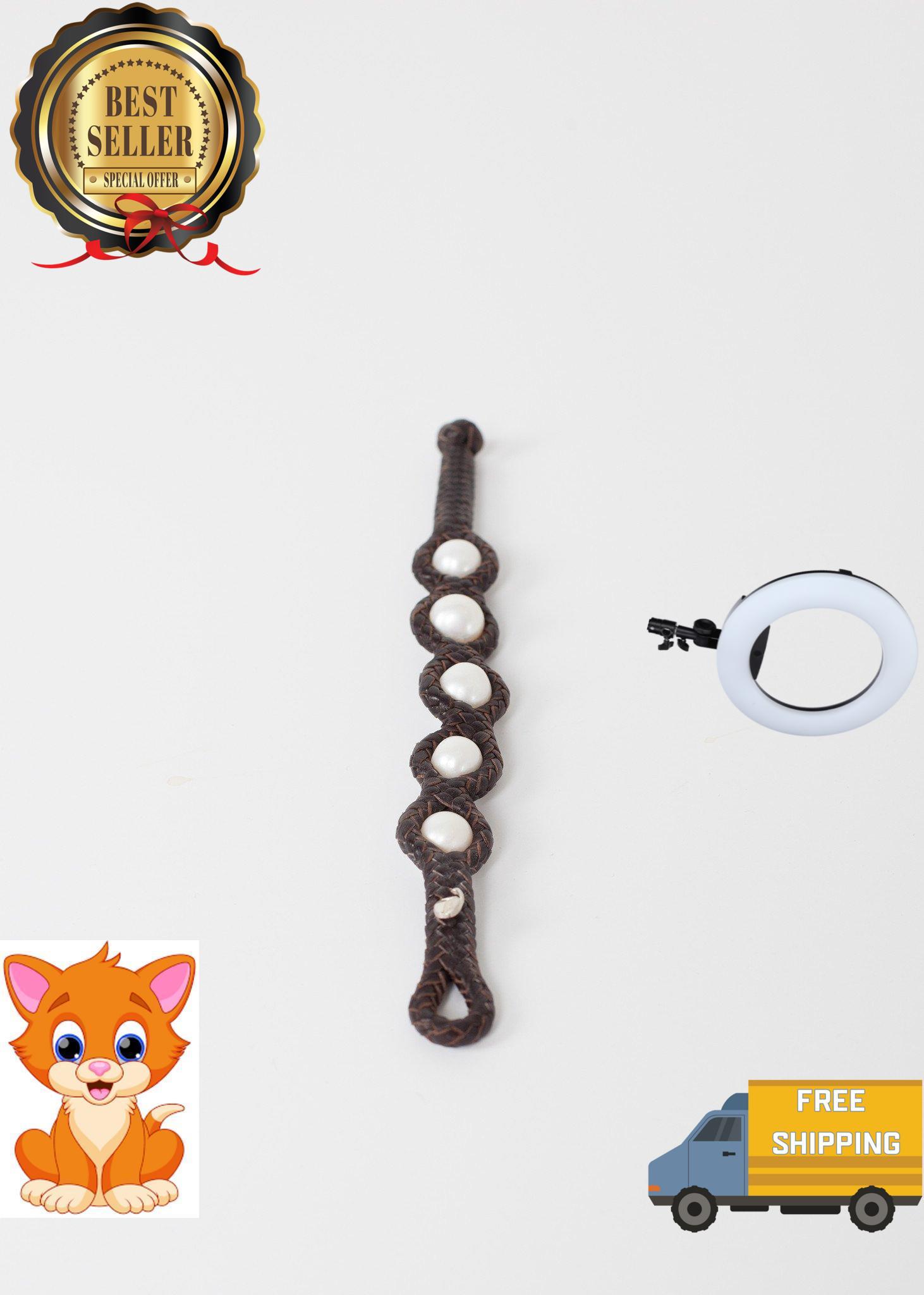 Kalosoma Jewelry demonstrates the rigorous beauty in the handmade. Five freshwater pearls nested delectable braided band. Scarab detail. Knotted closure. Color Brown. 100% Leather. Made in Mexico. Length 7 1/2 inches.
