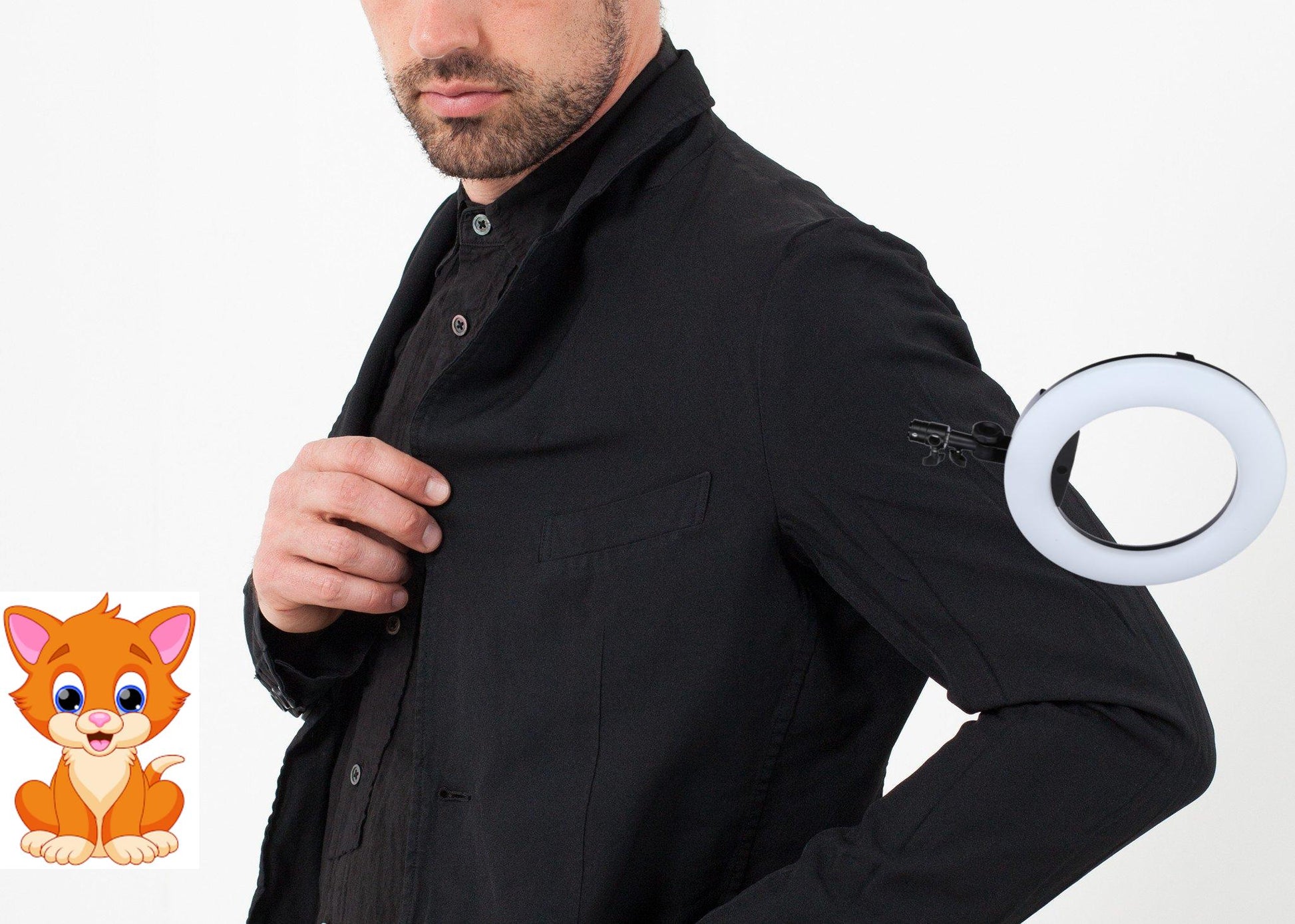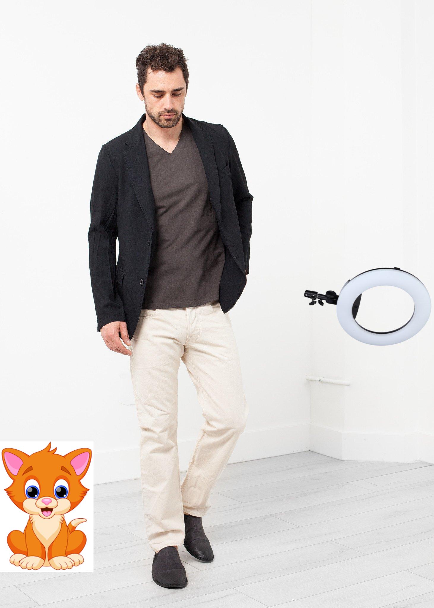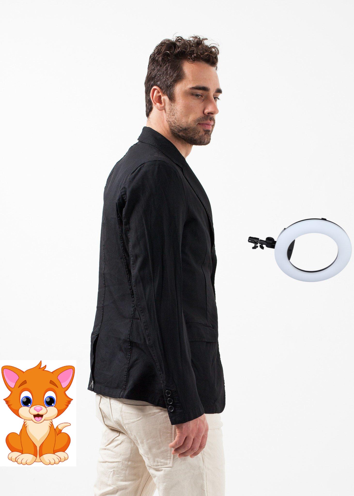 The Sharp Blazer finishes cleanly with stretch in the body. Two button closure at front. Lining. Three exterior pockets at front. Sage de Cret. Color Black. 100% Polyester. Made in Japan. Jacob is wearing a Large.