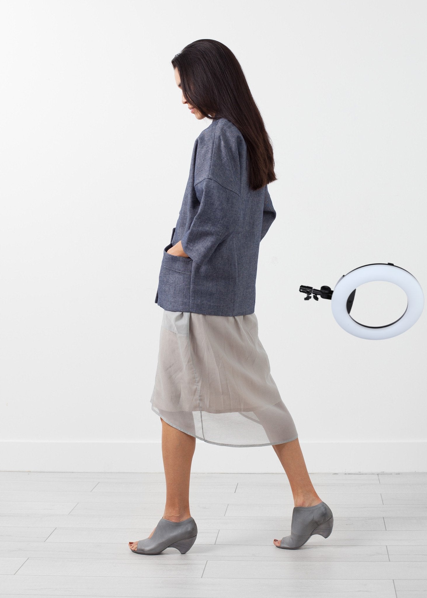 Reminiscent of the Japanese Kimono, the Jogori Jacket demonstrates structural elegance and artistry. 3/4 inch sleeves. Mandarin collar. Double snap button closure at front. Two exterior pockets at front. Schai. Color Ink Denim. 65% Cotton, 35% Linen. Made in U.S.A. Ashley is wearing an X-Small.