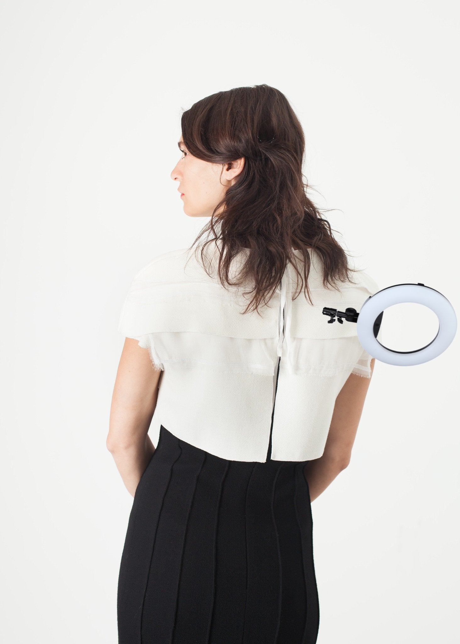 Hand crafted from concept to finished product, this Columbian label is authentically kind and creative. Distinctive layering cape of silk and crepe wool with caped sleeves. Tie and zip closure with back paneling. Amelia Toro. Color Cream/Black. 100% Crepe Wool Body, 100% Silk Bodice. Made in Columbia. Lana is wearing a Size 2.