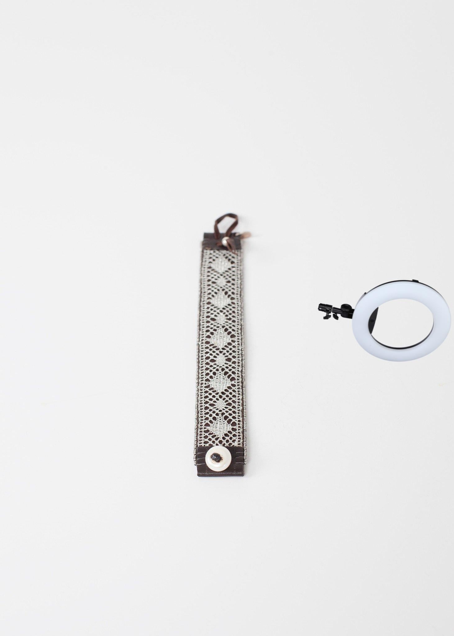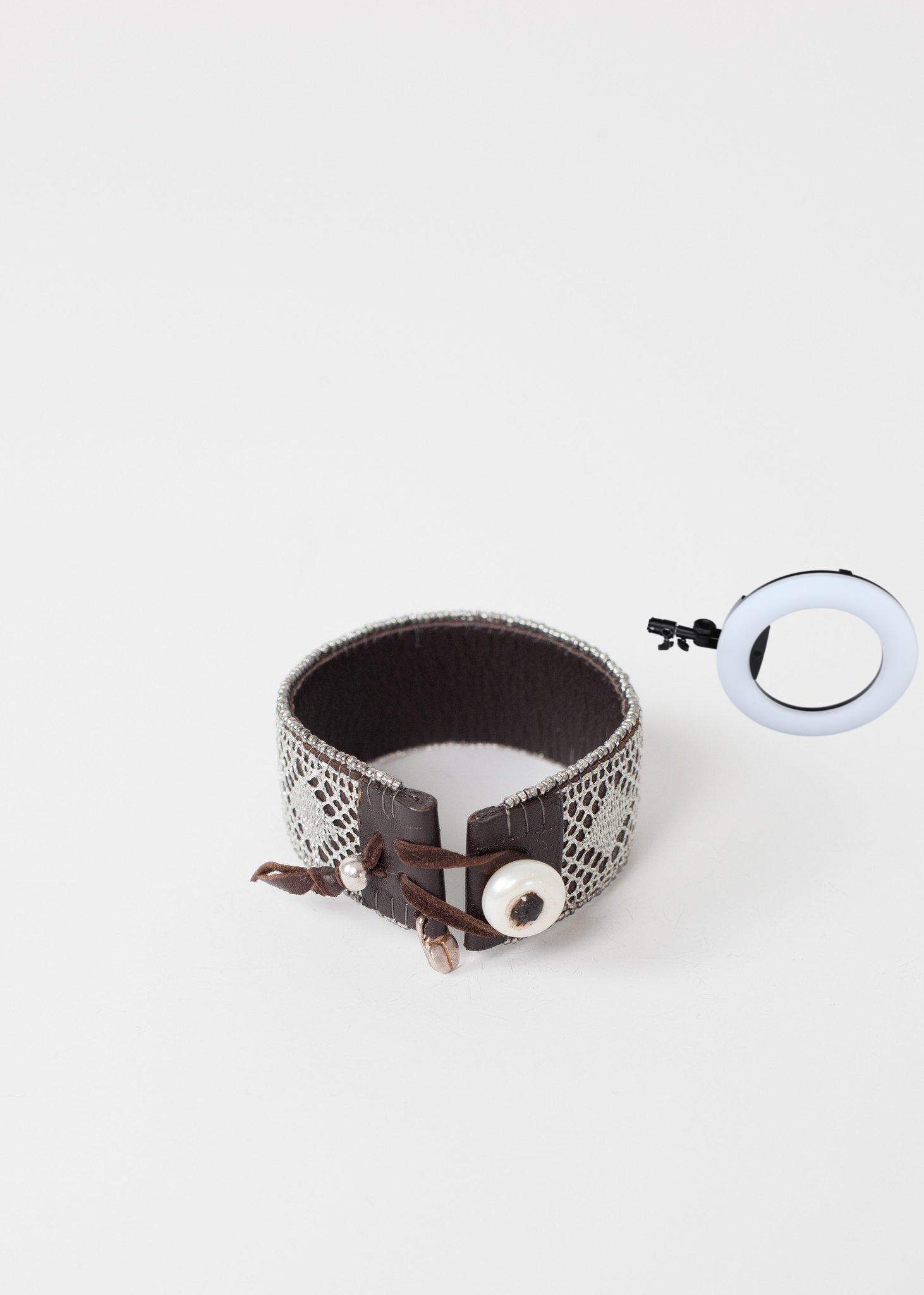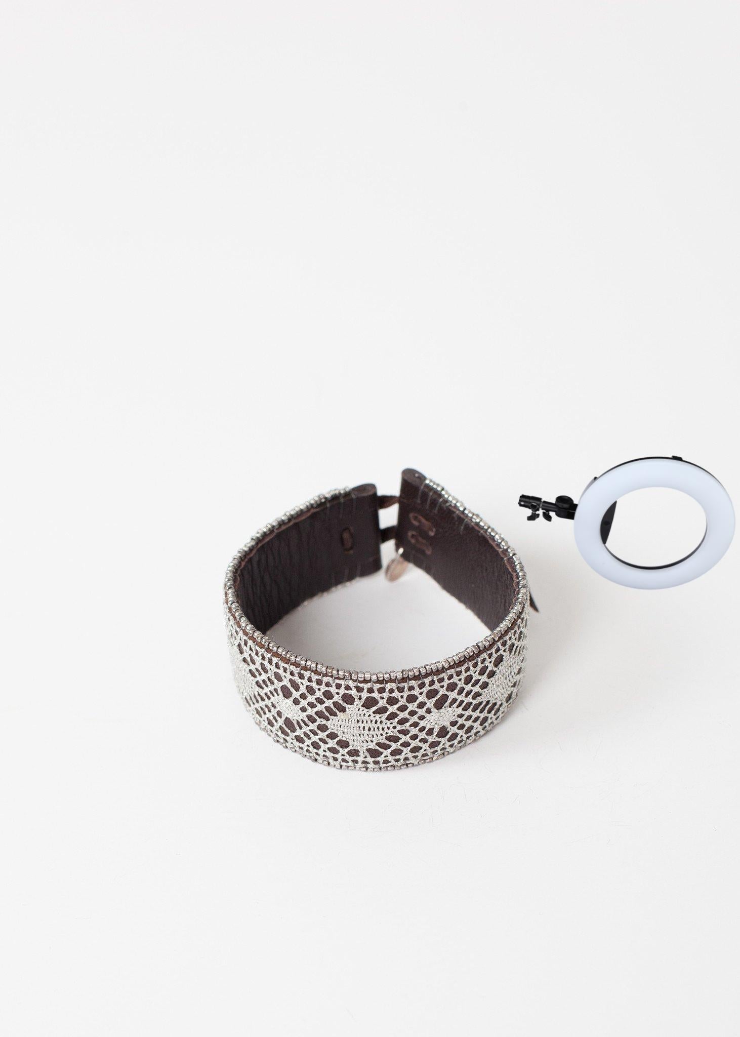 Kalosoma Jewelry demonstrates the rigorous beauty in the handmade. Gracefully woven lace embraces your wrist with leather finishings. Scarab detail. Pearl closure. Color Silver 100% Leather. Made in Mexico. Length 7 inches.