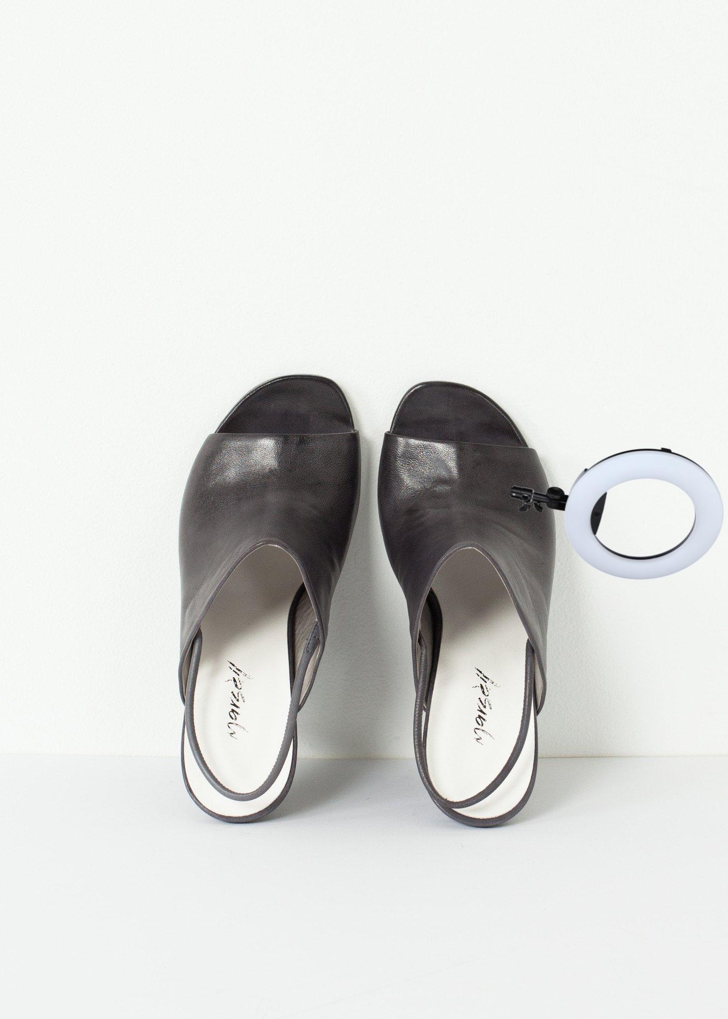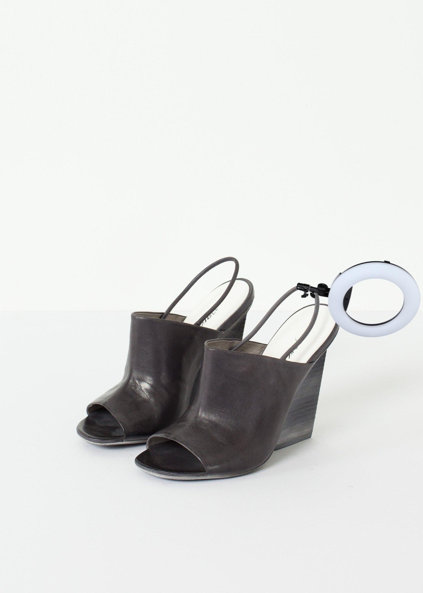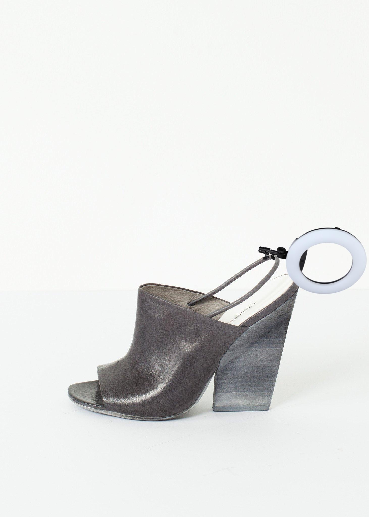 Married aesthetics of innovation and tradition, Marséll crafts shoes of mastering technique. Where modern classism takes wearable shape, anticipate artistic expression epitomized in leather footwear. The Mantello acts as the perfect wedge, heel, and summer slingback. Open toed with a comfortable elastic strap make this shoe an excellent luxury. Color Lead. 100% Leather. Made in Italy.