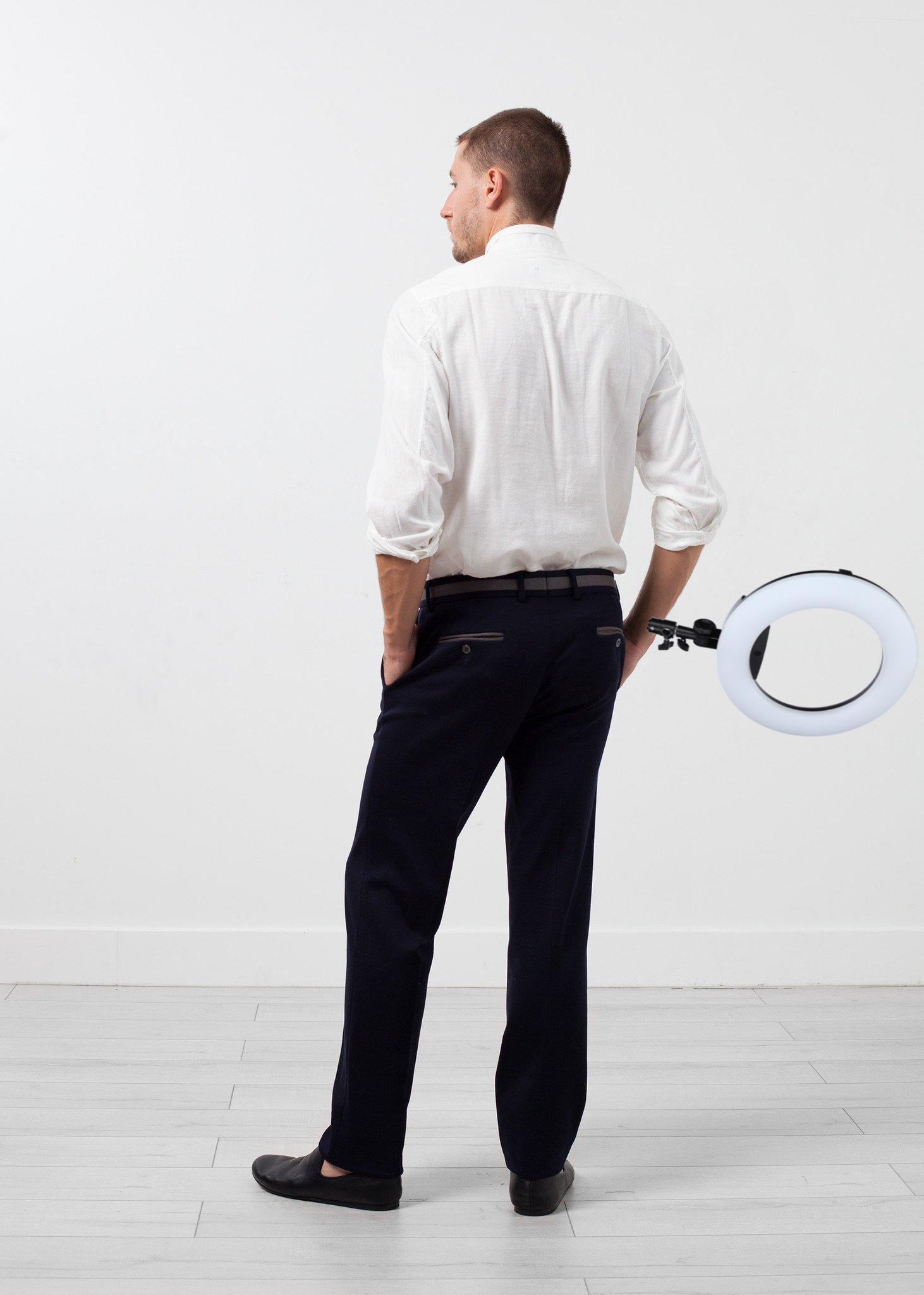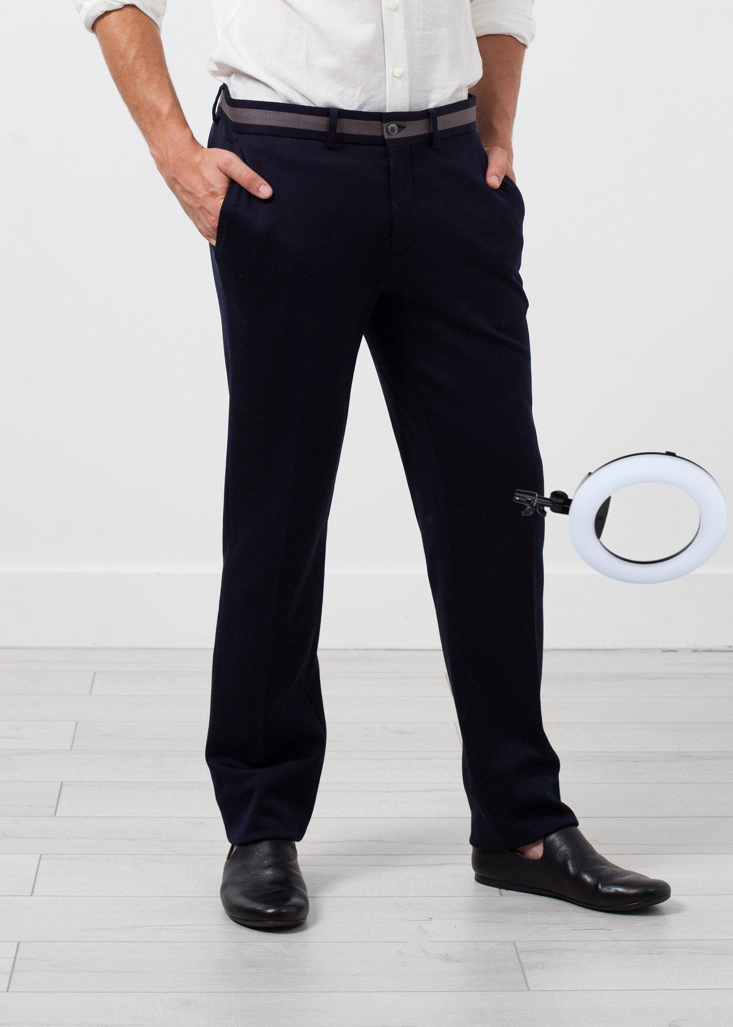 The McKile Trouser's brilliance is all in the details. Single button closure with zip fly at front. Four exterior pockets at front. Circle of Gentlemen. Color Navy. 92% Cotton, 8% Polyamide. Made in Portugal. Matt is wearing a size Medium. Matt is 6’2”, Chest 38”, Waist 31”, Inseam 34.5”.