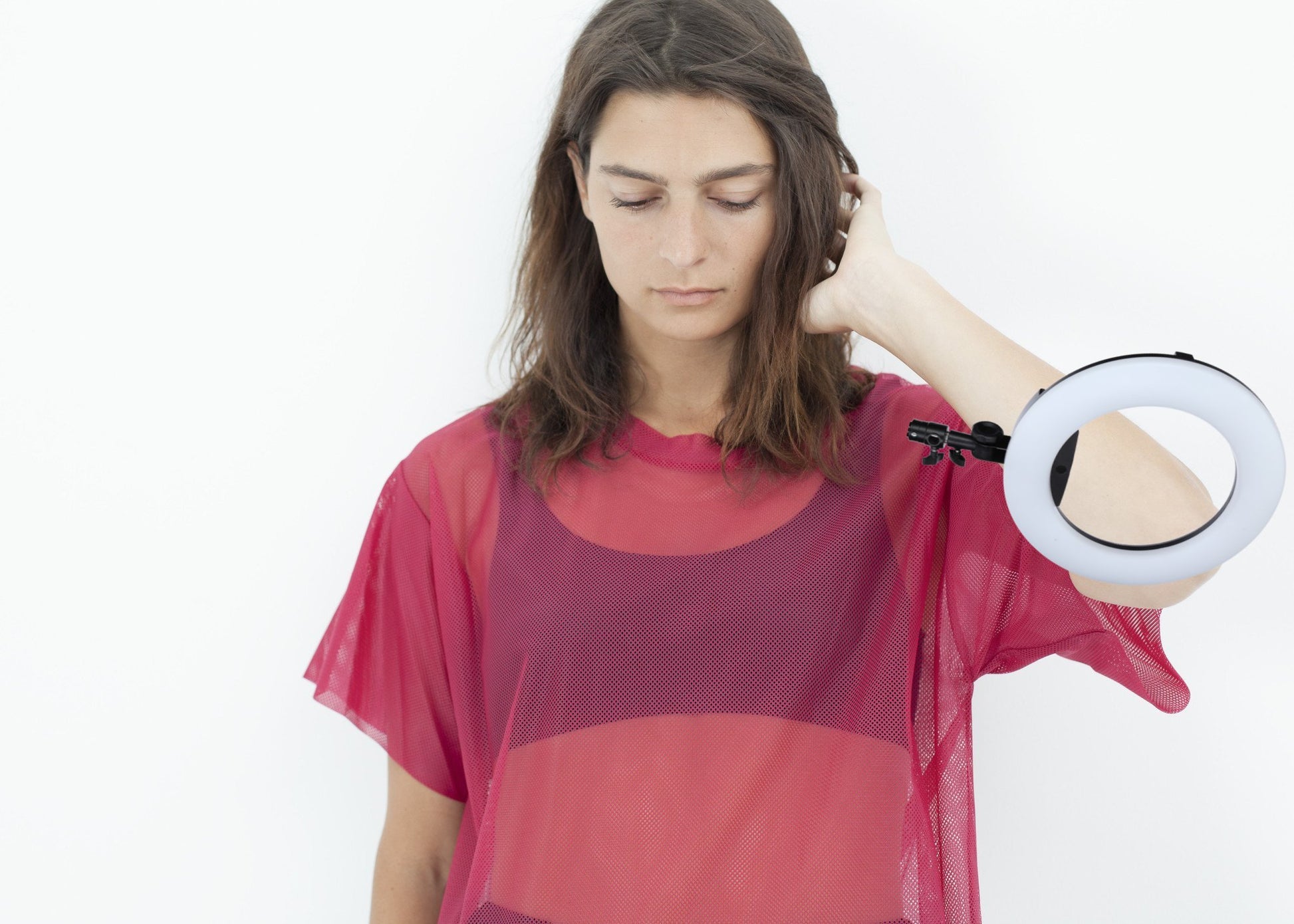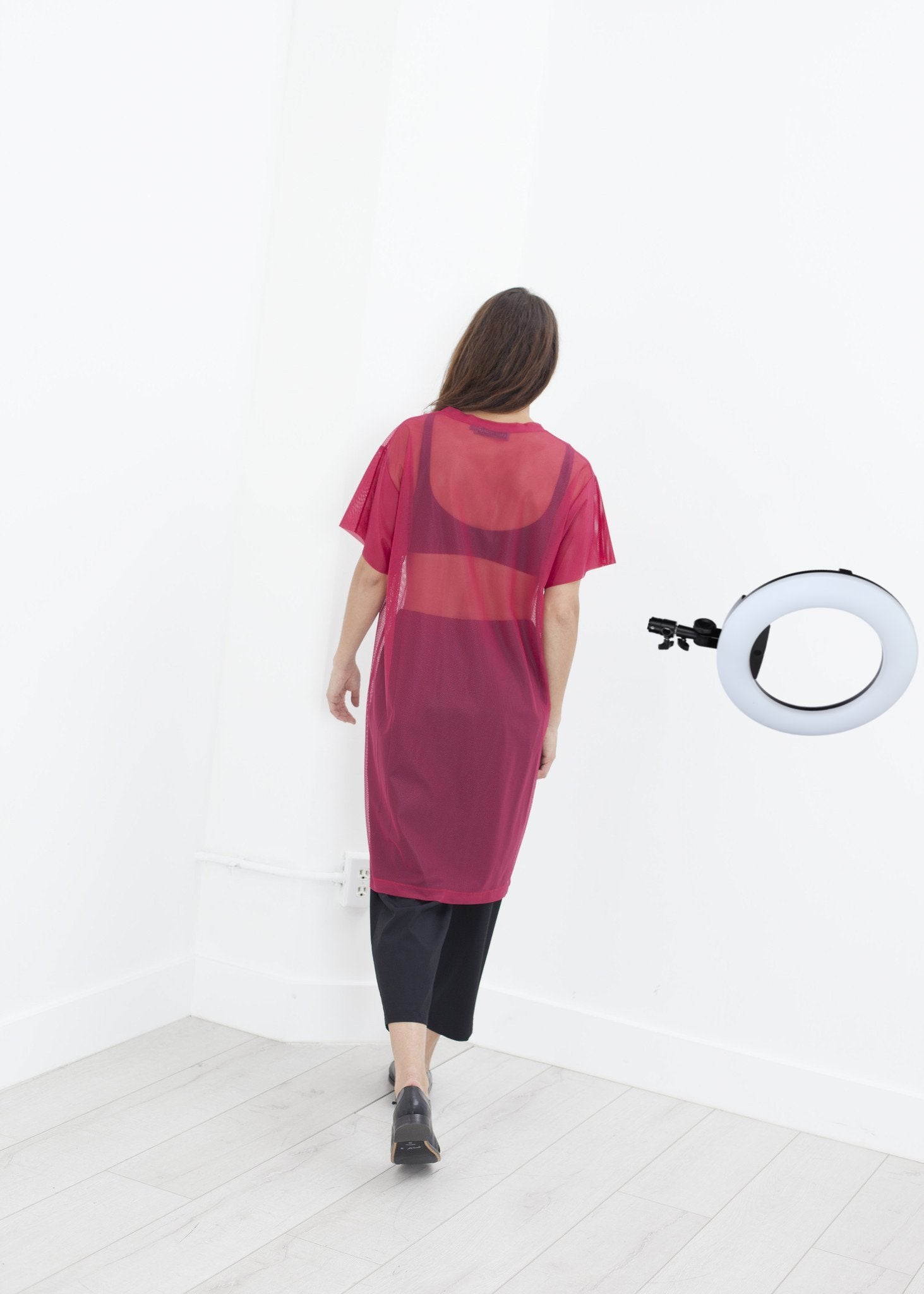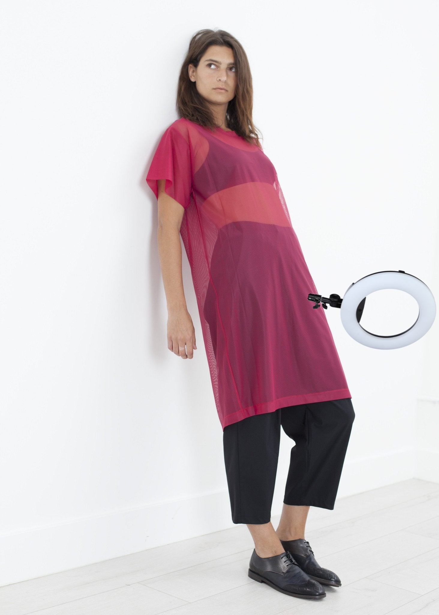An edgy basic to layer over and under all of your current closet items. Bold and rectangular in shape the stiff material won't stretch out or lose it's shape. The dress falls just below the knee if wearing true to your size. Maria Calderara. Color Pink. 100% Polyamide. Lana is wearing a size 1.