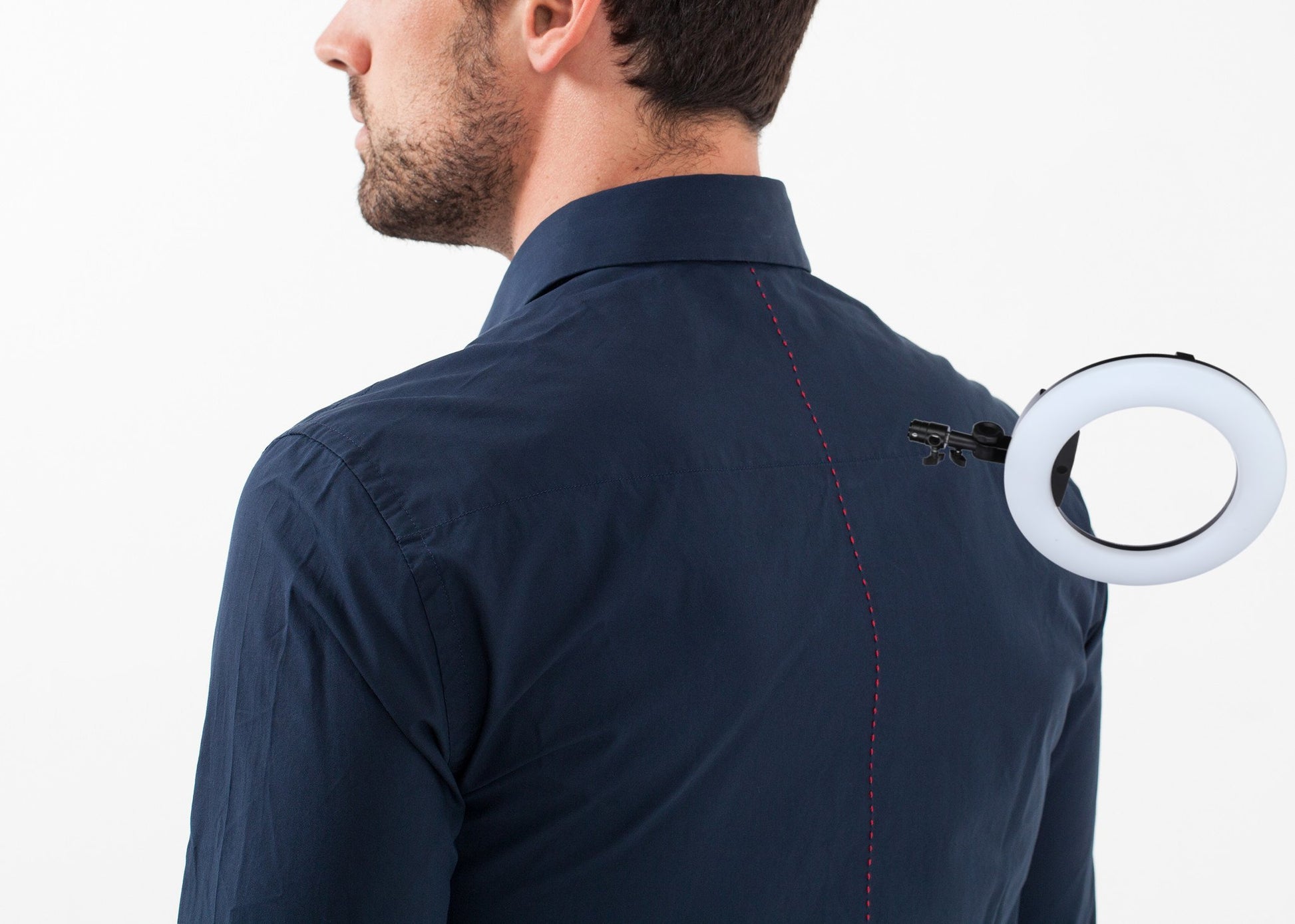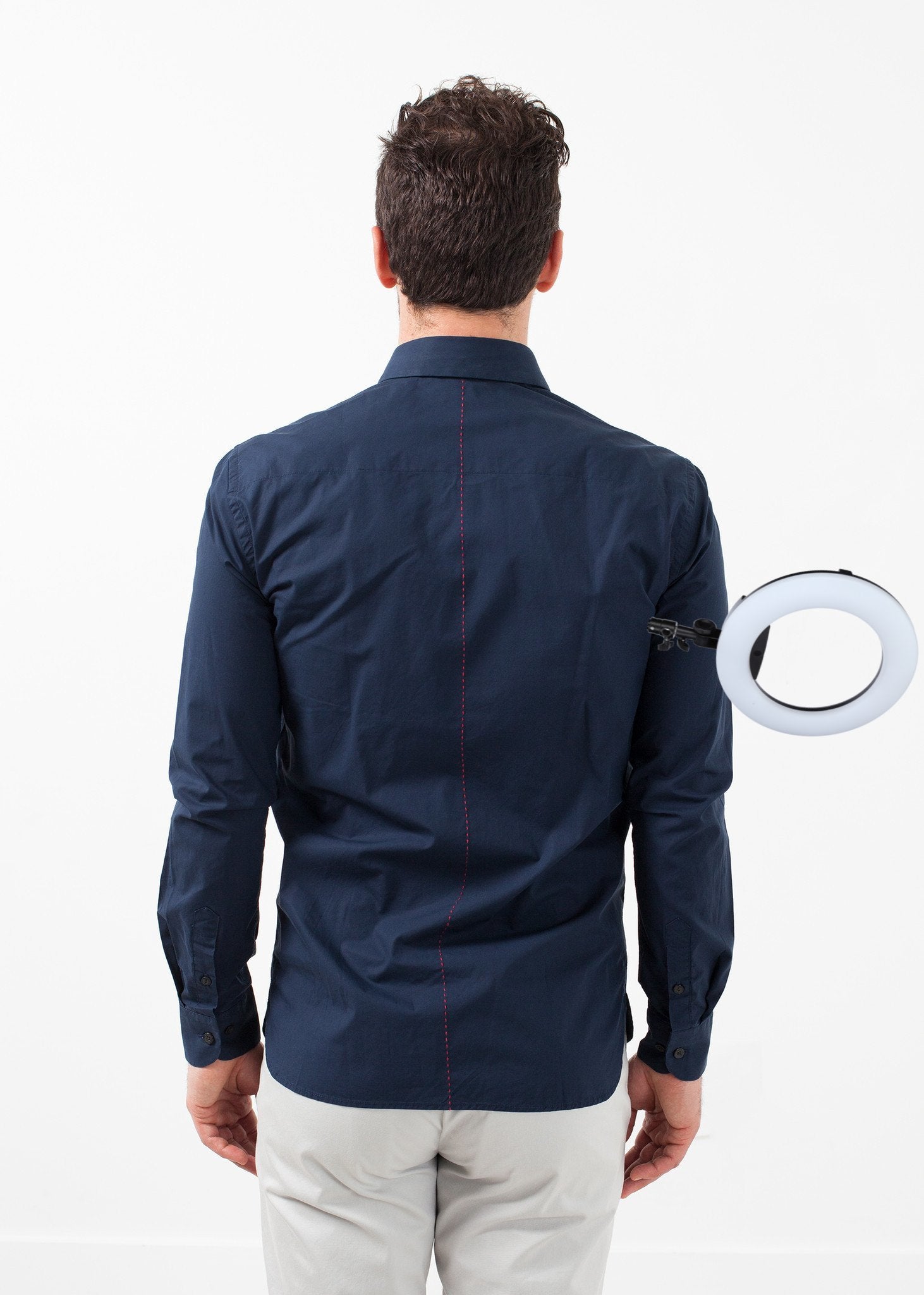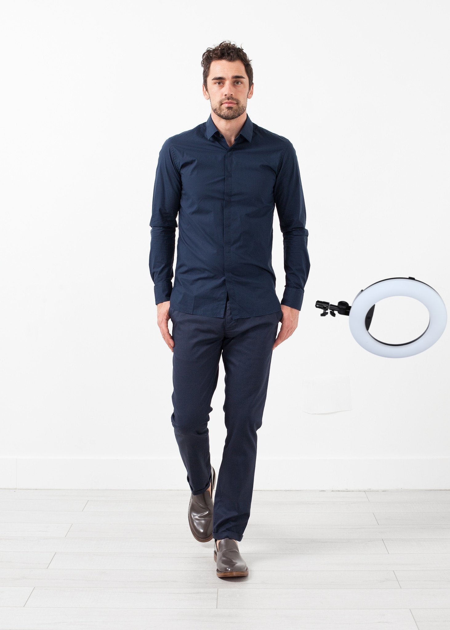 The Milano Shirt is classically tailored as the everyday button up shirt for both casual and more formal wear. Red embroidery cascades the center back seam as a nicely added detail. Covered button placket closure at front. Homecore. Color Navy. 100% Cotton. Made in Portugal. Jacob is wearing a Large.