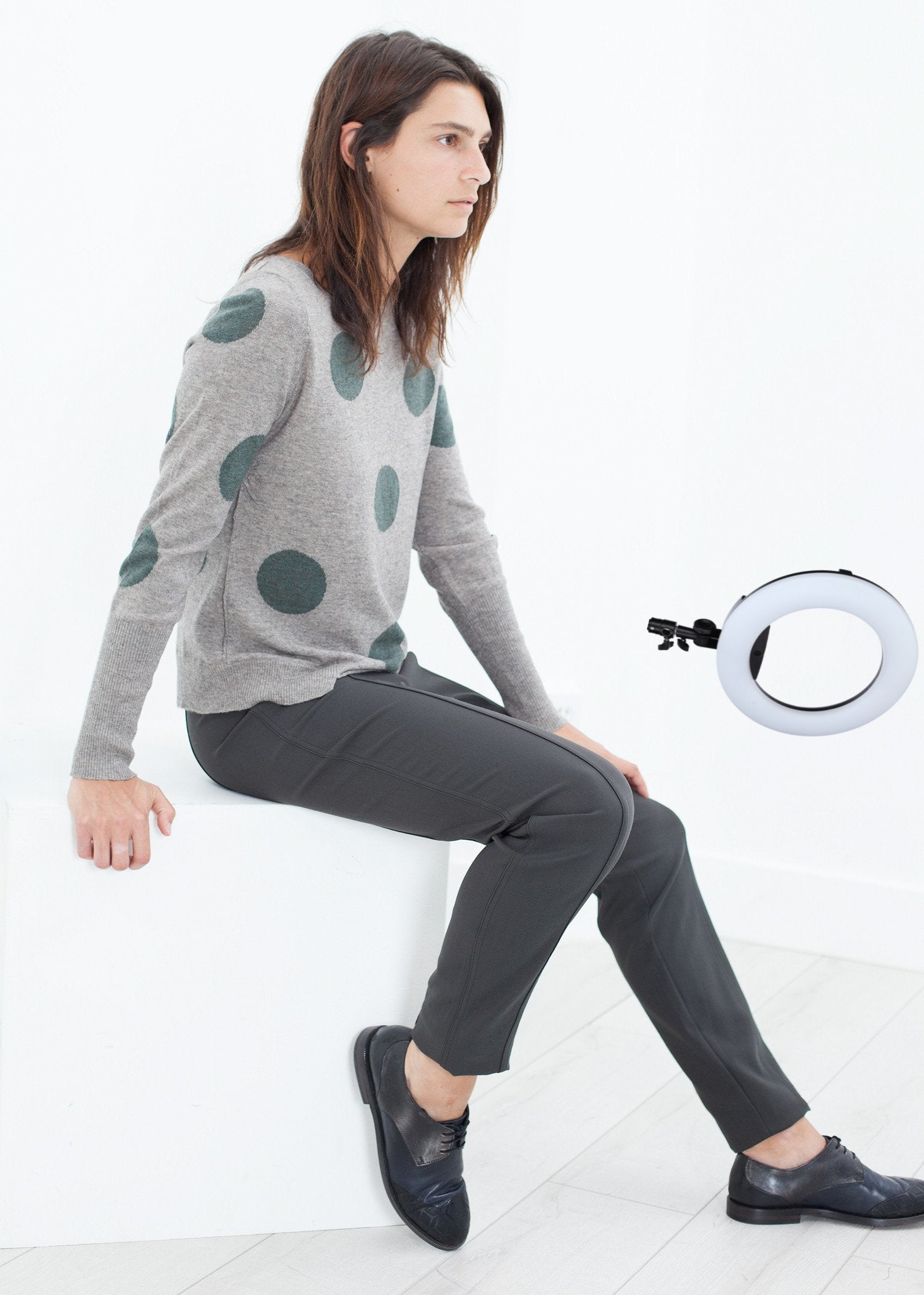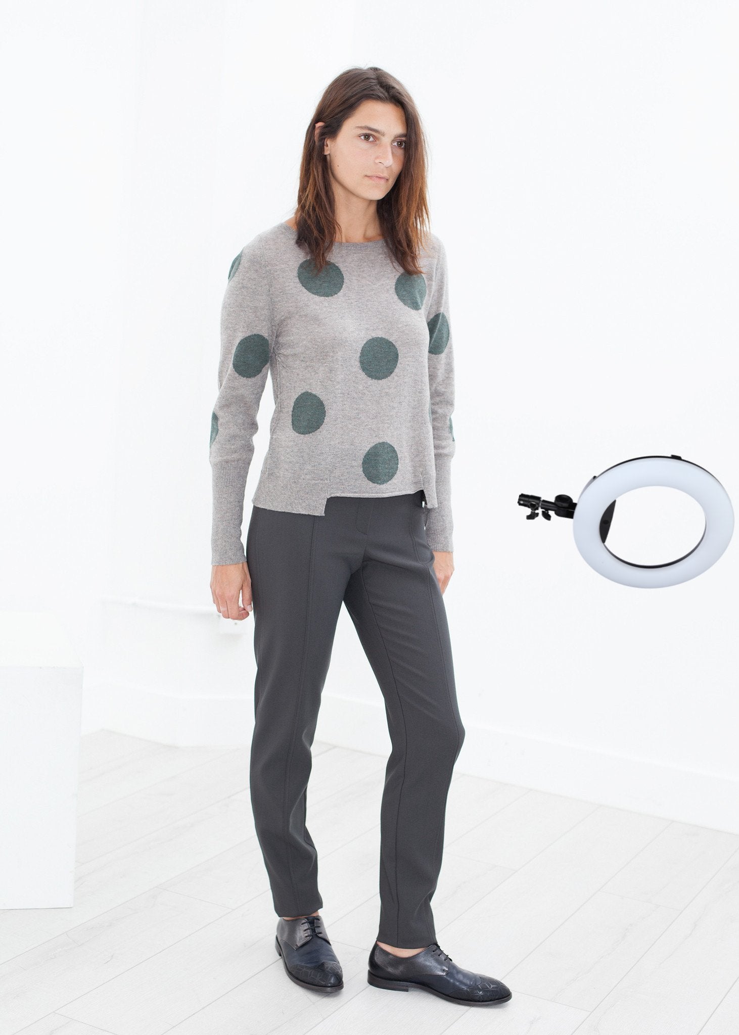 A slim pant with a fantastic shape thanks to seaming details running down front and back. A thick wool and poly blend that recovers quickly. No Pockets to disrupt the perfect line. Belt loops and a nylon zipper fly. Annette Gortz. Color Stone. 55% Wool, 40% Polyamide, 5% Elastane. Made in Germany. Lana is wearing a German 36.