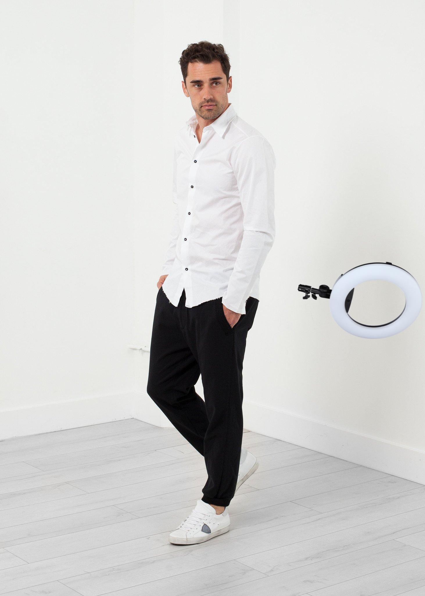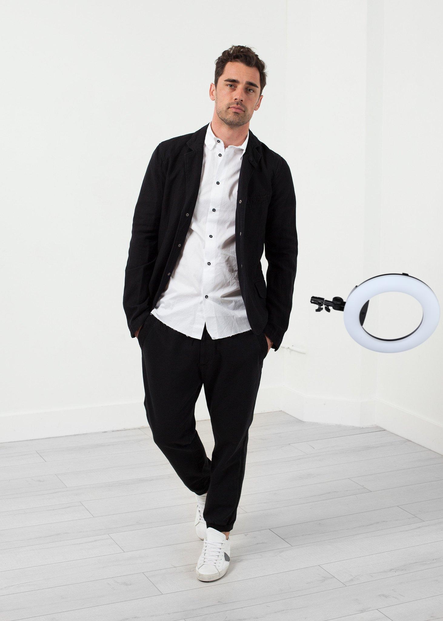The Moun Button Up offers the perks of the classic top with raw finishes. Button placket closure at front. Hannes Roether. Color White. 100% Cotton. Made in the EU. Jacob is wearing a Small.