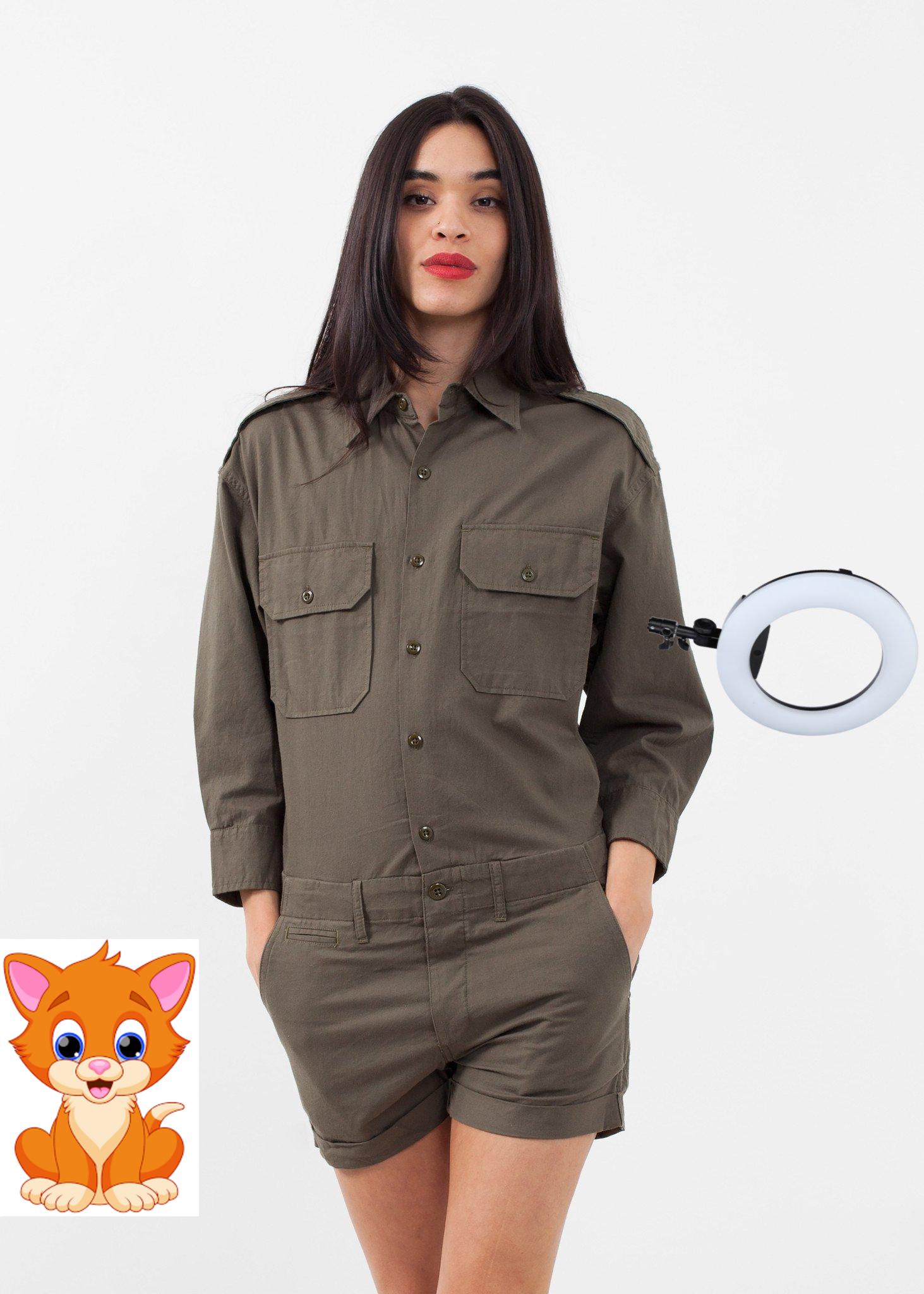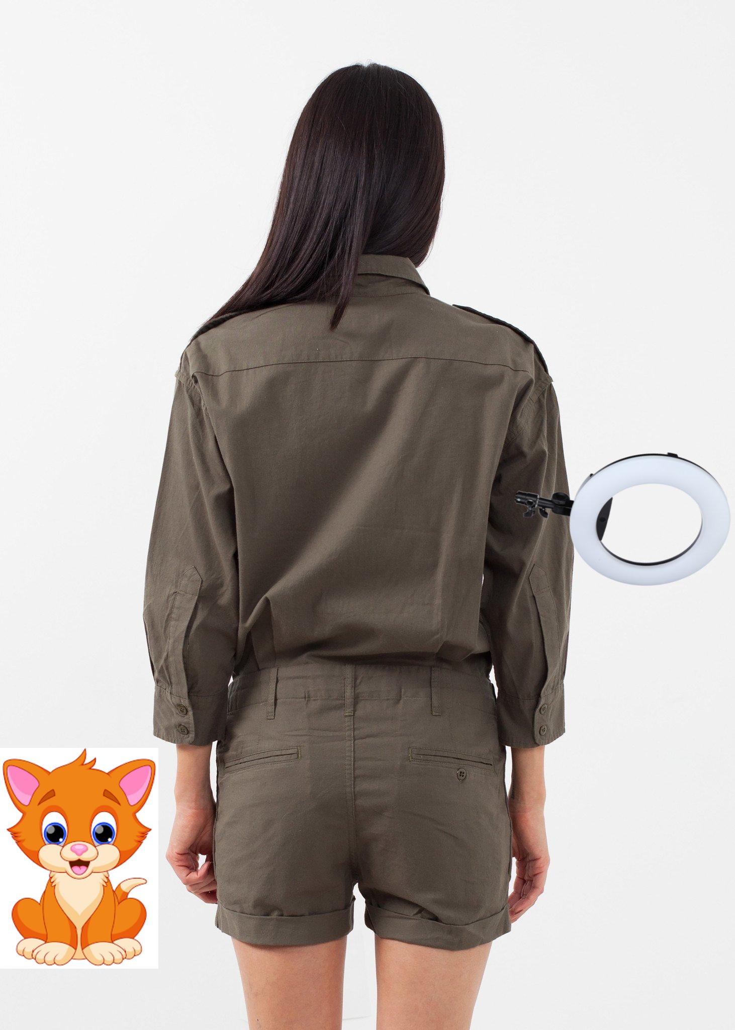 The Officers Jumper presents a feminine army casual. Double breasted exterior flap pockets and side angled pockets at front. Button down placket with button fly. 3/4 inch sleeves. NLST. Color Olive. 100% Cotton. Ashley is wearing an X-Small.