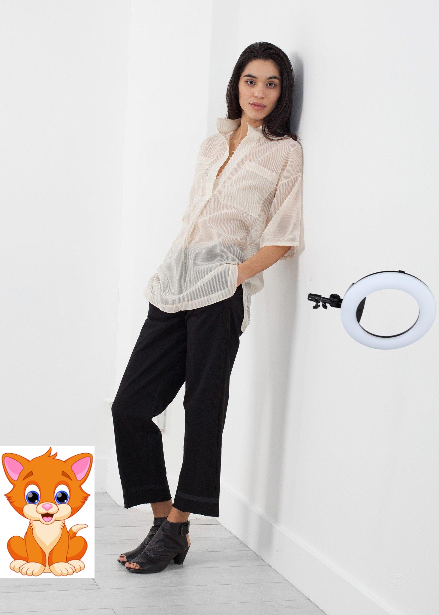 The Polygon Tunic is slightly sheer while soft in structure. V-neckline. Standing collar. Double breasted pockets at front. Schai. Color Sake. 74% Cotton, 26% Silk. Made in U.S.A. Ashley is wearing an XS/S.