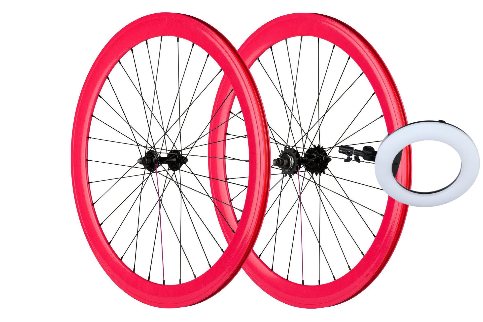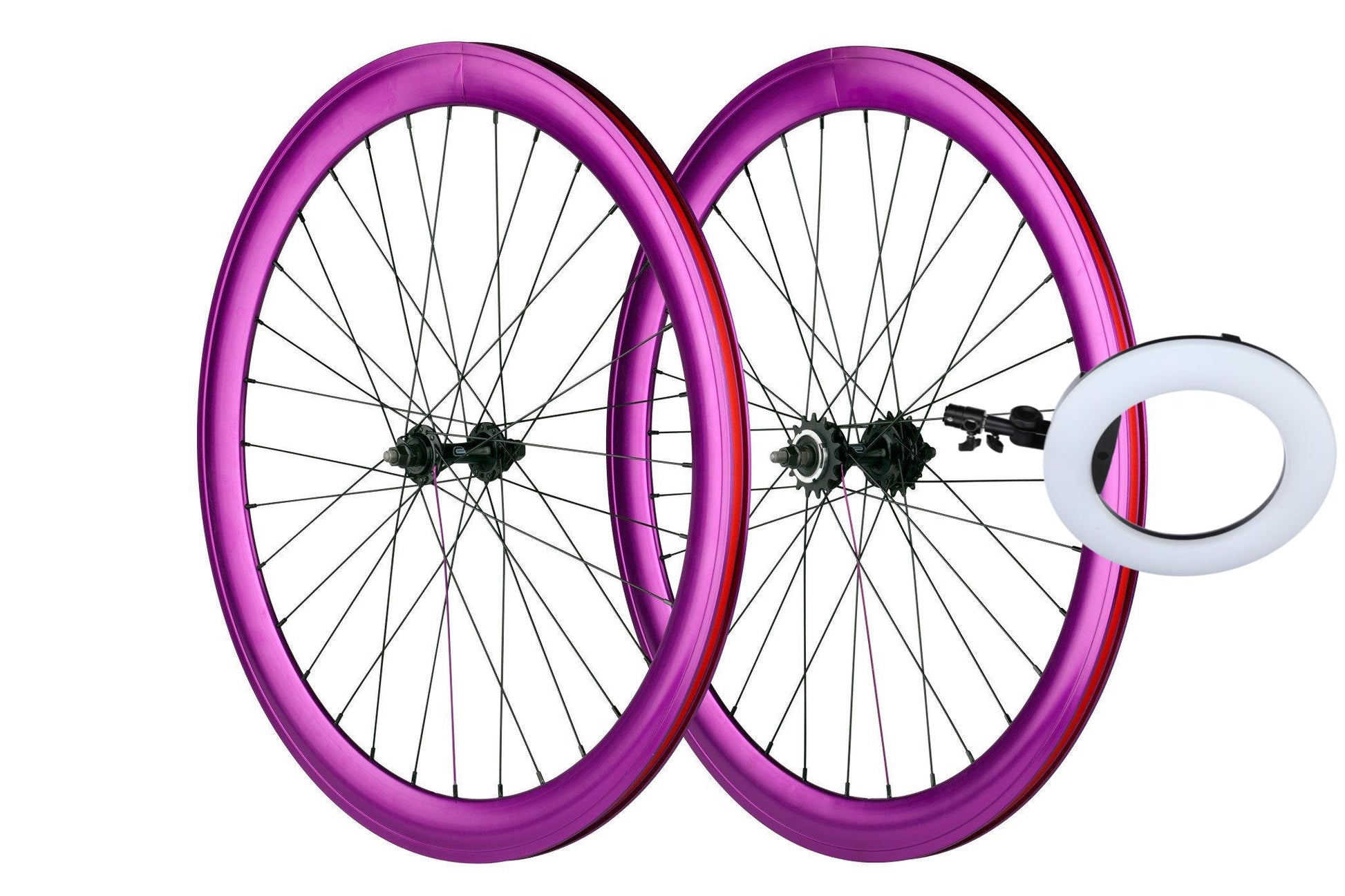 Pure Fix double-walled aluminum wheelsets are size 700C with a 50mm rim depth, front and rear. Our wheels include name-brand and laser-etched KT Quando hubs (100mm front, 120mm rear, 3/8" axle). Our rear wheels include flip-flop hubs with a pre-attached 16T fixed cog along with a 16T freewheel cog for single-speed riding. Our front and rear wheels are 32 spokes each. All wheelsets include nylon rim-strips to protect against sharp edges and prevent tube puncture.