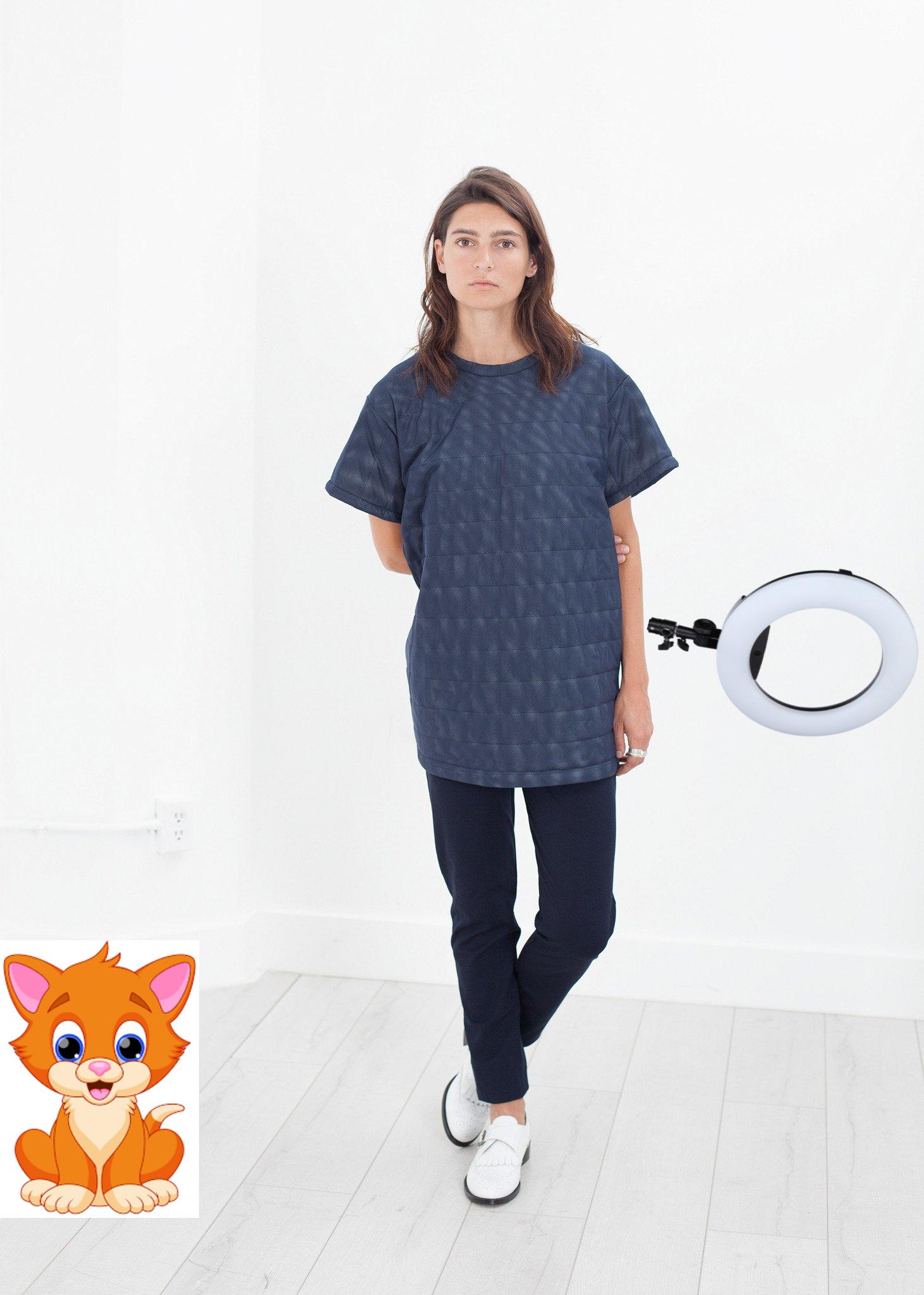 Our stylist's favorite, the Quilted Mesh Mini Dress looks great belted or hanging straight down from the shoulder. Maria Calderara. Color Navy. 100% Polyamide with 100% Polyester Padding. Lana is wearing a size 1.
