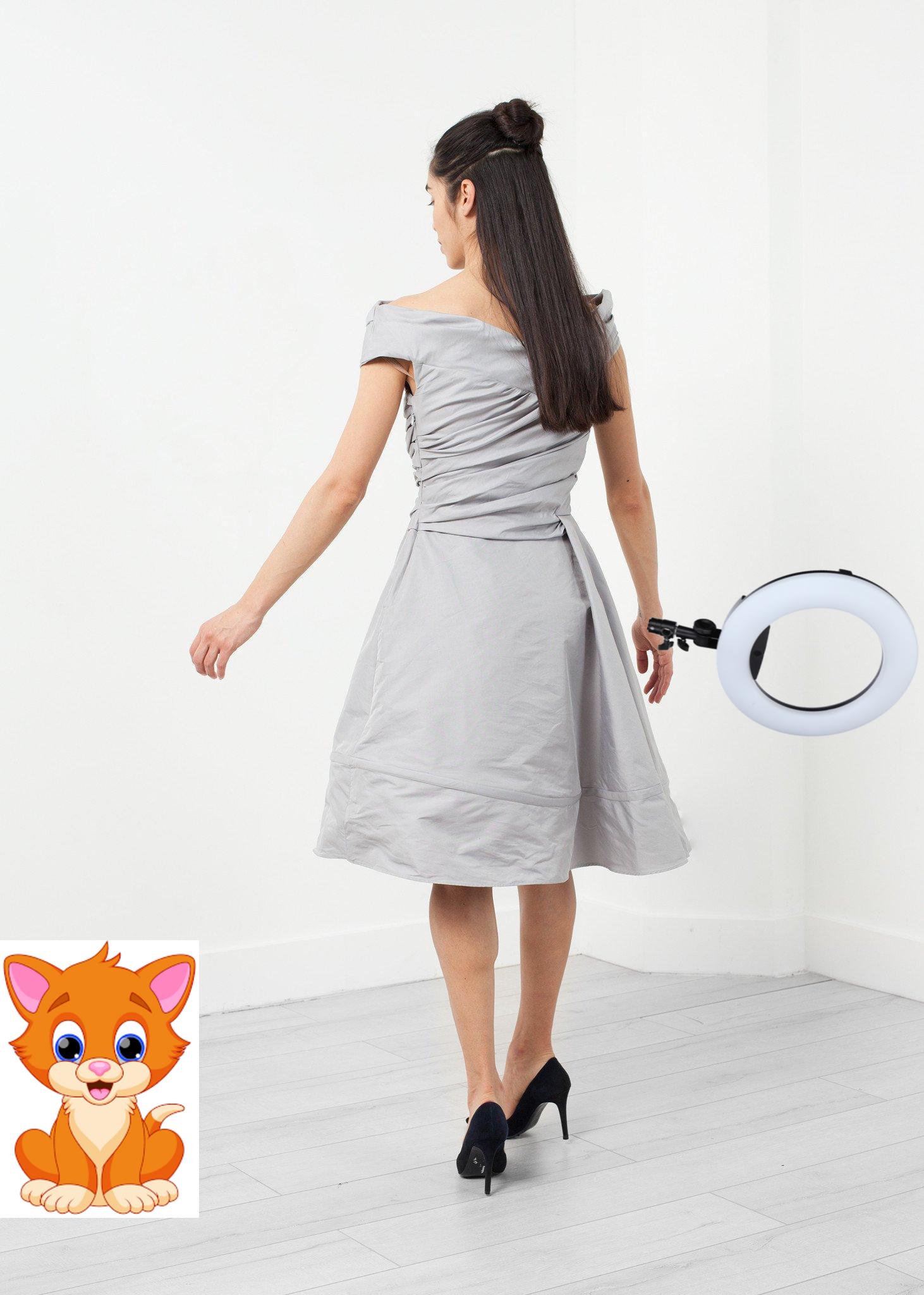 The Rhesus Gown is a romantic piece of gathering and placement. Invisible zip closure at side. Circle skirt with boning for shape. Lilith. Color Grey. 100% Polyester. Made in Tunisia. Ashley is wearing an X Small.