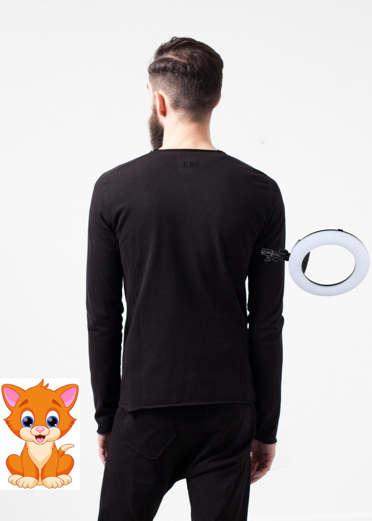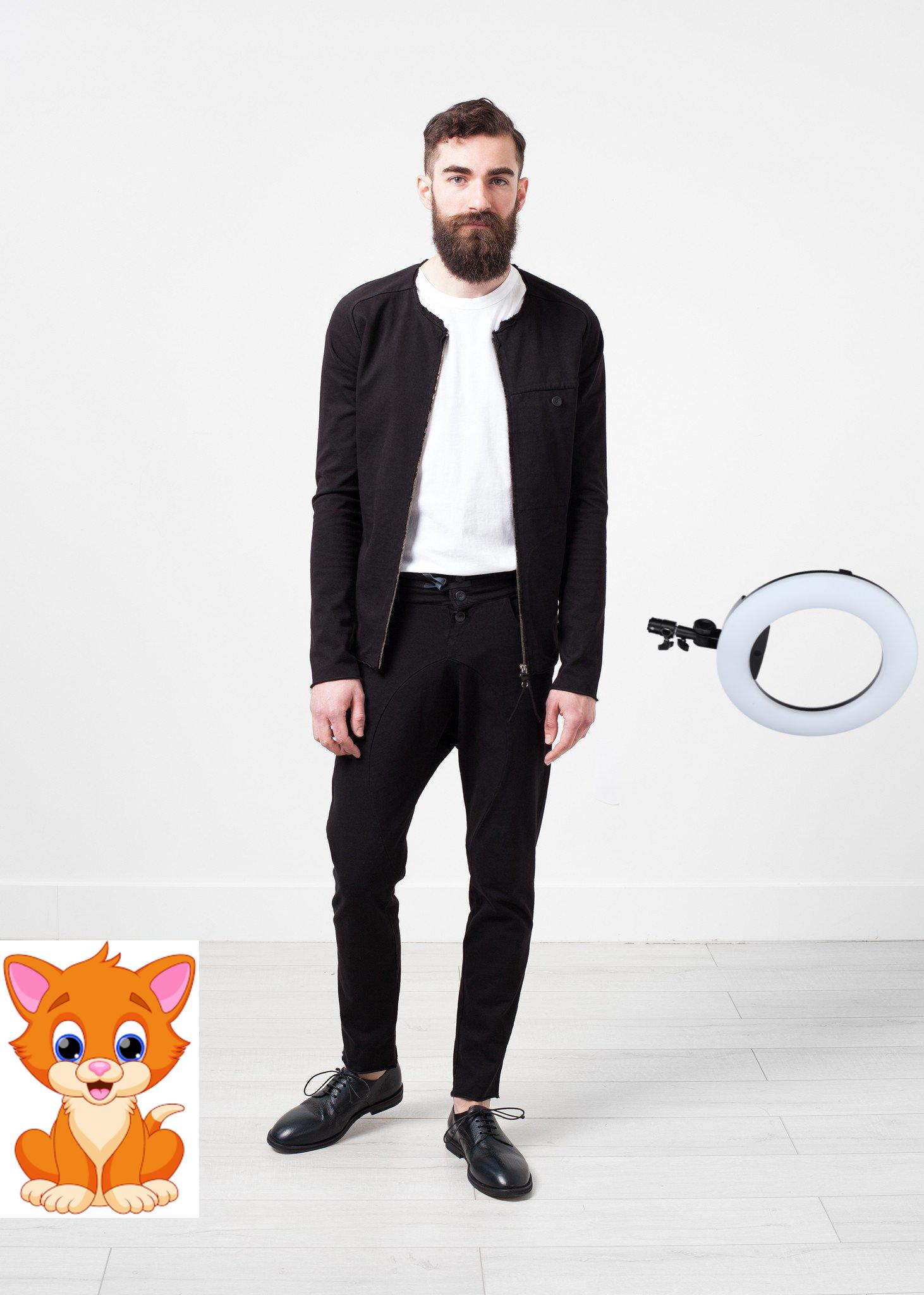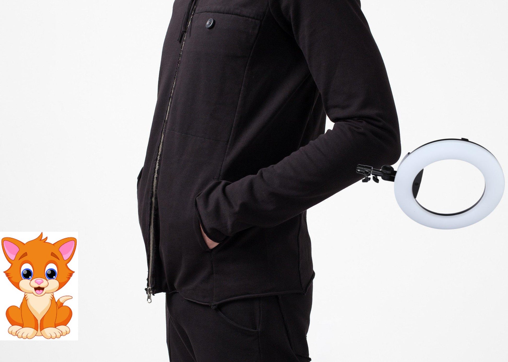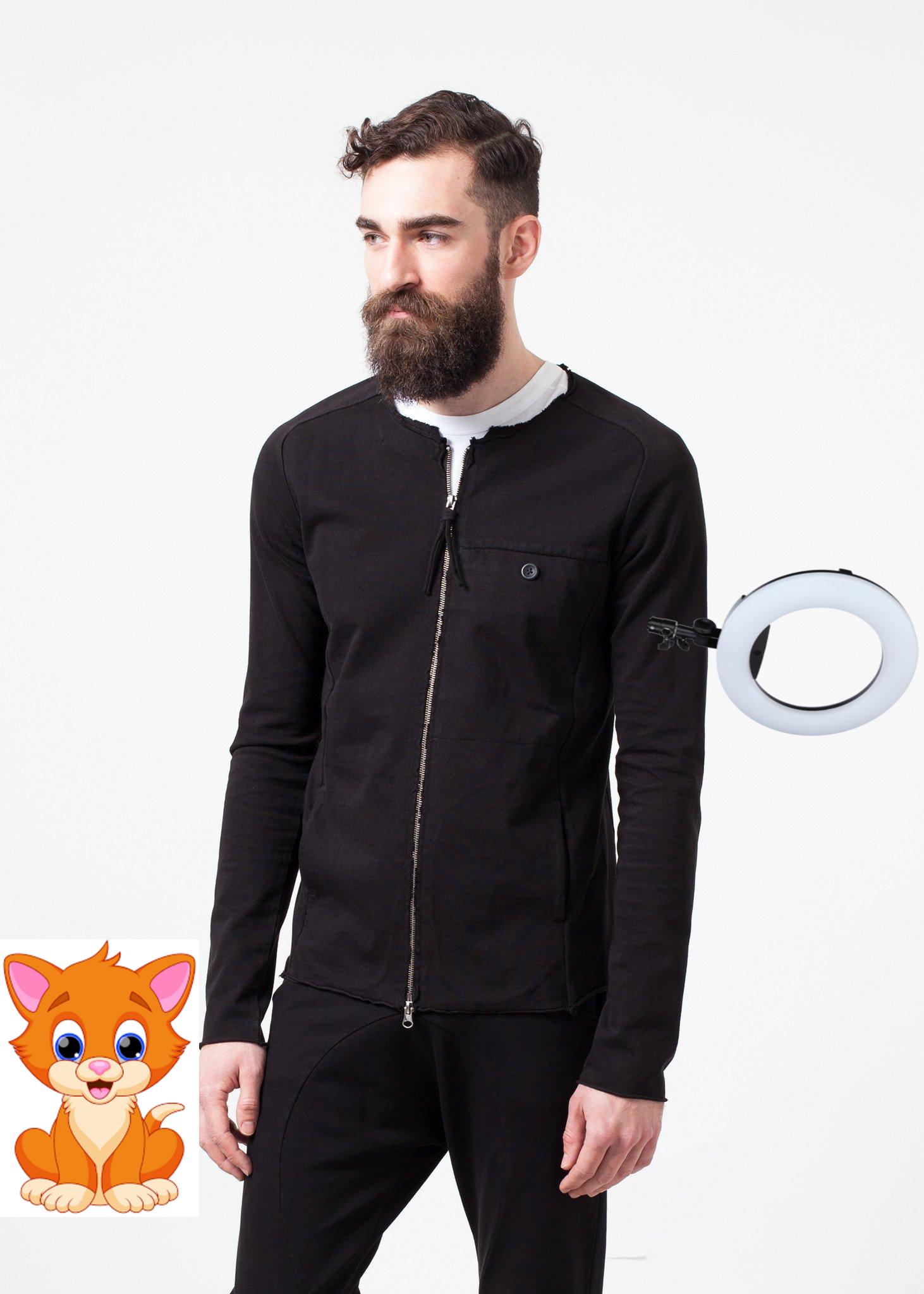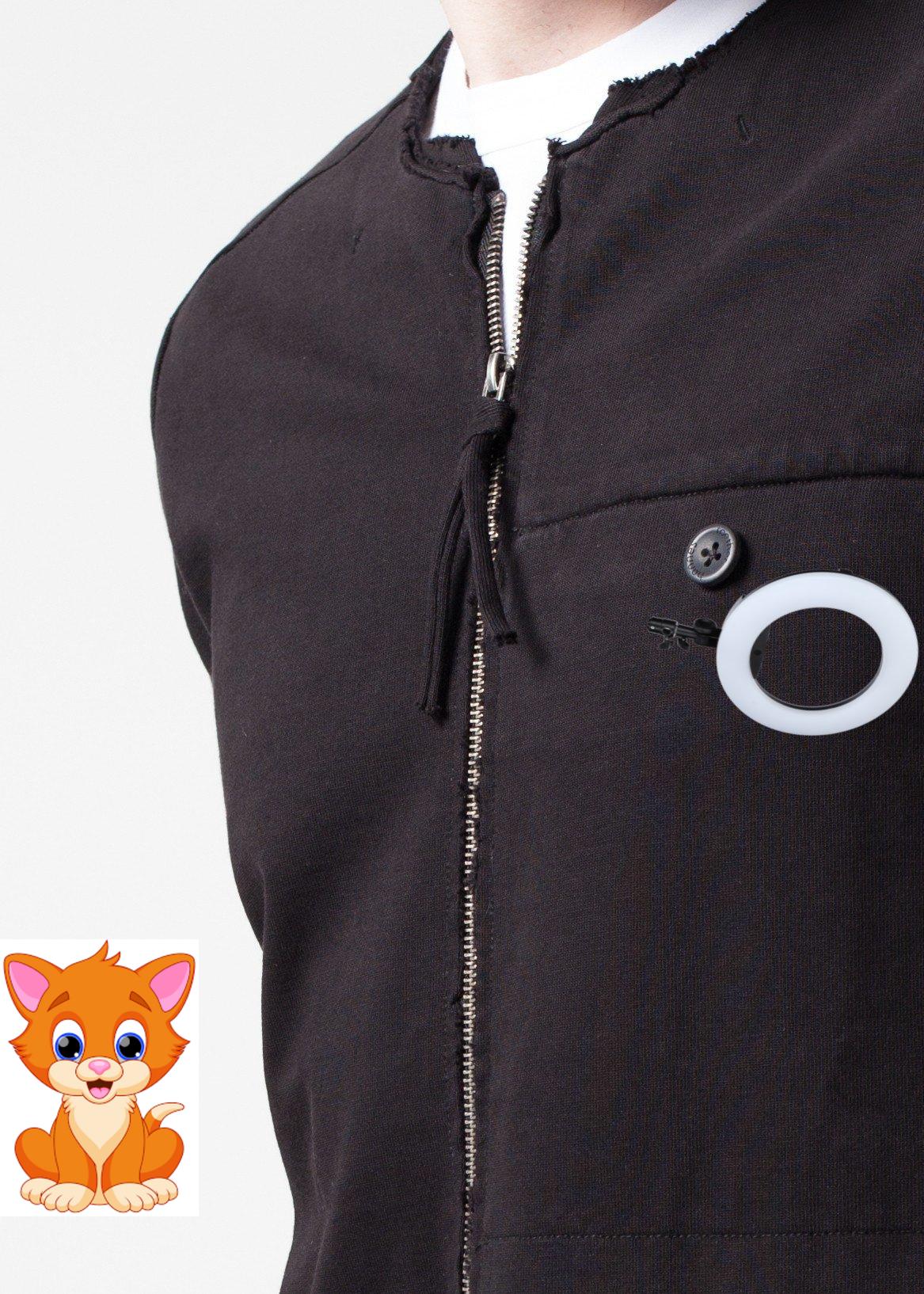 The Rumor Jacket speaks to the raw urbanity of all things. Unfinished hemlines, side paneling, and semi-raglan sleeves. Interior breast pocket. Front waist pockets. Full contrast zip at center front. Hannes Roether. Color Black. 100% Cotton, 95% Cotton, 5% Elastane. Addis is wearing a Small.