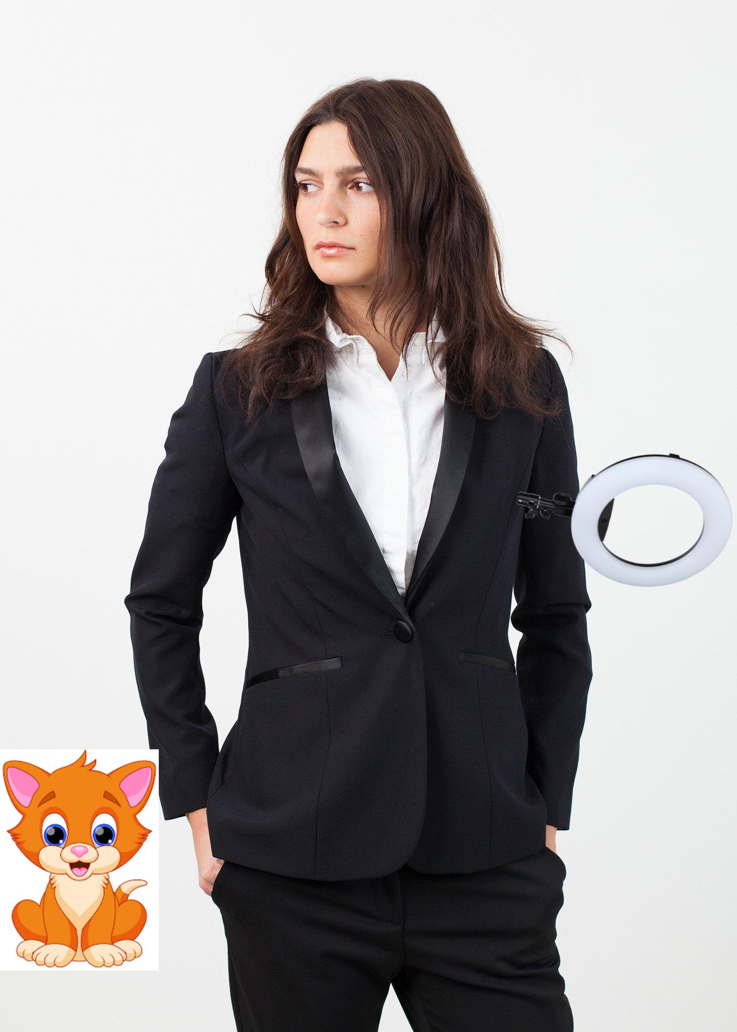 Black tie formal blazer crafted exclusively for the feminine form. Princess seaming emanates a classic silhouette for a tailored beauty. Single button front closure. Front waist pockets. Fully lined. Harvey Faircloth. Color Black. 100% Wool, 65% Acetate, 29% Polyamide, 6% Elastane. Lining, 100% Polyester. Made in U.S.A. Lana is wearing a size 2.
