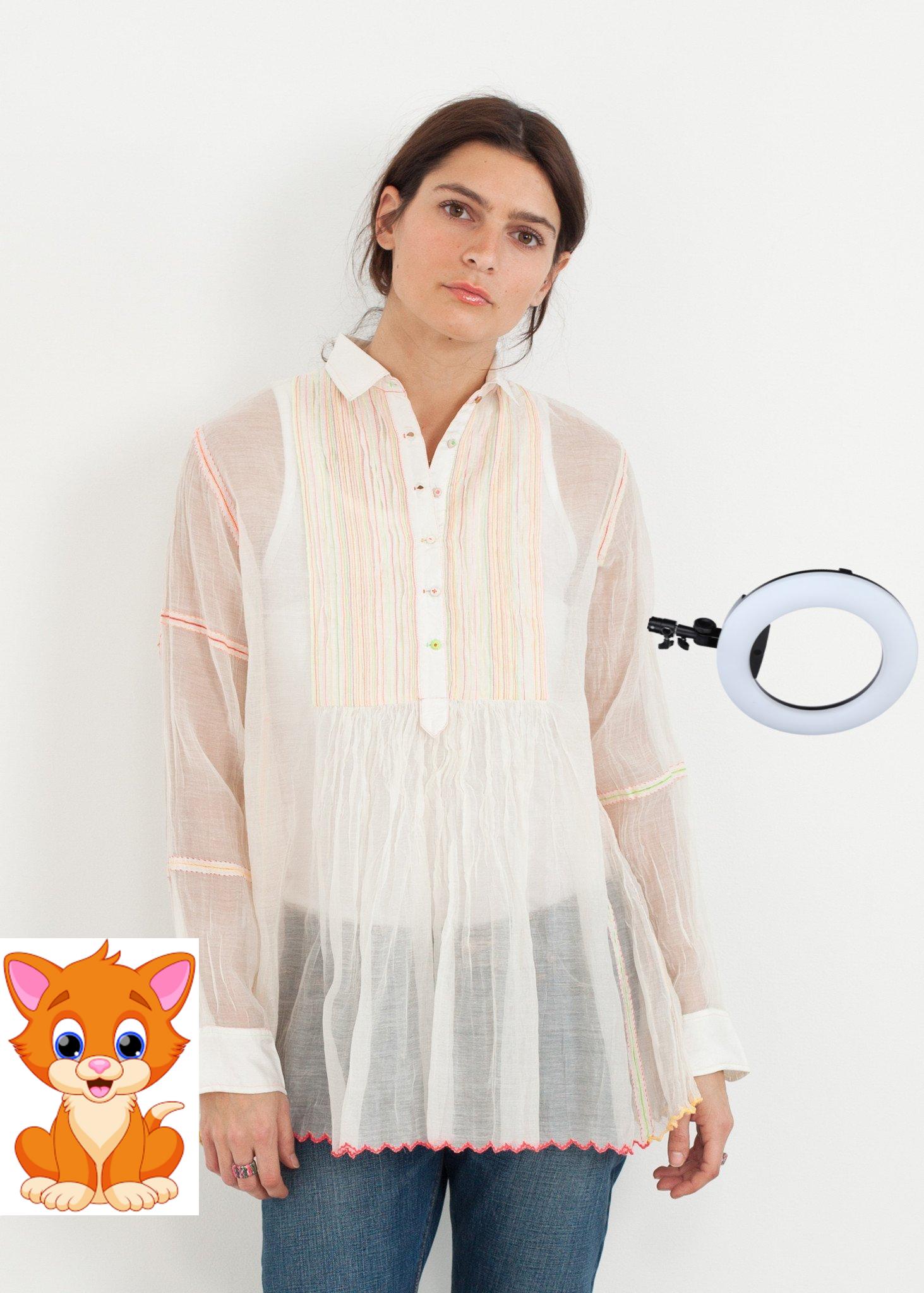 This blouse top provides just enough color to hint warmer temperatures while remaining universally seasonless. Intricate paneling and gathers throughout adds to the piece's eclecticism. Completely handmade, stitched, and embroidered. Long sleeves with silk cuffs, a naturally loose silhouette. Single button placket opening. Tailored collar. Pero. Color White. 50% Cotton, 50% Silk. Made in India. Lana is wearing a size 38.