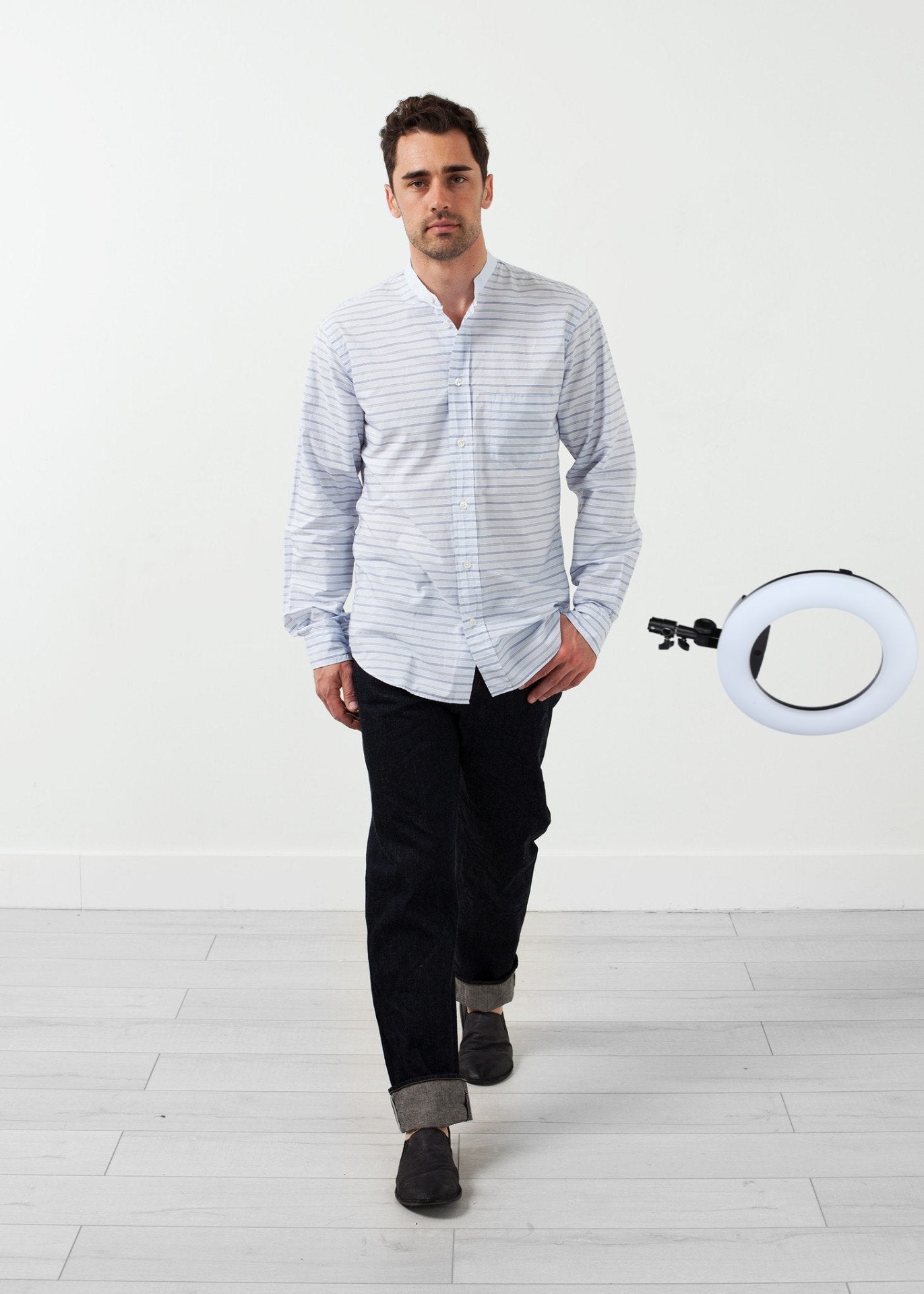 The Tunic Shirt presents a slim to natural fit with a mandarin collar. Breast pocket at front left. Button placket closure at center front. Nigel Cabourn. Color Blue Stripe. 100% Cotton. Made in the EU. Addis is wearing a Size 50.