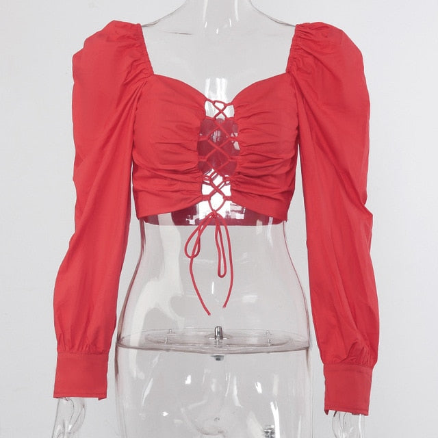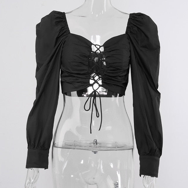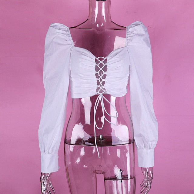 Yimunancy 2020 Autumn Long Sleeve Crop Top Women Fashion Lace Up Top Ladies Puff Sleeve White Blouse Blusas Streetwear