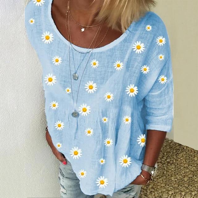 5XL Casual Women Three-Quarter Sleeve Blouse Elegant O Neck Shirt Pullovers 2020 Summer Daisy Flower Print Tops Blusa Streetwear