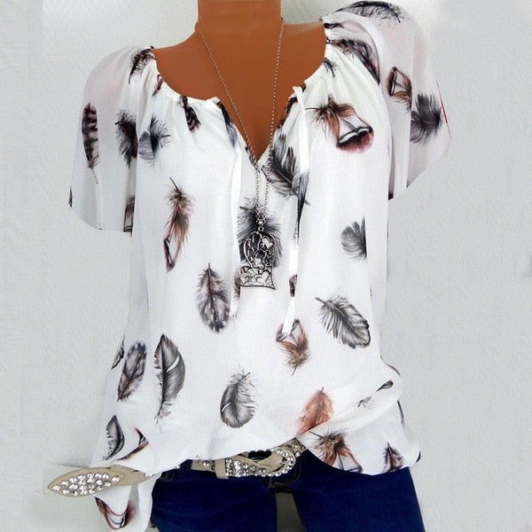 5XL Plus Large Size Women's Blouses Summer Tops New Leisure Blouse White Loose Feather Print V Neck Half Sleeve Shirts Blusas