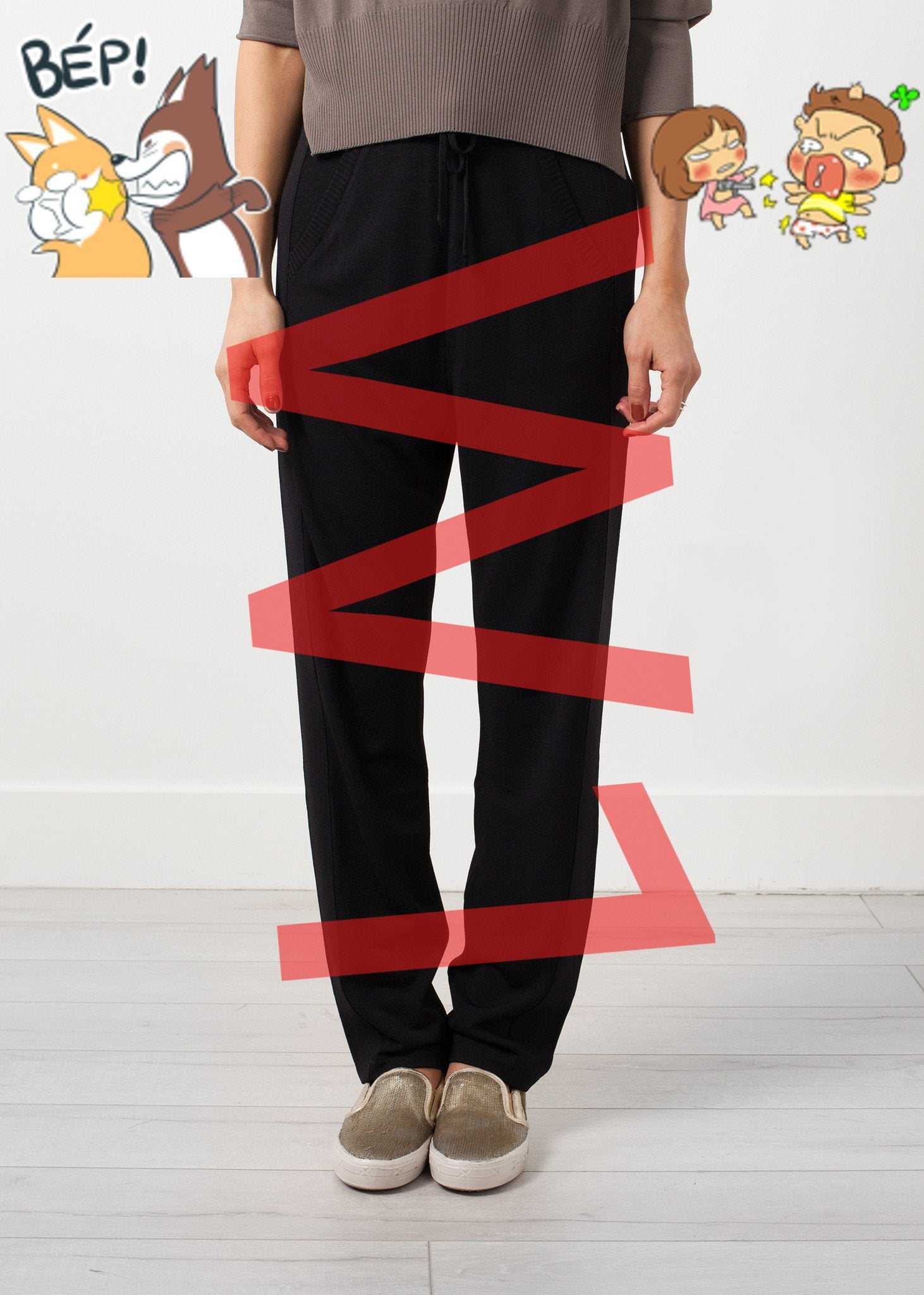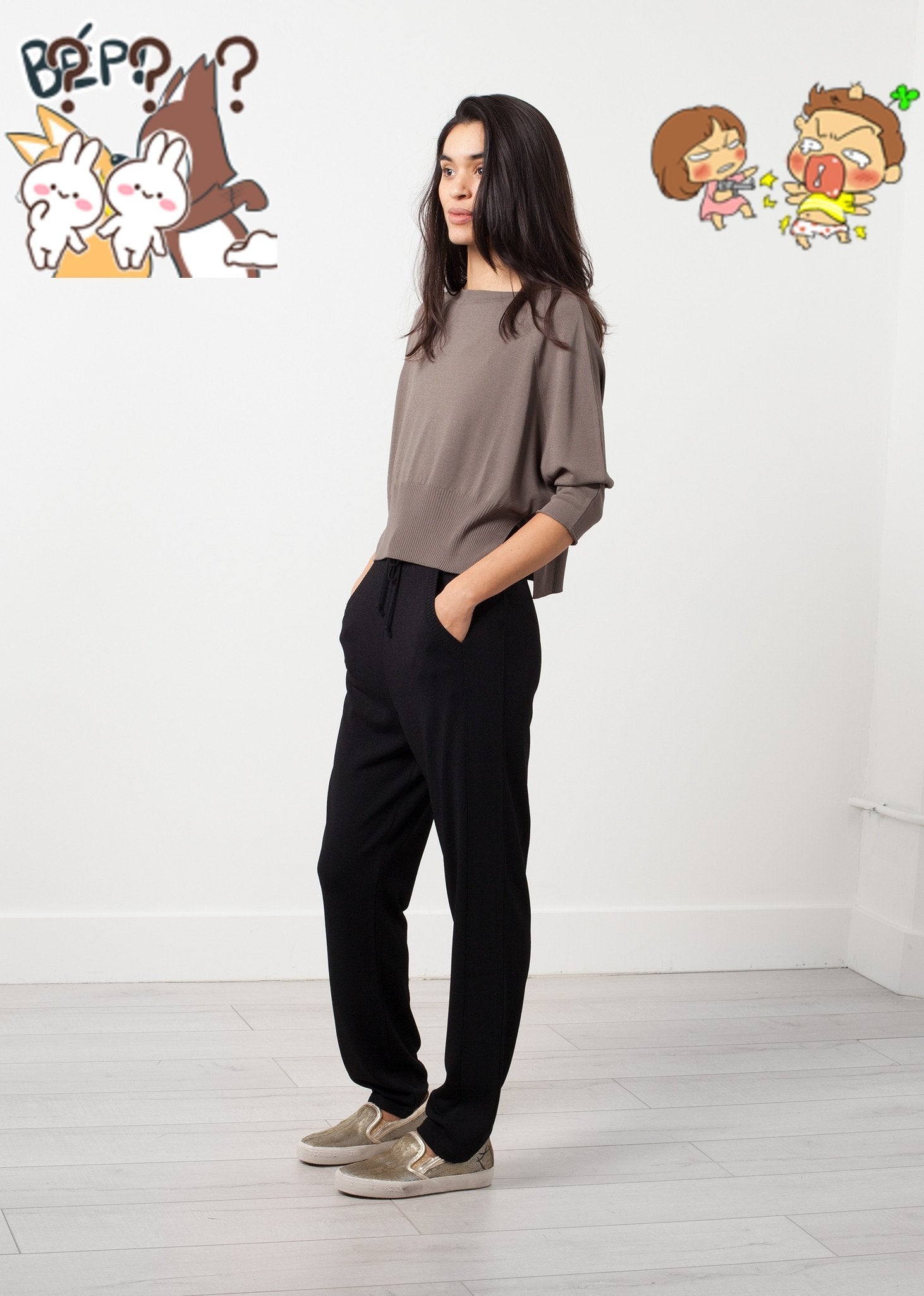 True versatility of pieces, the collection is diverse yet harmonizing with each other. The Alia Knit Trouser by Annette Gortz is essentially a classy sweat pant. Draw string waist band. Side angled pockets at front. Tapered leg with a subtle racing stripe. Color Black. 96% Viscose, 4% Polyester. Made in Germany. Ashley is wearing an X Small.