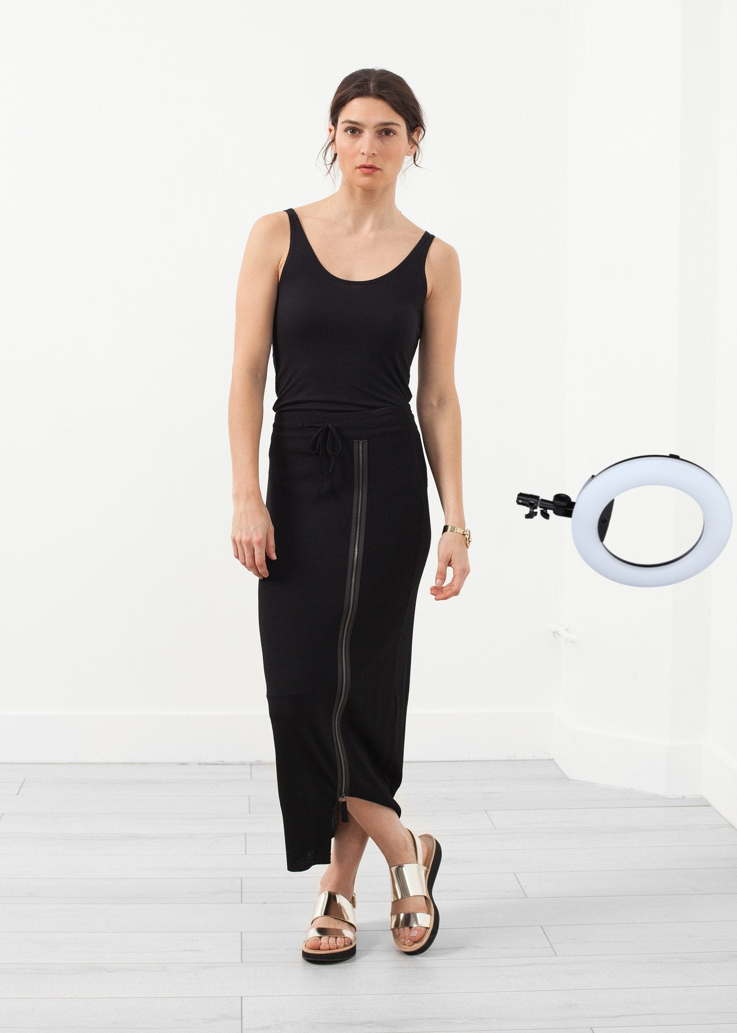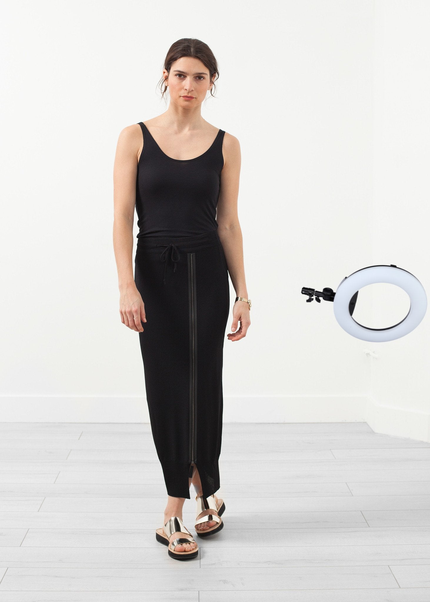 True versatility of pieces, the collection is diverse yet harmonizing with each other. The Aliam Skirt by Annette Gortz is essentially a classy sweatpant skirt. Elastic waistband for ease. Color Black. 96% Viscose, 4% Polyester. Made in Germany. Lana is wearing an X Small. Lana is 5'7, hips 36.5", waist 25", bust 34.5".