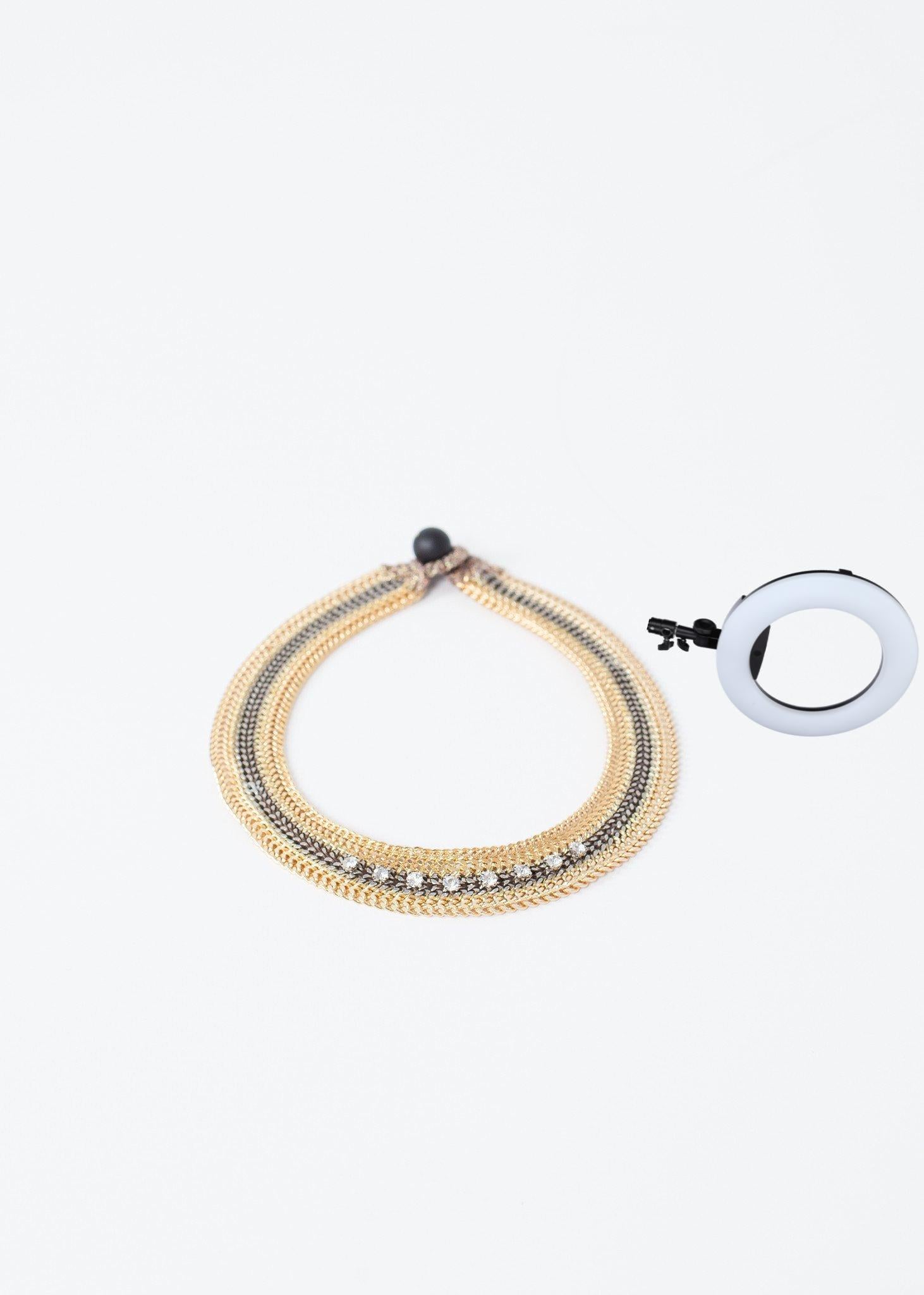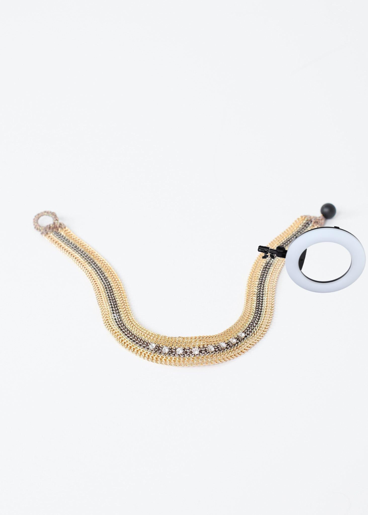 Quintessential elegance with delicate details. The statement collar necklace intertwines gems and mixed metals. Hook and ball closure. 5 Octobre. Color Grey. Gold Plated. Made in France.