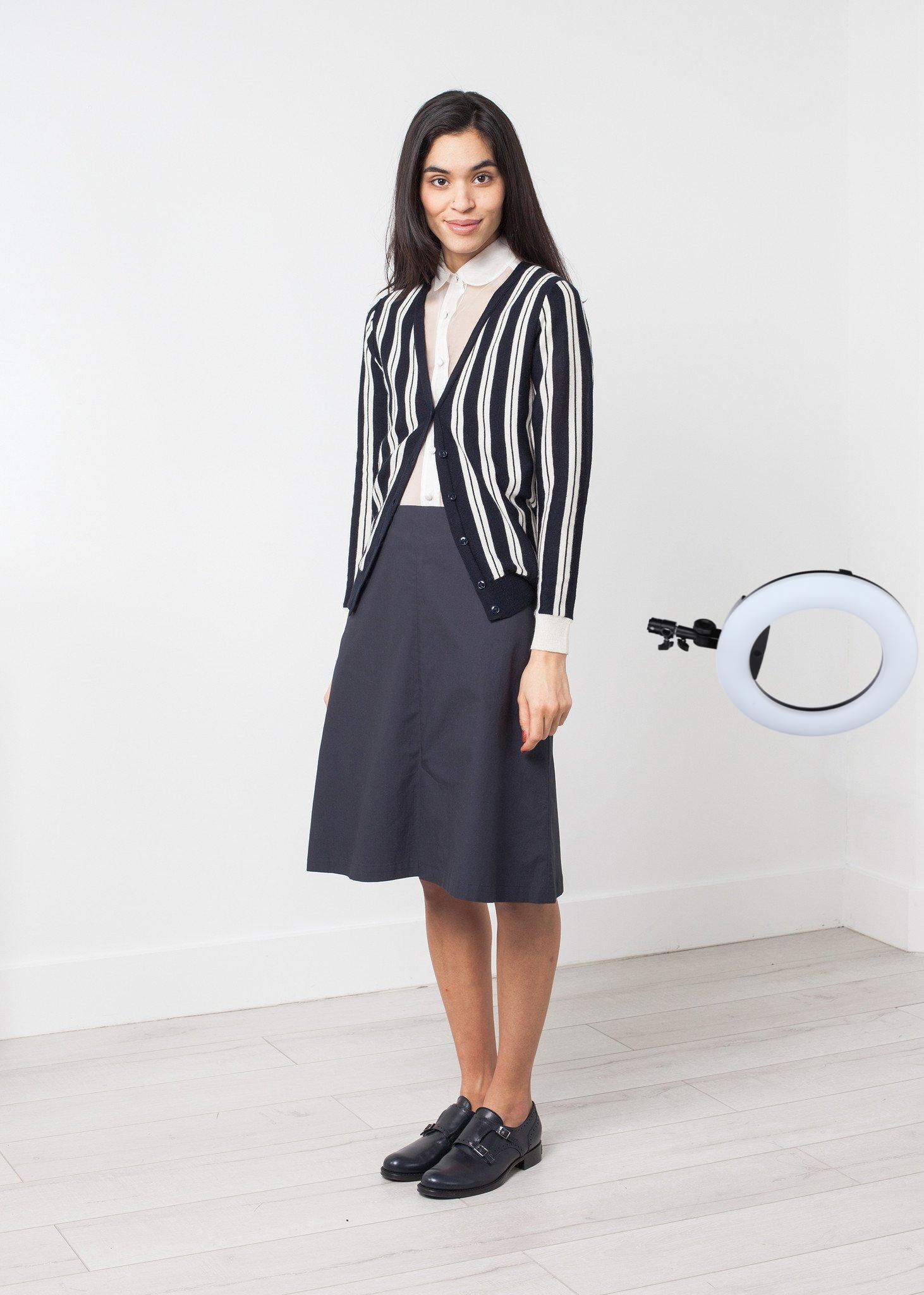 The Library from Yoshi Kondo offers an A-line silhouette to the knee with a clean aesthetic. Invisible zip closure at center back. Pockets at side. Color Navy. 100% Cotton. Ashley is wearing a Small.