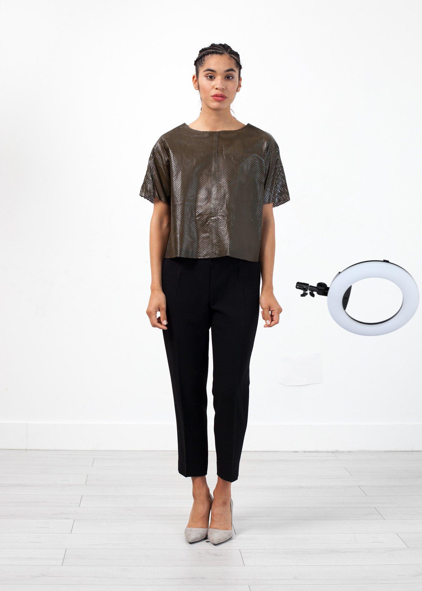 Perforated crop top is perfect for layering or solo wear. By Malene Birger. Color Olive. 100% Lamb's Leather. Made in China. Ashley is wearing a European 36.