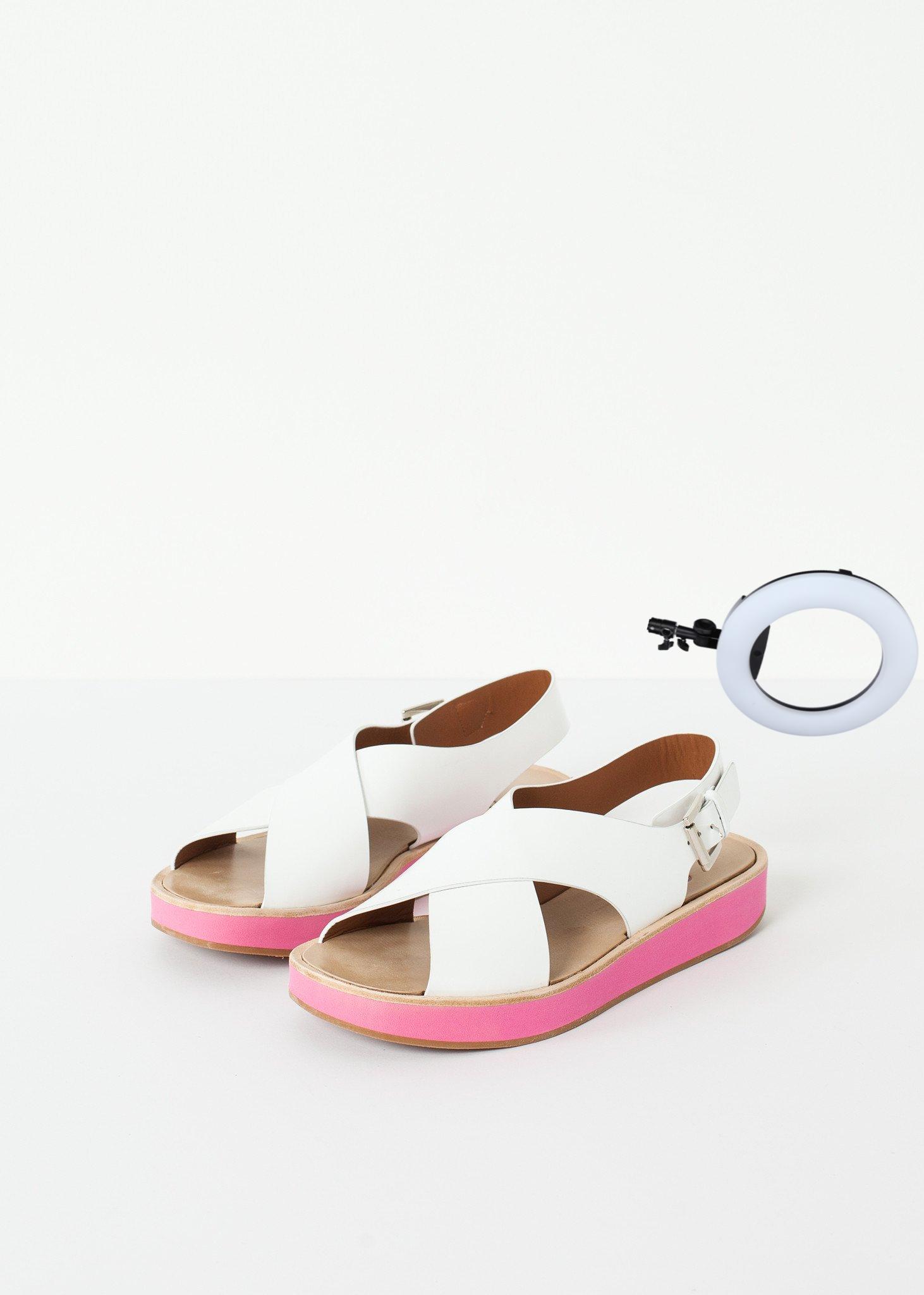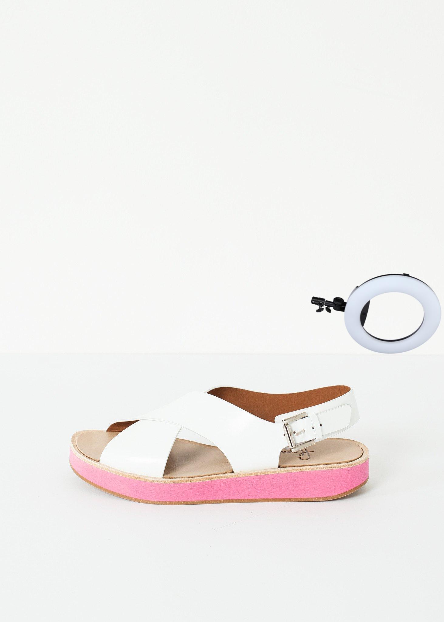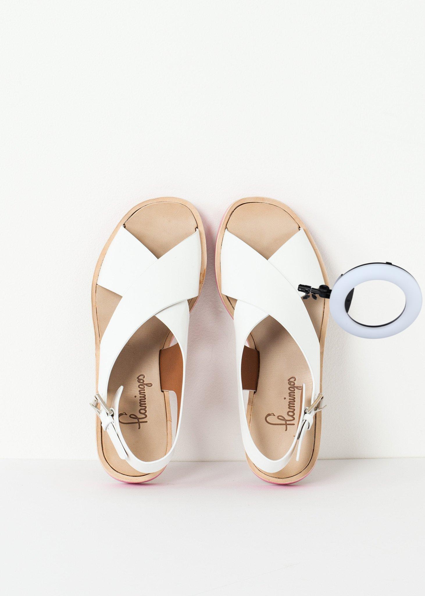 Fun straps paired with bright colors makes the French shoe label Flamingos perfect for summertime. With Anne Blum at its helm, this label effuses creativity in style and just the right amount of play. X marks the spot with the Avalon. Crossing straps wrap the foot in soft leather with a slight shimmer. Buckle closure. Color White. 100% Calf leather upper, row cut, synthetic EVA sole. Leather lined. Made in Spain.