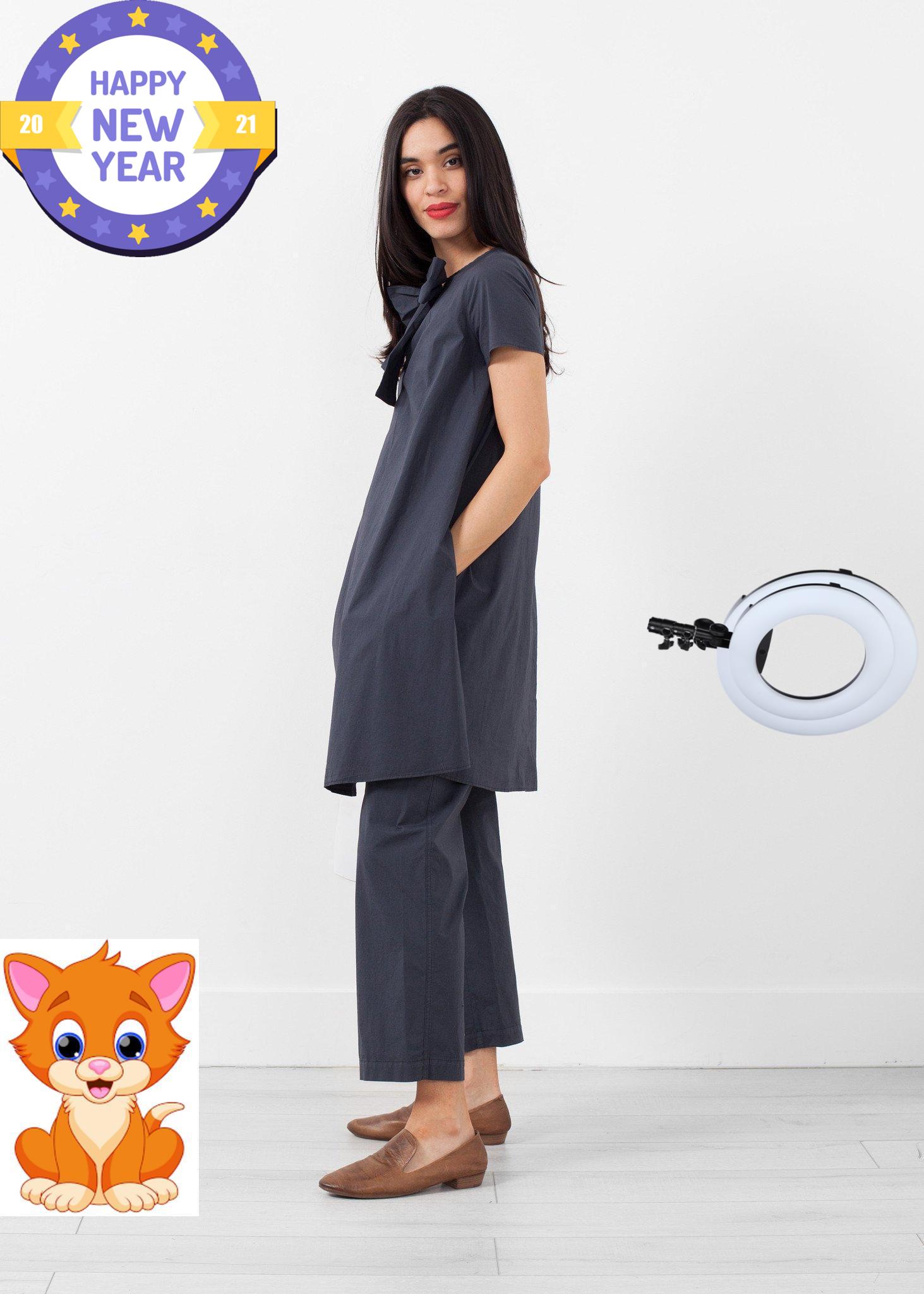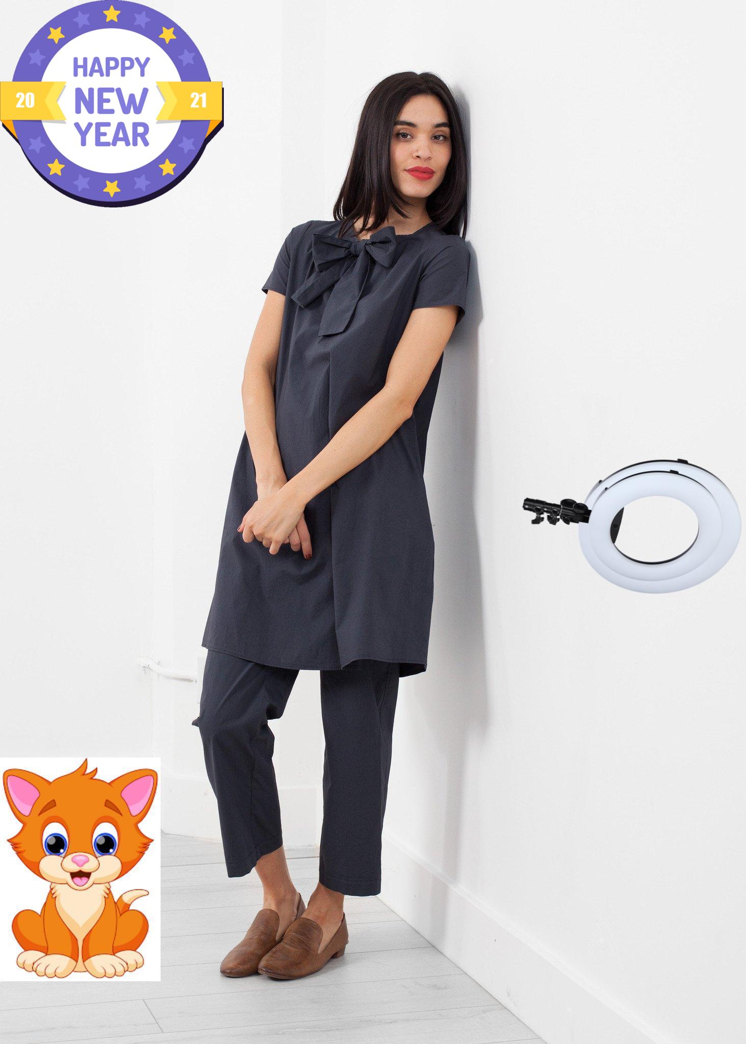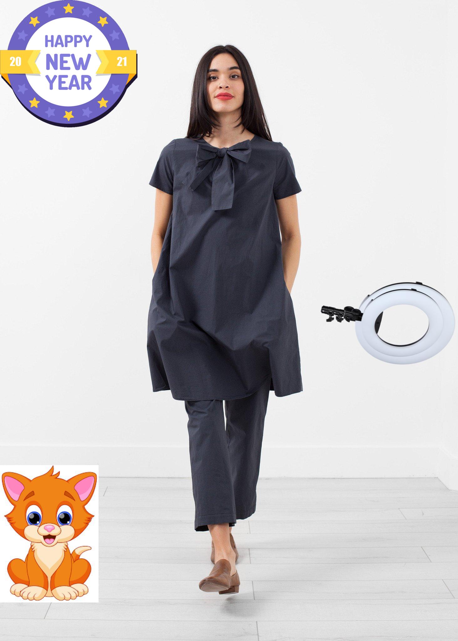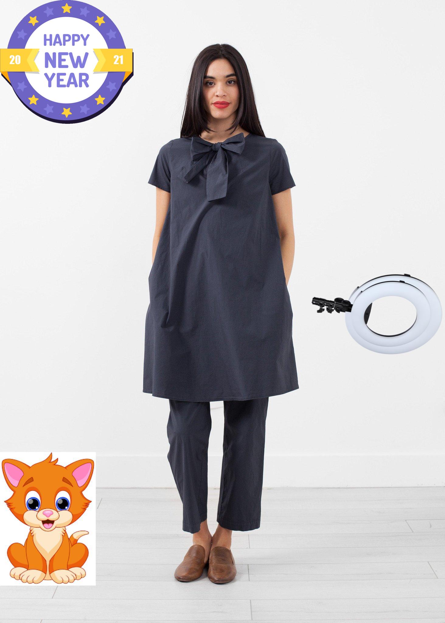 The Babydoll Dress ia delicately sweet for the summer season. Where a darling elegance comes out. Side angled pockets at front. Bow with snap button fastener at opening. Hook and eye closure at front. Hache. Color Navy. 96% Cotton, 4% Elastane. Made in Italy. Ashley is wearing a Size 38.