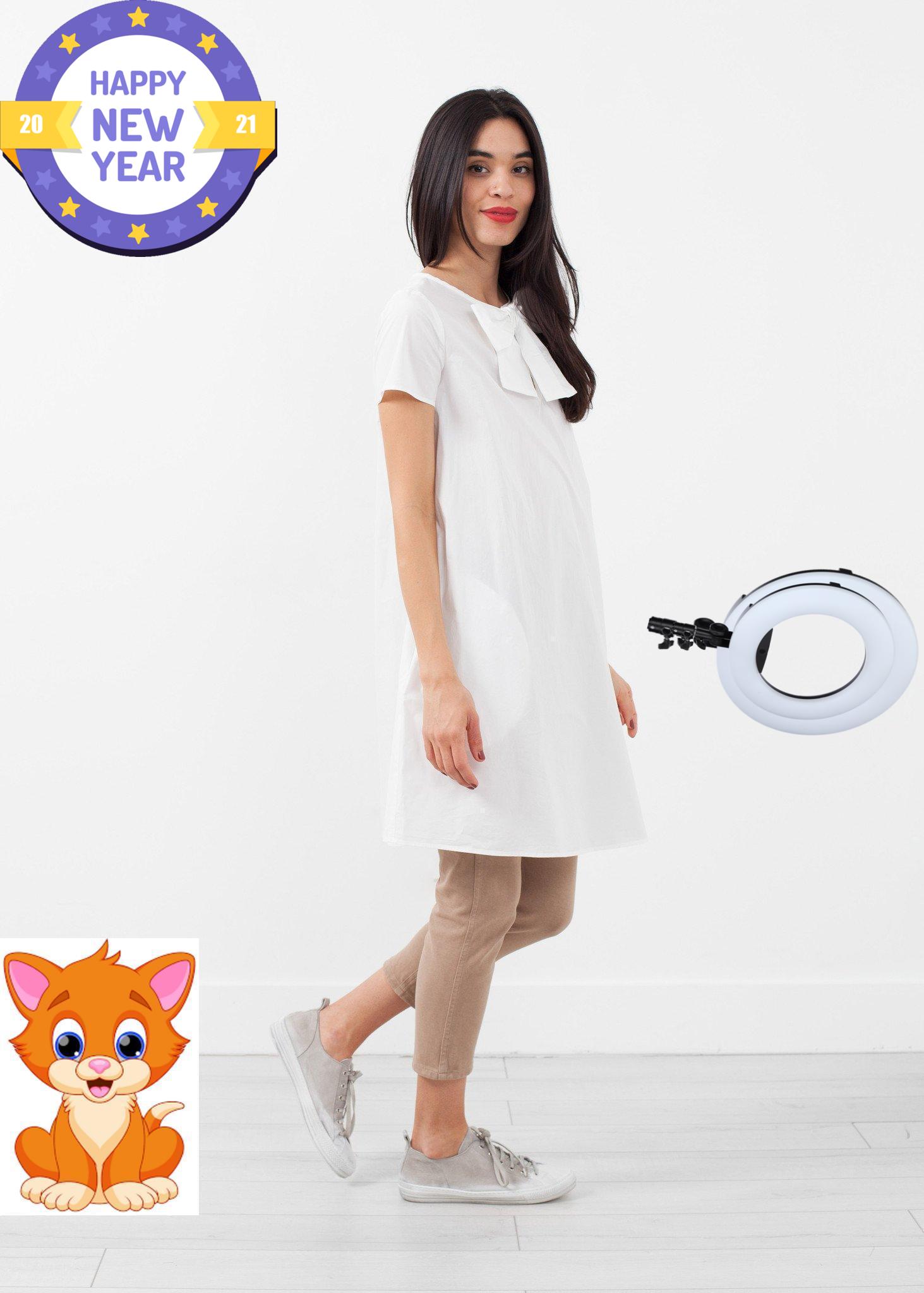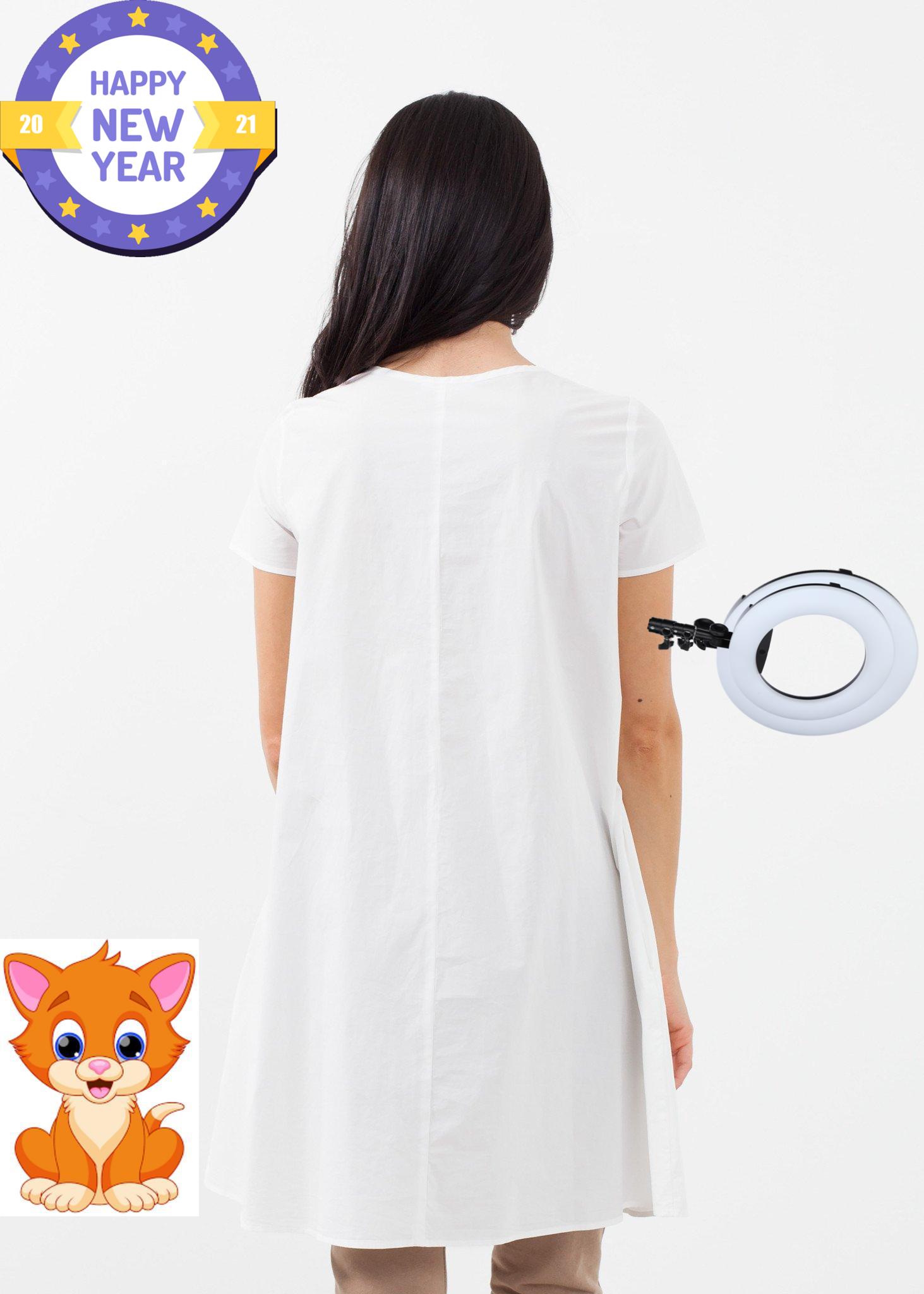 Manuela Arcari, designer of Hache and its sister brand TER ET BANTINE, approaches her second ready-to-wear line with a motive to create "perfect imperfections" within each collection. A myriad of references are blended for an off-center wardrobe. The Babydoll Dress ia delicately sweet for the summer season. Where a darling elegance comes out. Side angled pockets at front. Bow with snap button fastener at opening. Hook and eye closure at front. Color White. 96% Cotton, 4% Elastane. Made in Italy. Ashley is wearing a Size 40.