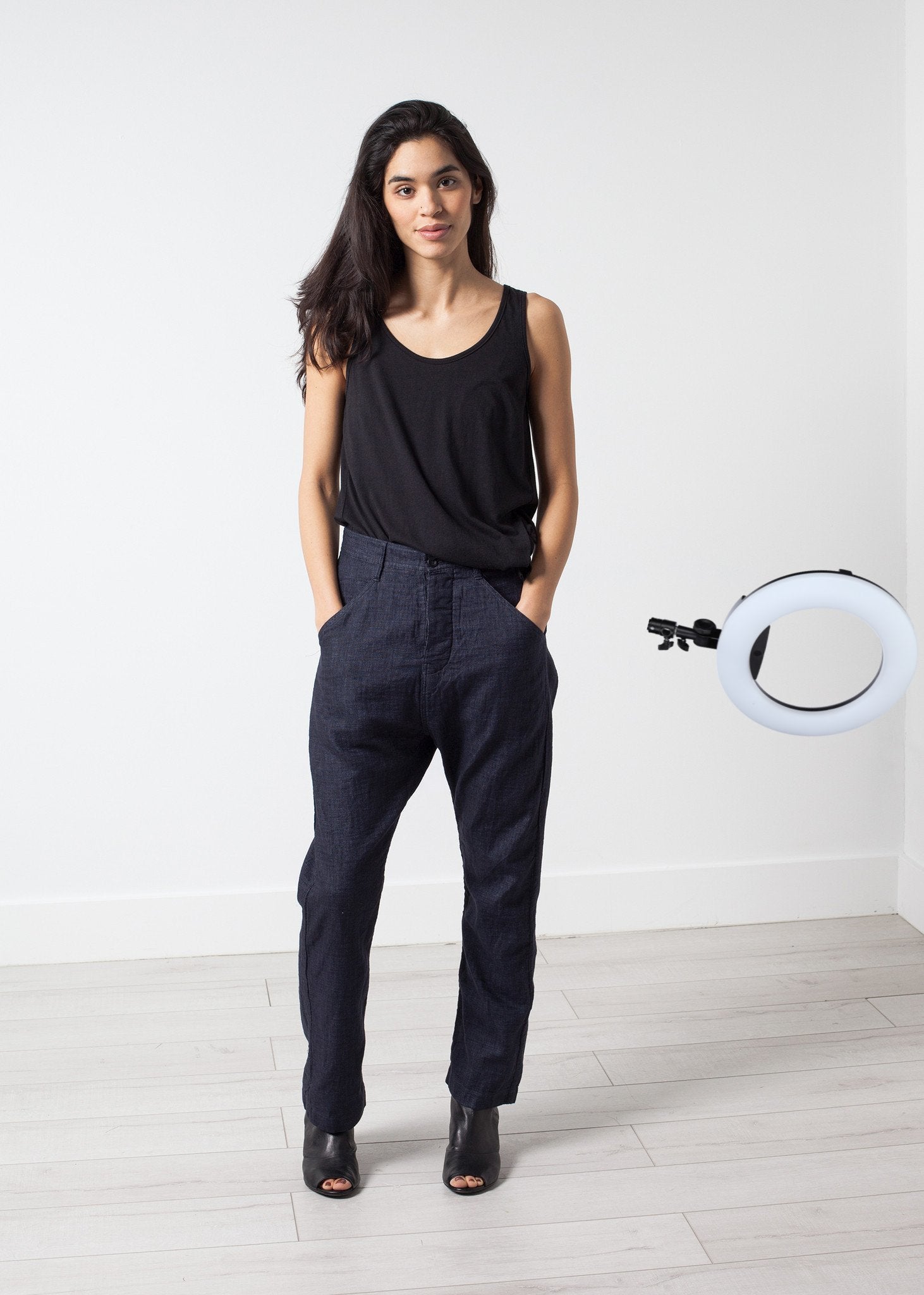 With just enough room to be "oversized," the Balan Pant from Hannes Roether makes functional comfort its priority. Back waist tie for adjustability. Drop crotch. Color Black. 100% Linen. Made in the EU. Ashley is wearing an X Small.