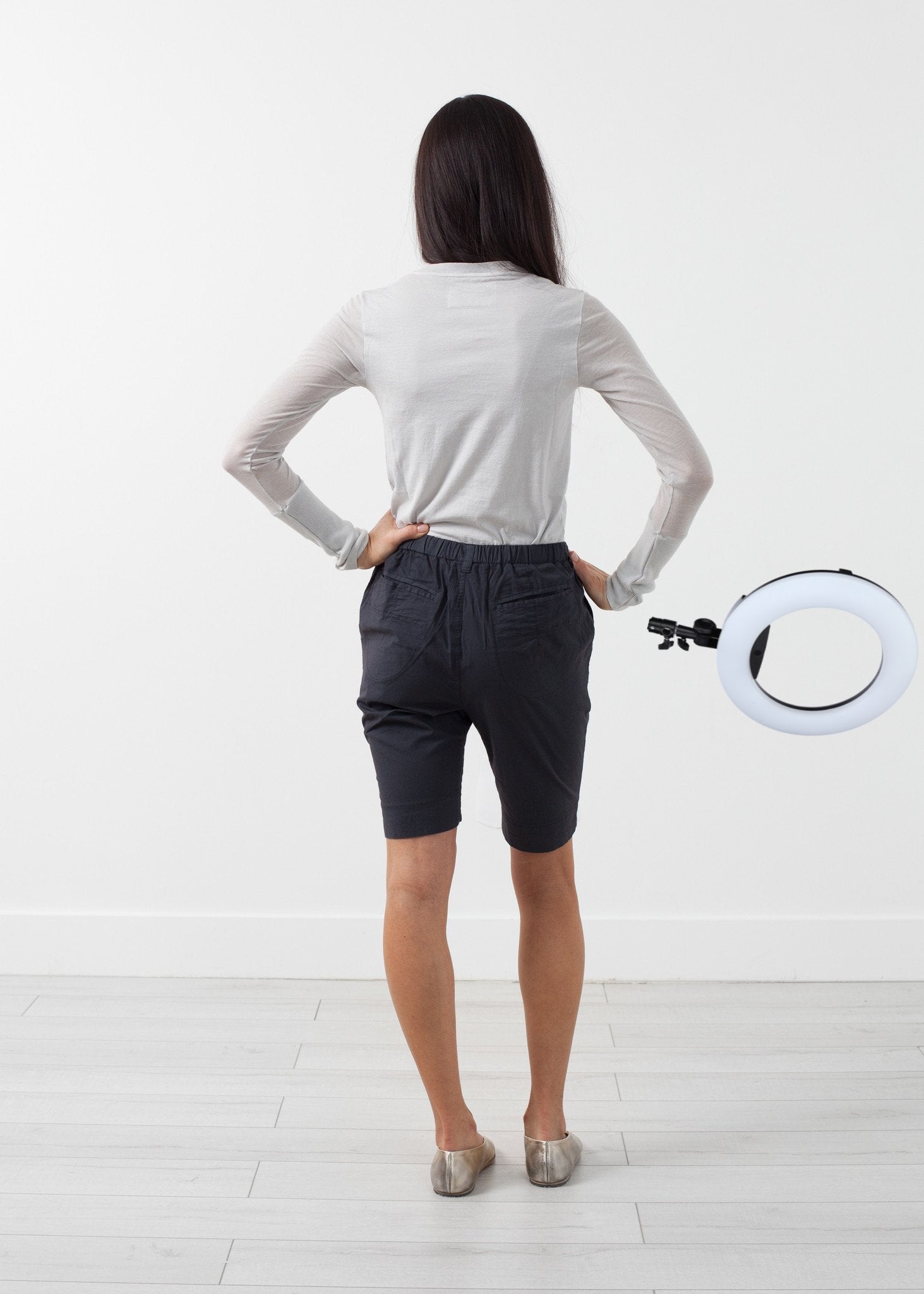 The Basic Short by Kristensen du Nord presents a flattering length silhouette to women's frame. Side angled pockets at front, two pockets at back. Elastic waistband for easy fit. Color Castel Rock. 96% Cotton, 4% Elastane. Made in Italy. Ashley is wearing a Size 1.