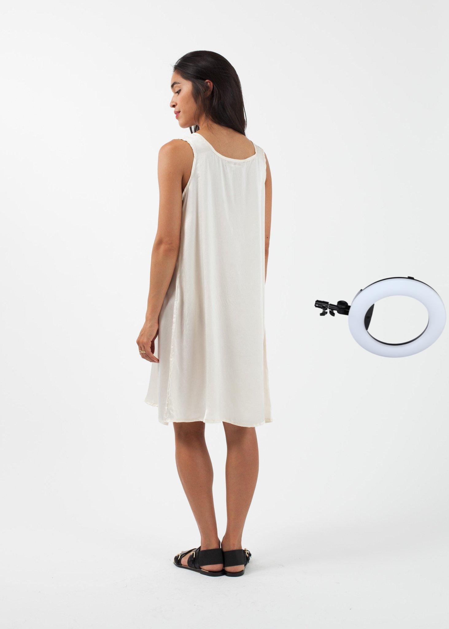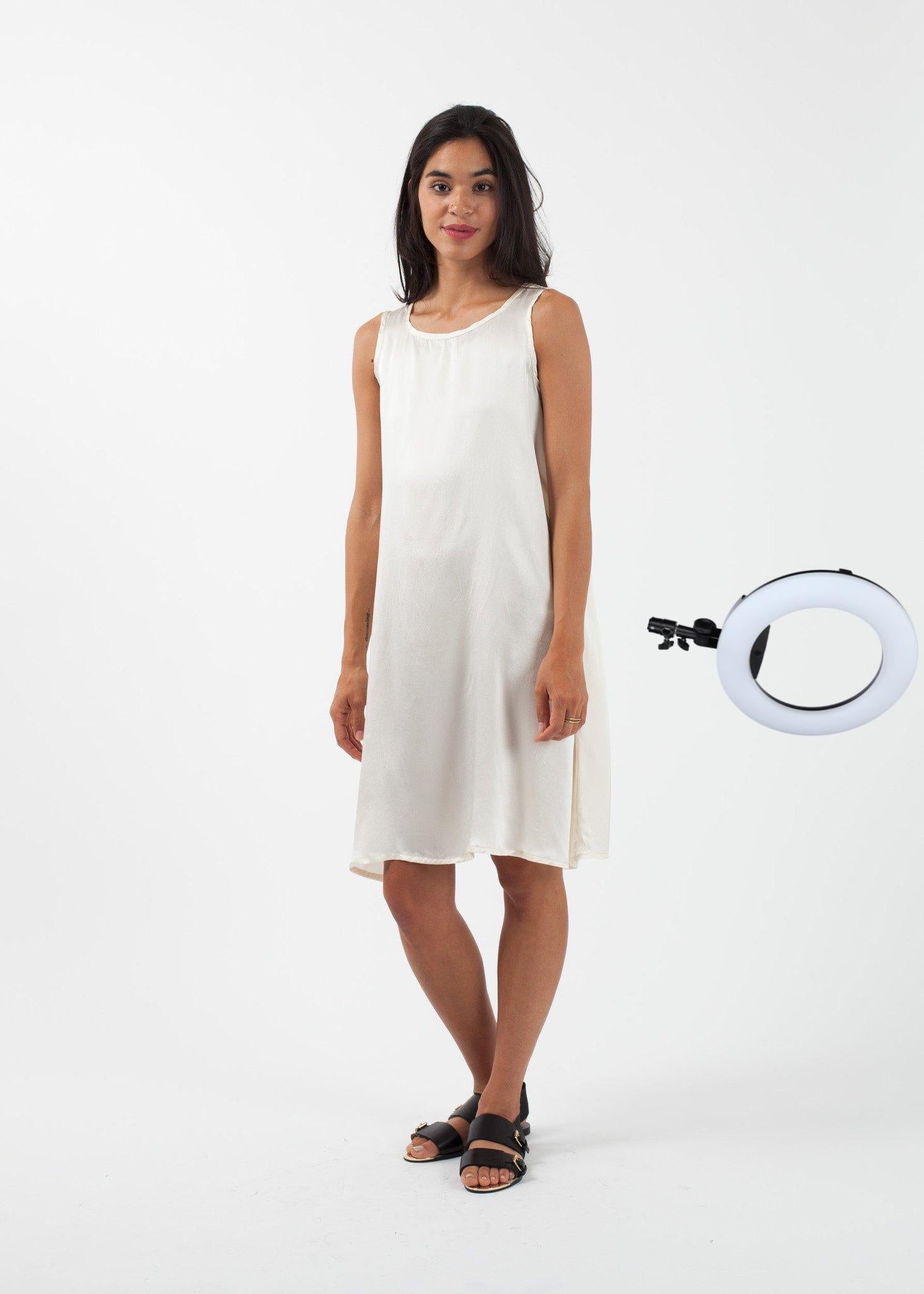 The Bell Dress from Pip-Squeak Chapeau is beauty embodied. An open neckline paired with an unfussy silhouette makes dressing easy. Tea length. Color Cream. 100% Silk. Made in U.S.A. Ashley is wearing a Small.