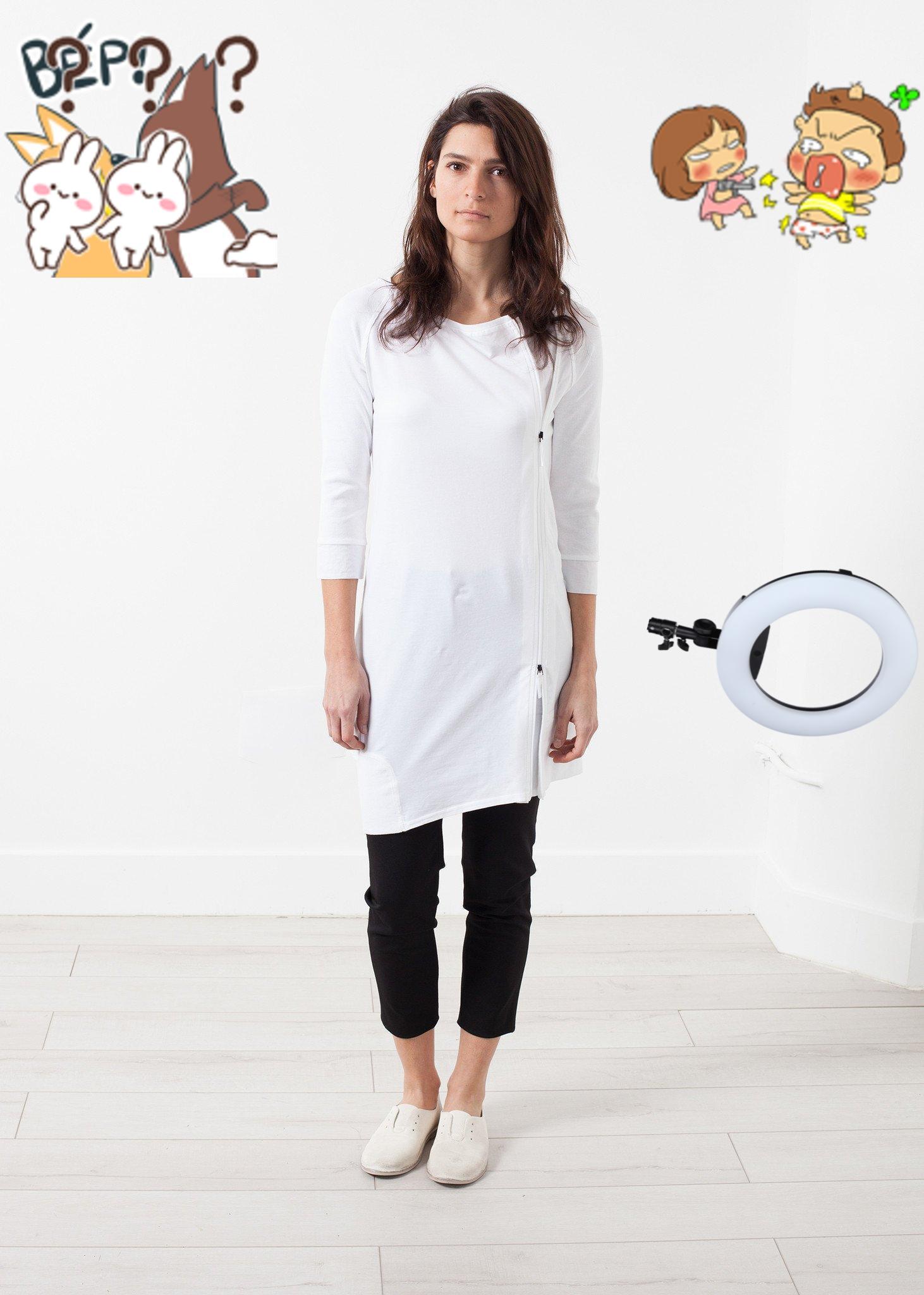 The Berry by Annette Gortz is part tunic, part knit top. 3/4 inch sleeves. Boat neckline. Side double zip at left front. Color Off-White. 92% Cotton, 8% Spandex, Trim 100% Cotton. Made in Germany. Lana is wearing a Small. Lana is 5'7, hips 36.5", waist 25", bust 34.5".