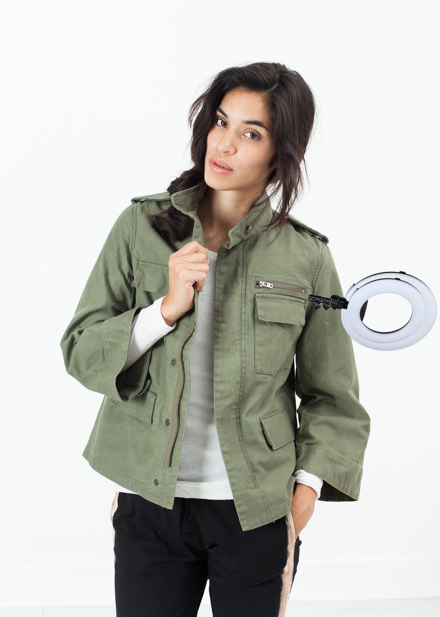 A woman's field jacket, complete with generous three-quarter-length sleeves and breast pockets not handy in women's military jackets. We are lucky to have found the civilian version from AR SRPLS, the Japanese brand has included a stow-away nylon hood and gathers at back for a slightly boxy fit. Color Olive. 100% Cotton. Ashley is wearing a size 0.
