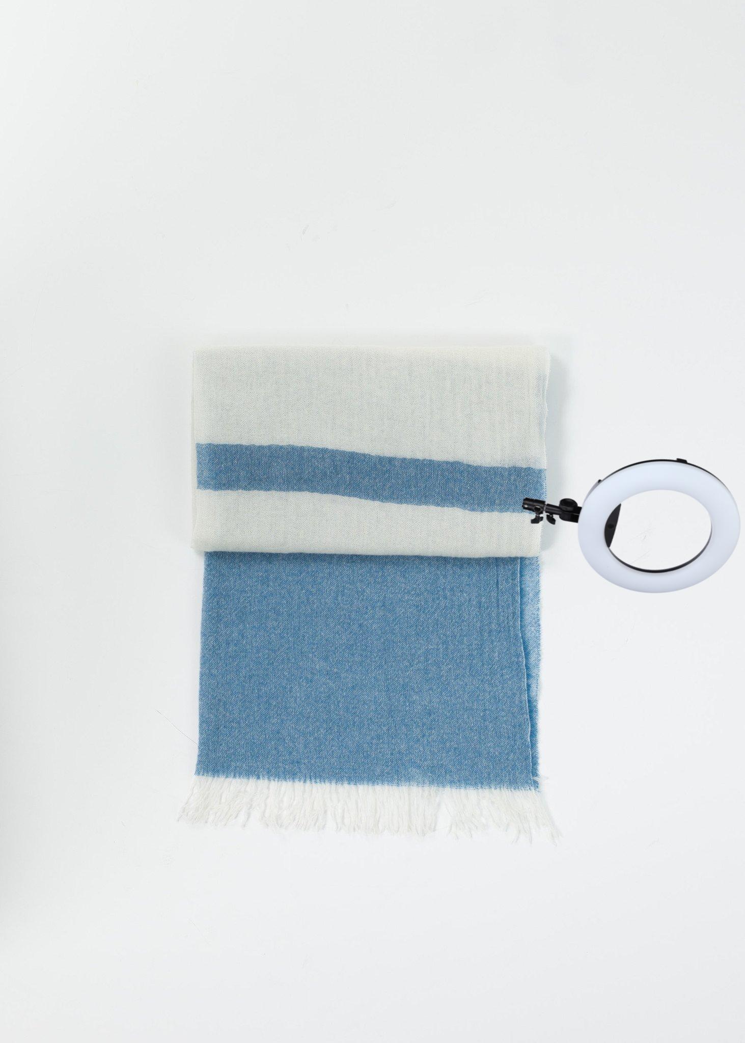 Color blocking at its best hues. Fringe accents. Color Blue. 100% Cashmere. Made in Italy. Length 68 X 26".