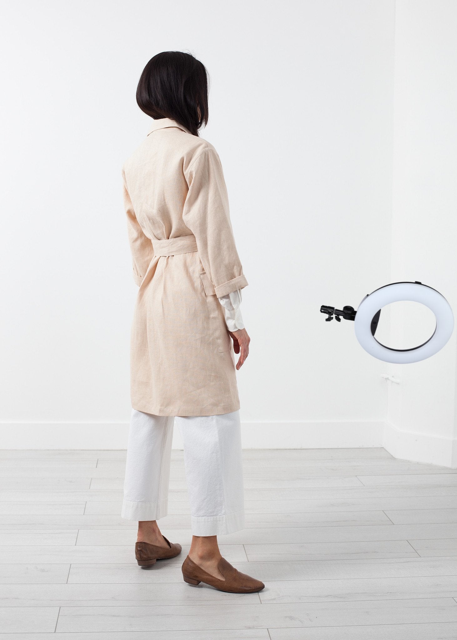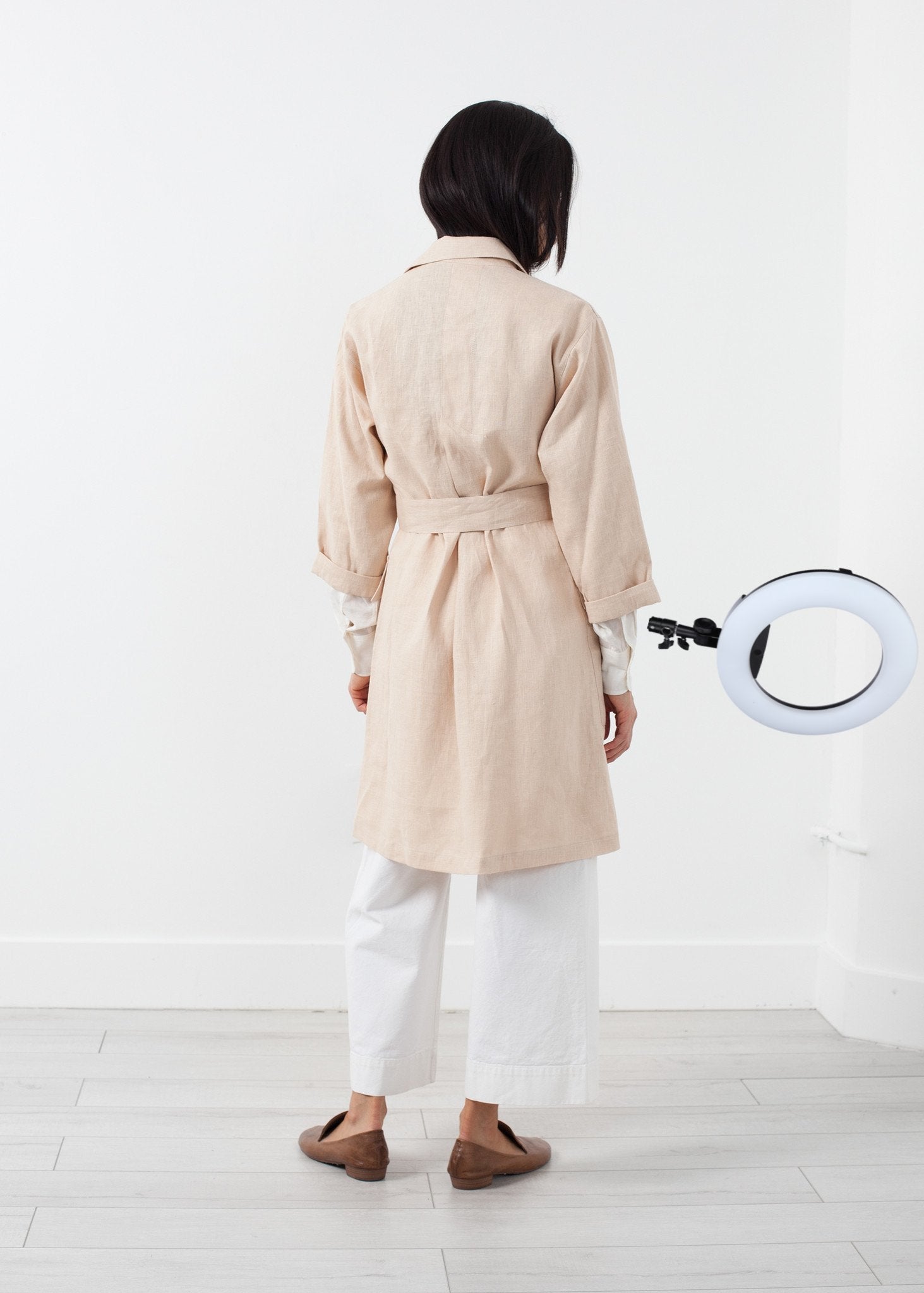 The Box Trench from Jesse Kamm is fantastically oversized while incredibly chic. Matching tie belt. Bucket pockets at side. Color Oyster. 100% Linen. Made in U.S.A.