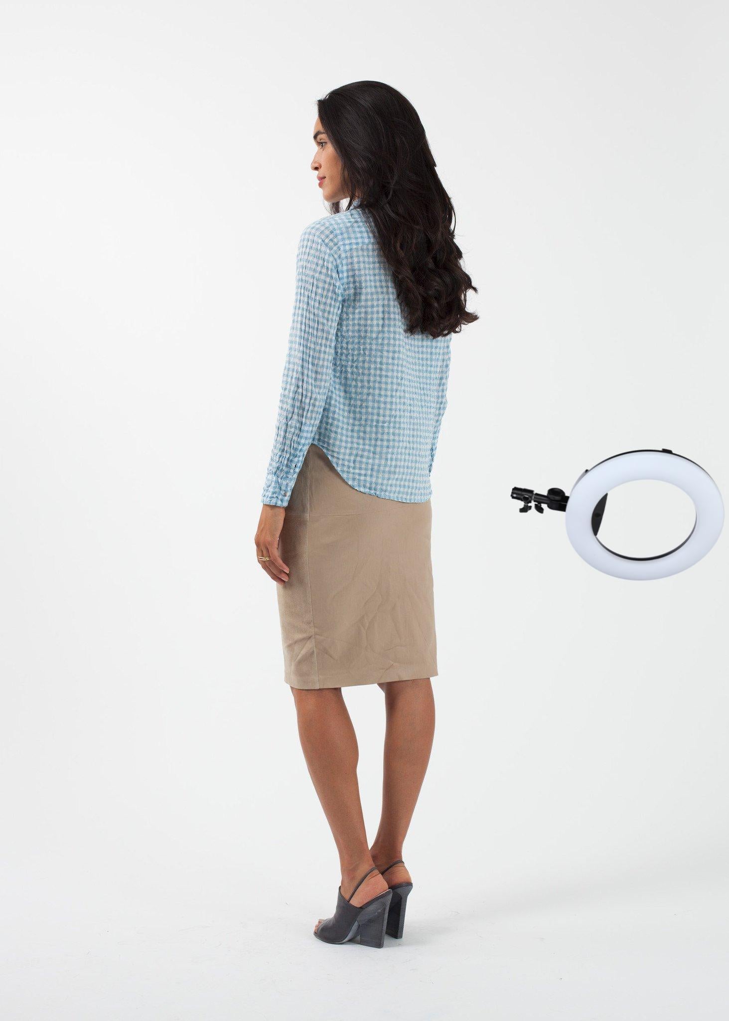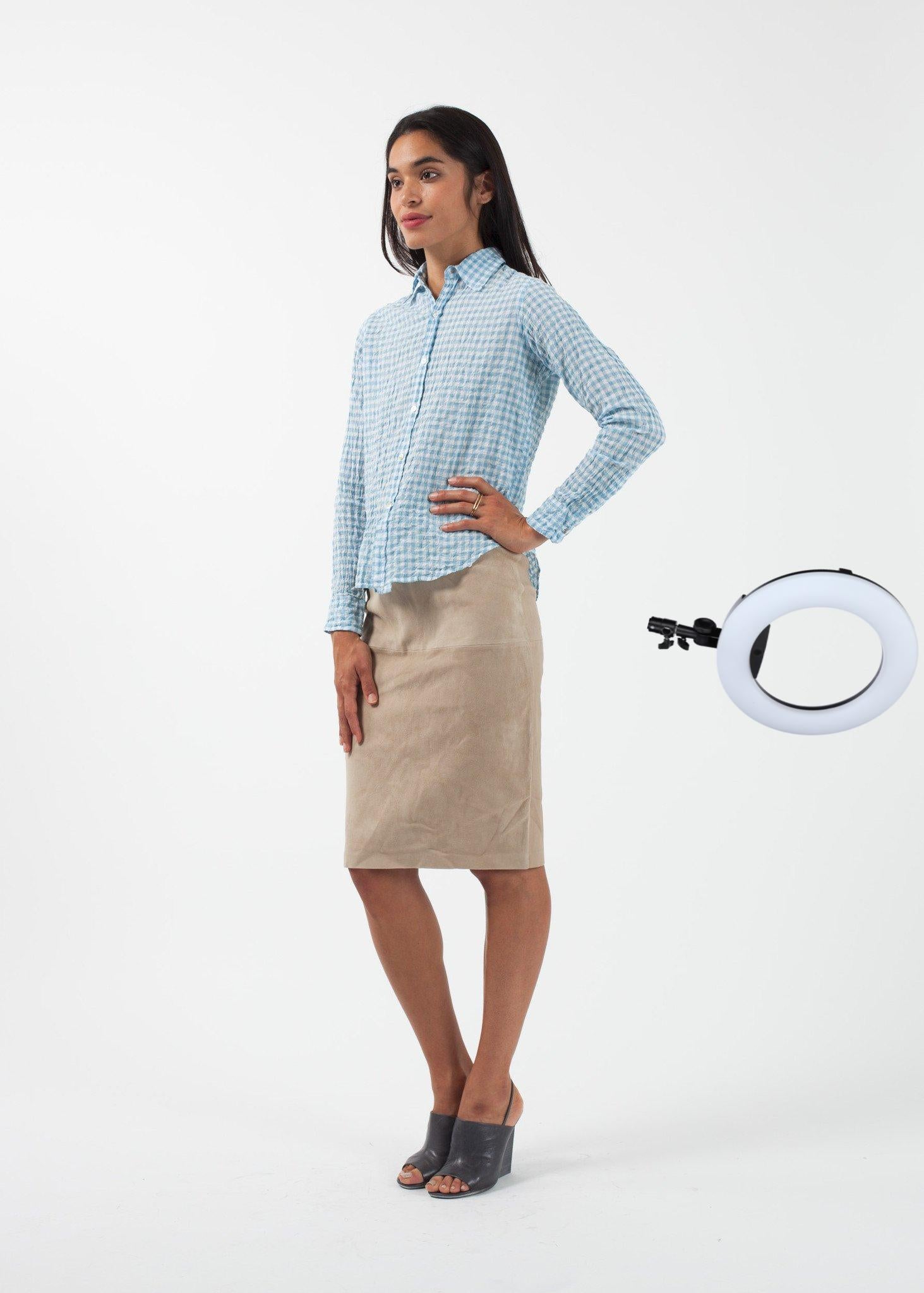 Gingham print for a picnicking ambiance. The Boy Shirt is an intentionally wrinkled piece, ideal for everyday activities. Button placket closure at front. Pip-Squeak Chapeau. 100% Cotton. Made in U.S.A. Ashley is wearing an X-Small.