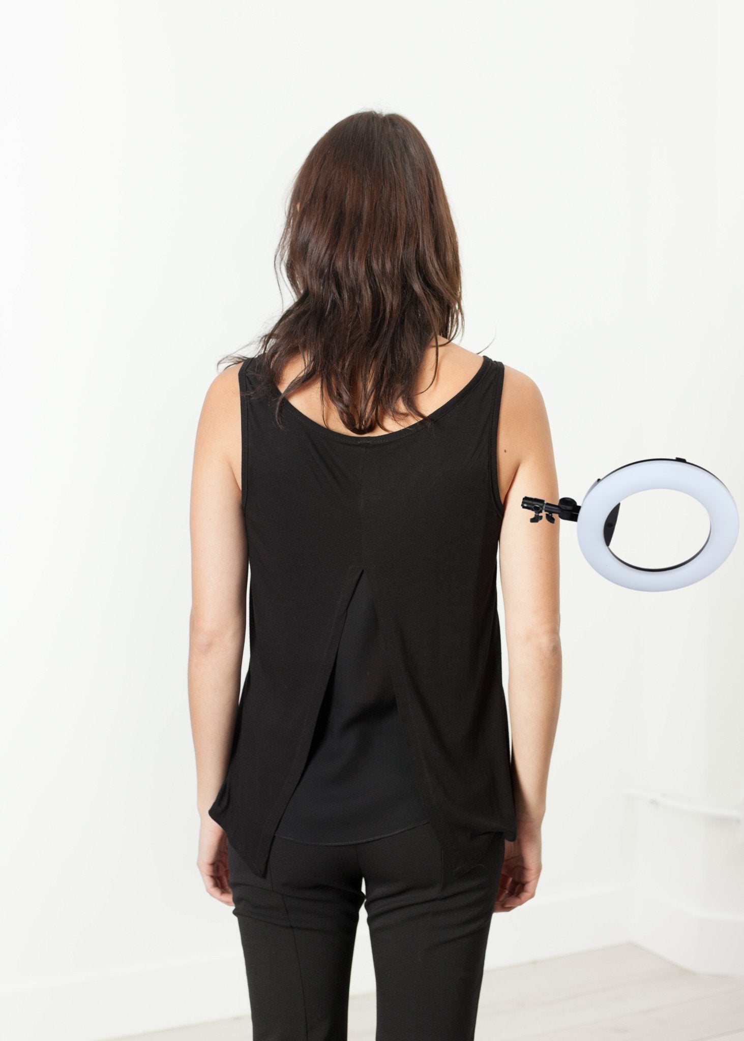 Drifter's fluid tops are our foundation pieces and as basics they are anything but. This natural fit top offers an open back slit for subtle sexy. Color Black. 100% Micro Modal. Made in U.S.A. Lana is wearing a size Medium.