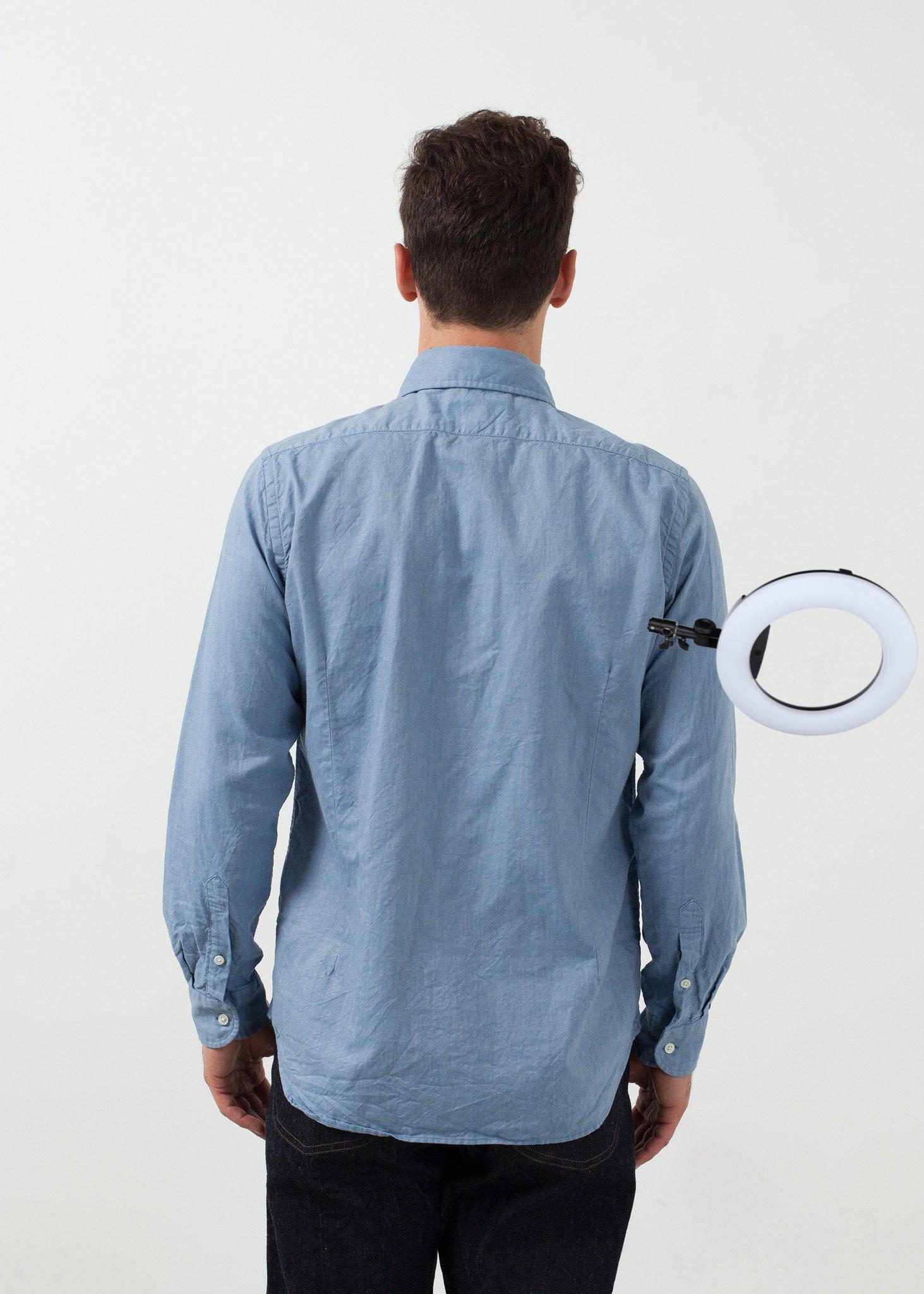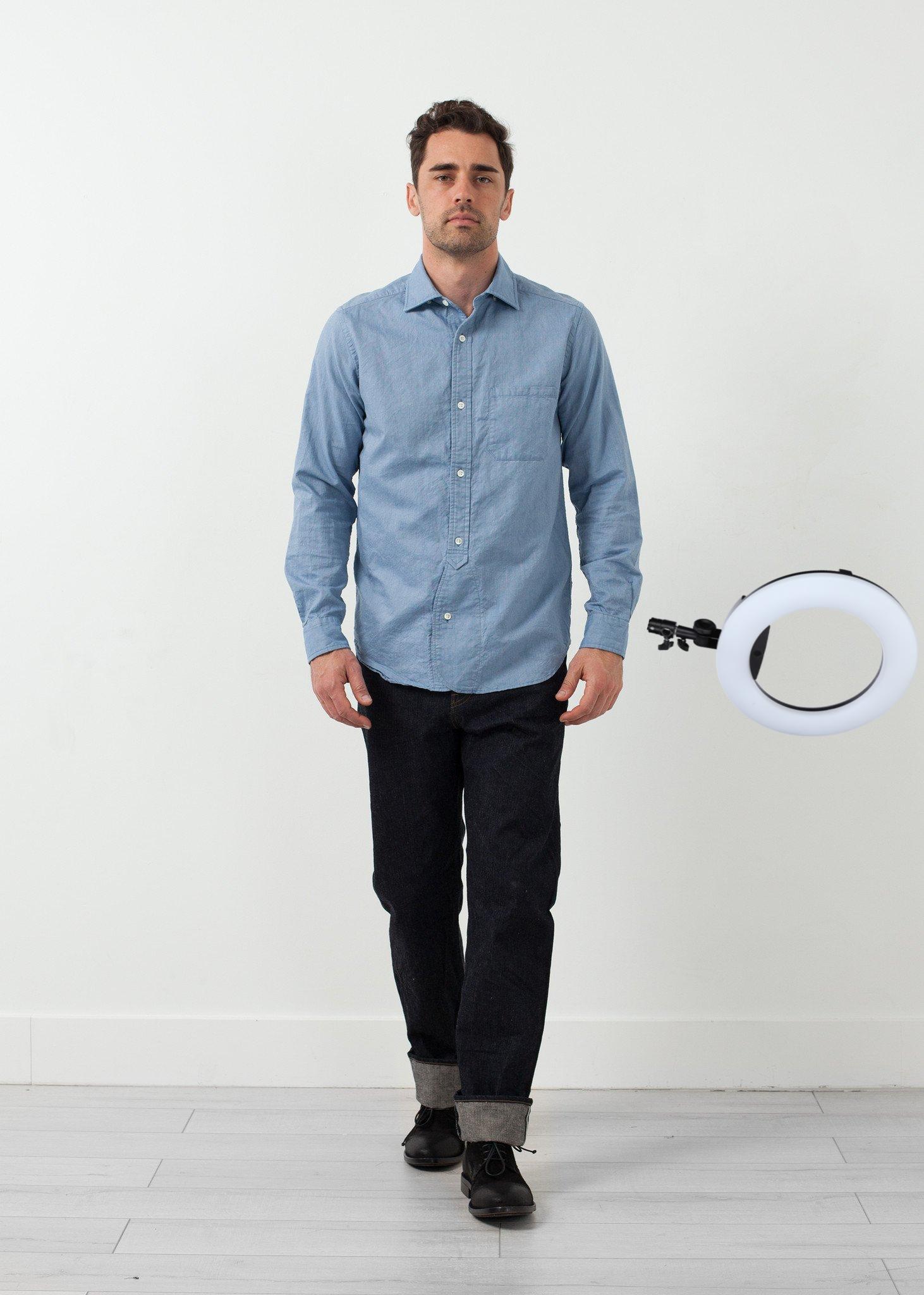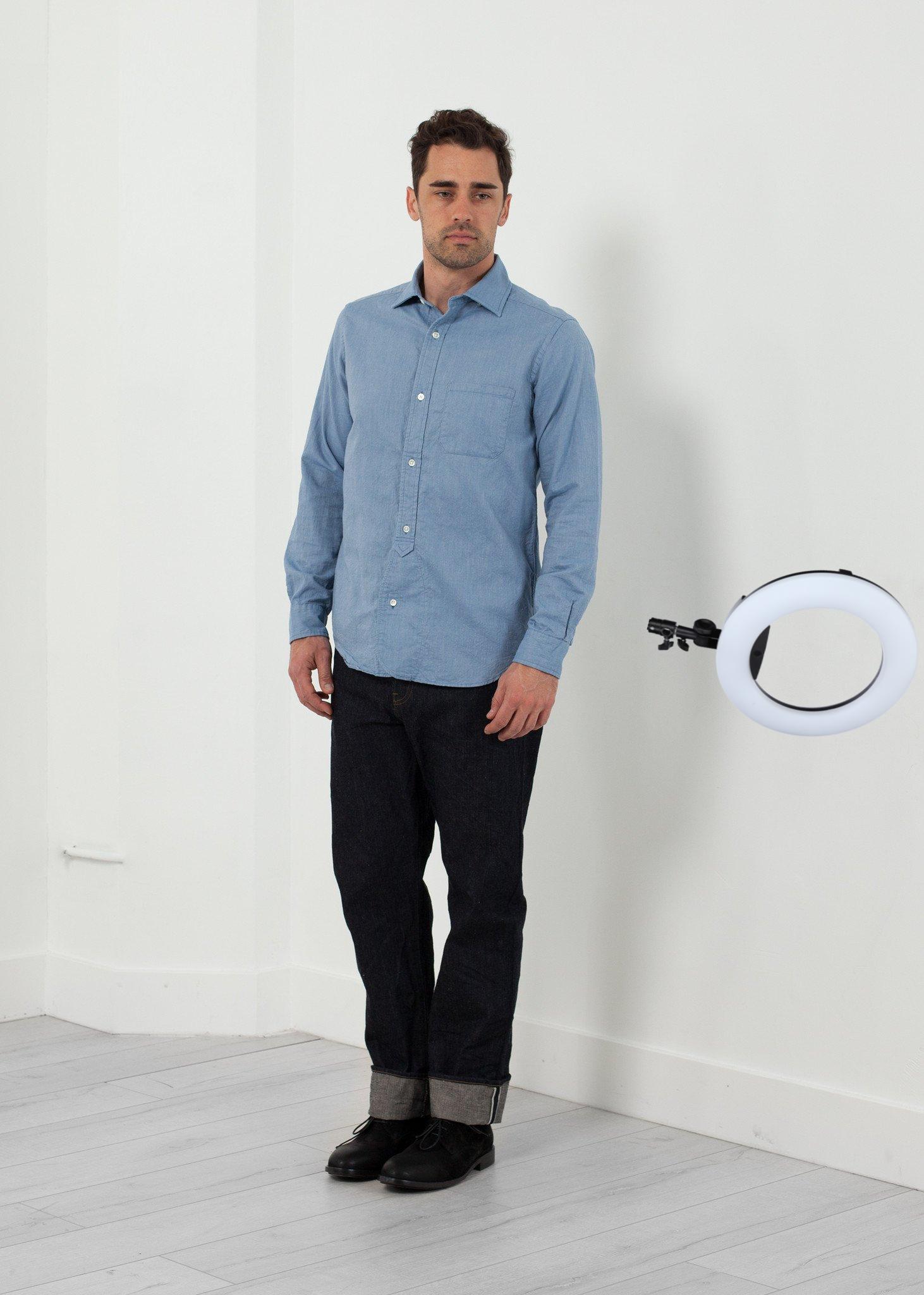 Inspired by working class uniforms of the industrial revolution, with accentuations of British military repurposing, Nigel Cabourn has been labeled a "cult" designer for his misfit aesthetic. Heirloom apparel is its core, the 2015 collection embraces his essence ever more. The British Officer's Shirt is that heirloom piece you'll wear again, and again. Button placket closure at front. Color Sky. 100% Cotton. Made in Japan. Jacob is wearing a Size 50.