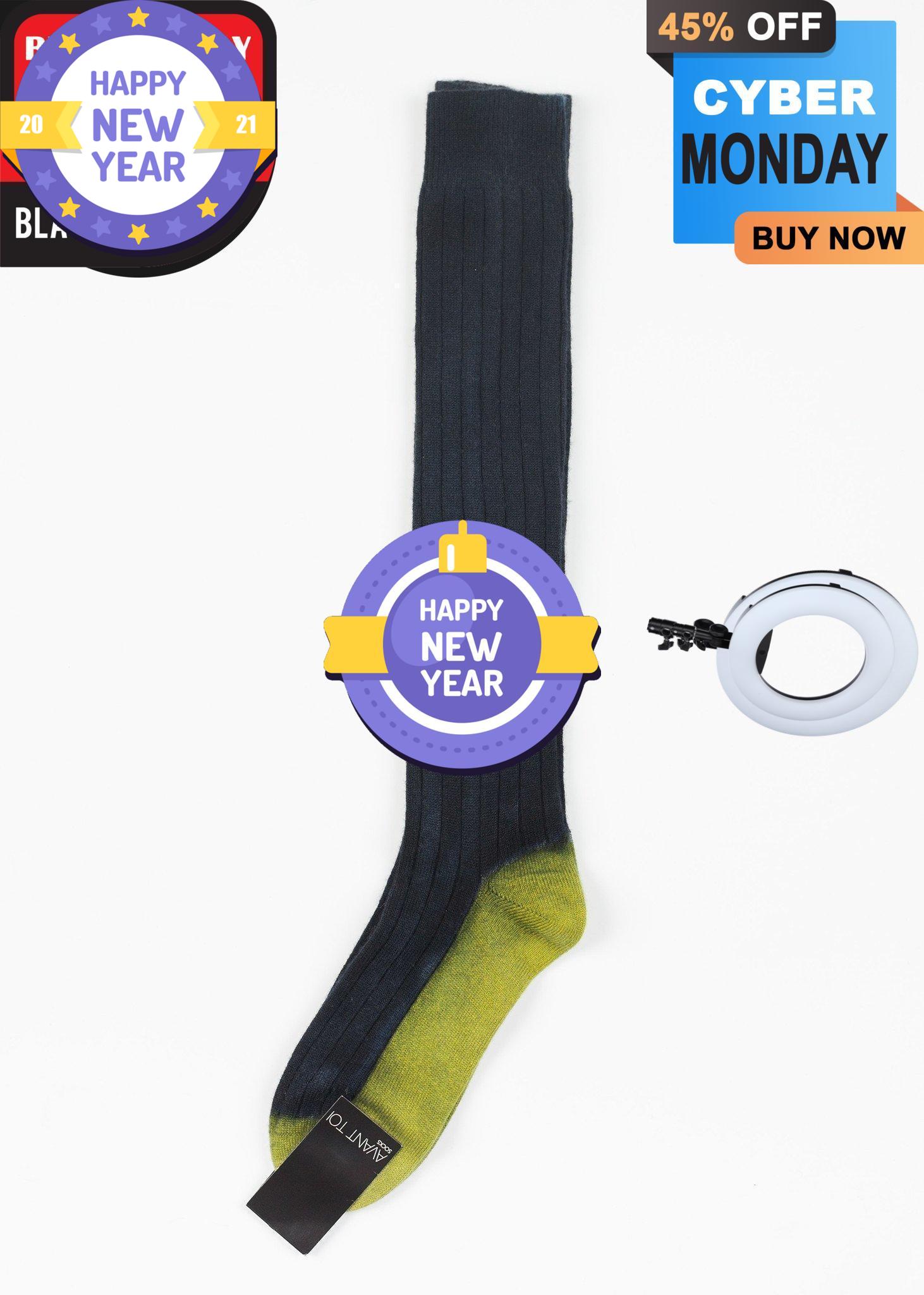 Color blocking rib knit cashmere socks. Lightweight and extremely indulgent with exposed seams at heel. Color Blue. 100% Cashmere. Made in Italy. One Size.
